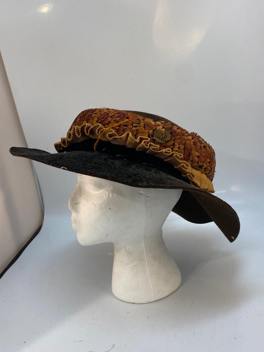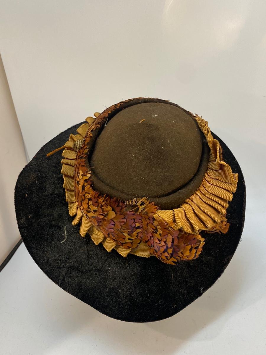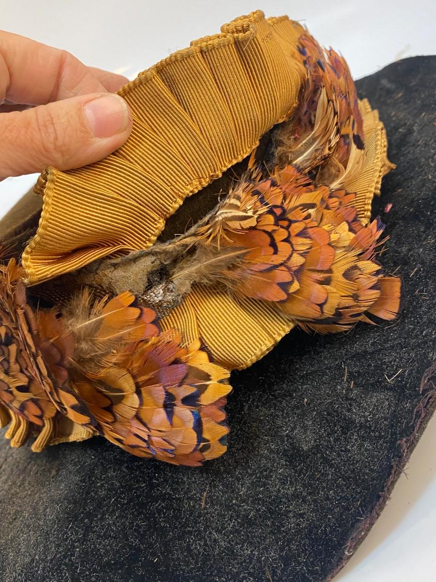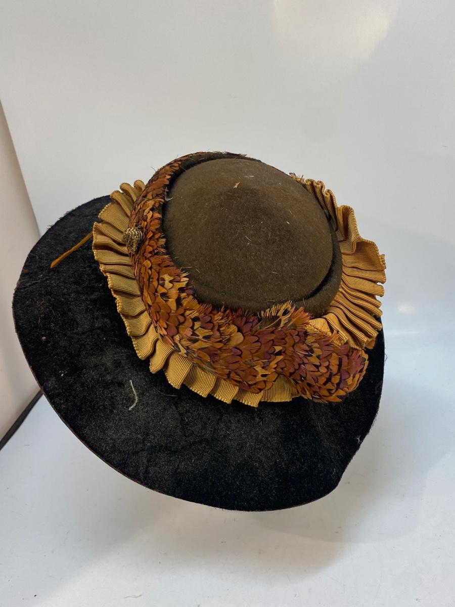 Vintage Black Wool Wide Brim Hat with Ribbon and Pheasant Feathers