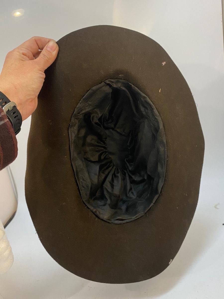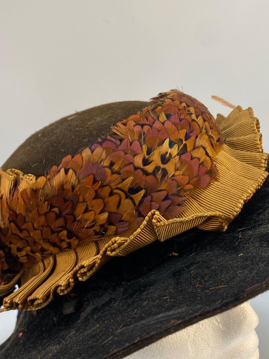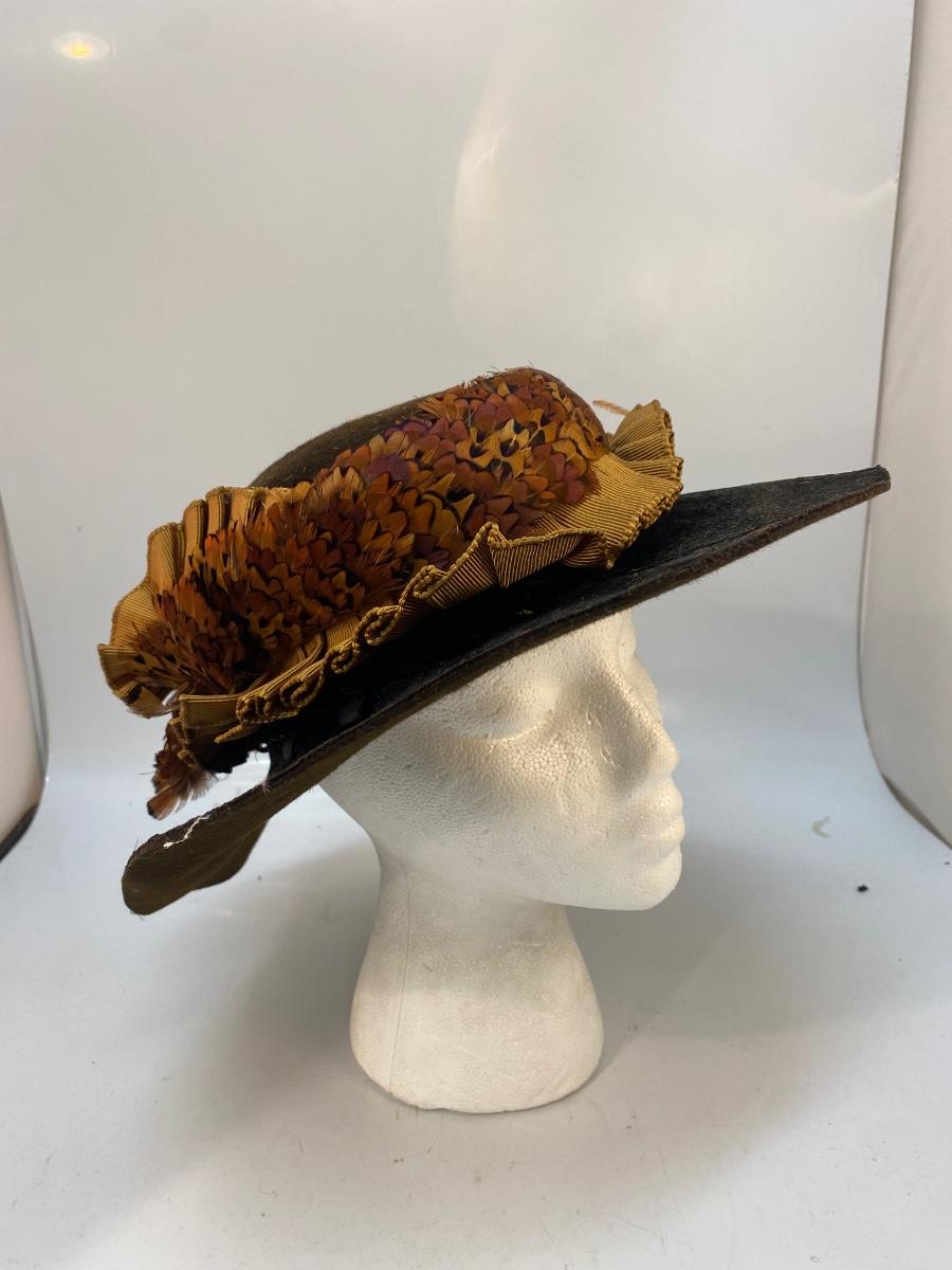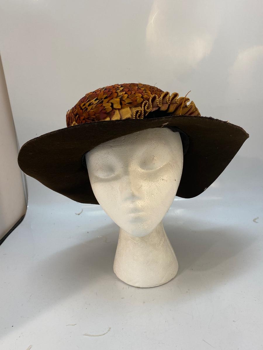 Vintage Black Wool Wide Brim Hat with Ribbon and Pheasant Feathers. In good vintage condition. Some light discolor to the wool from age and wear. Feathers have lifted in spots, need to be glued back into place a little. No maker label.