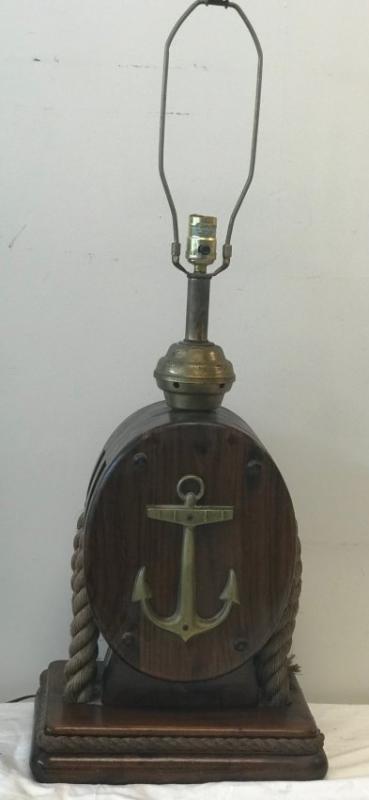 Description: Block and tackle pulley lamp with anchor design. Material: Wood and rope.Measurement approximate: 34.5 H X 12 W x 10 D. Shipping Charges $55 except to Alaska,Hawaii & California.
