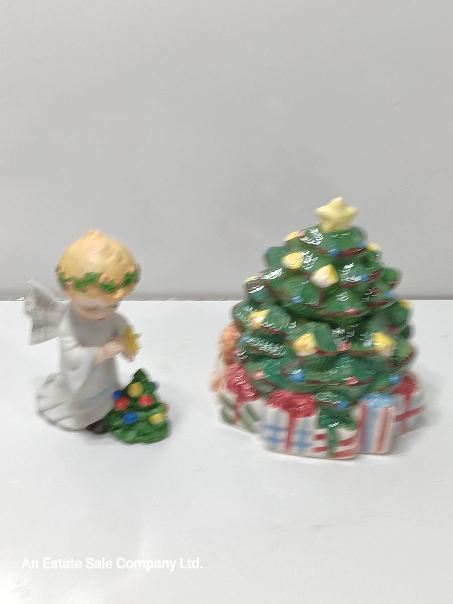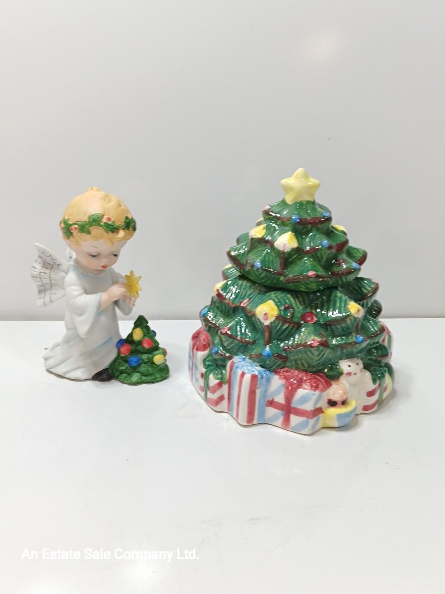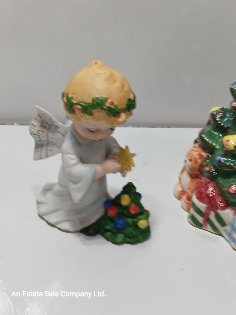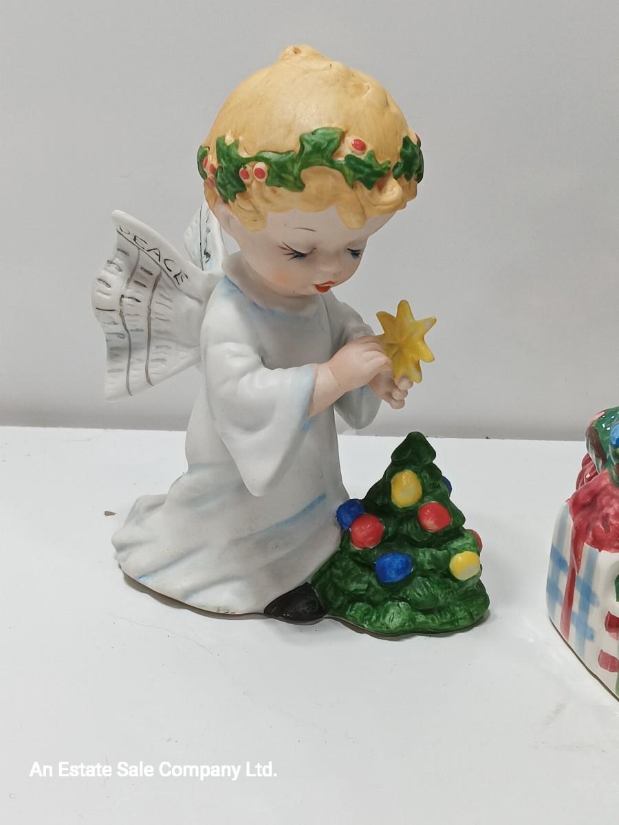Vintage blonde angel putting star on Christmas tree figurine with tree canister.