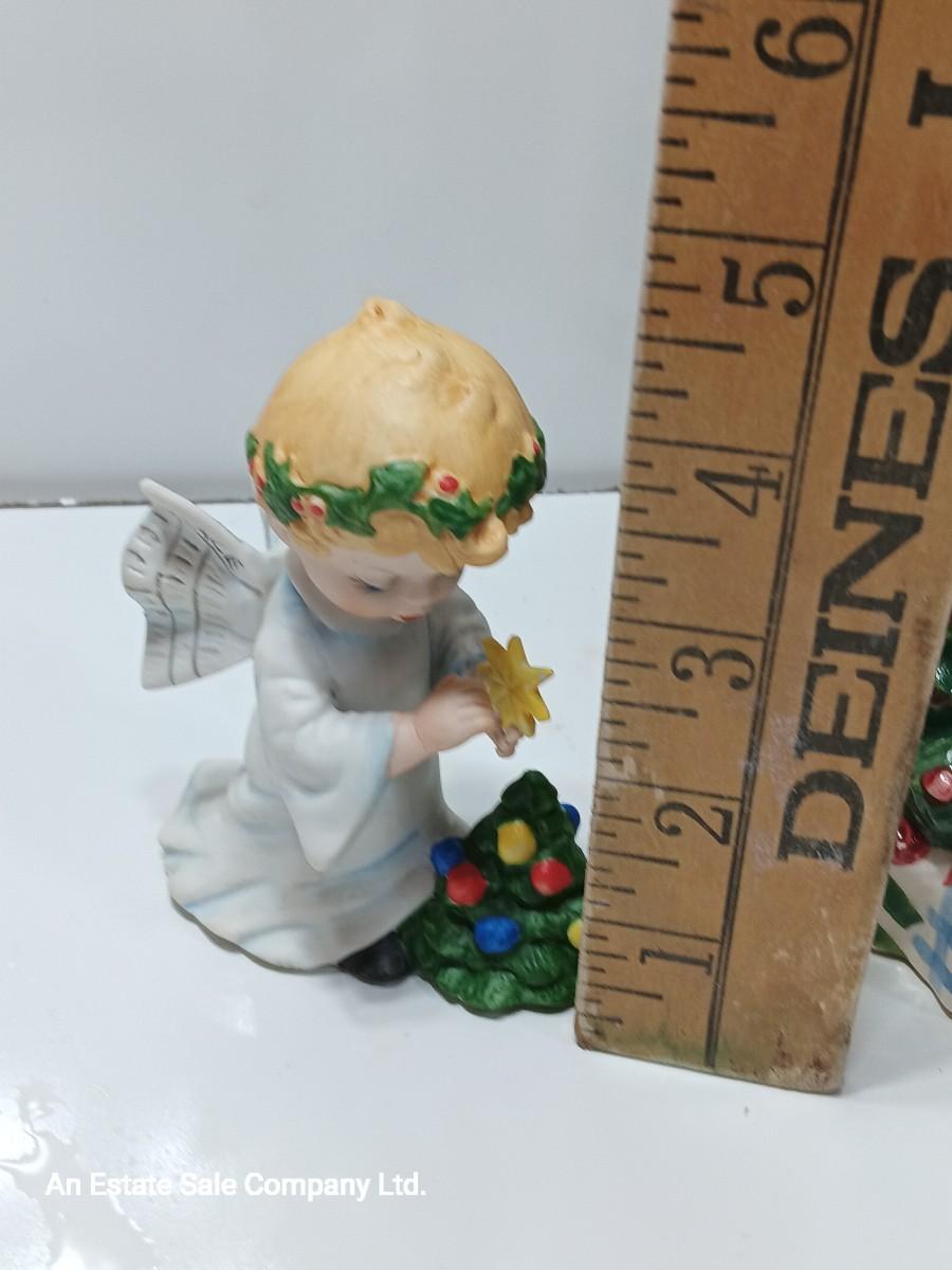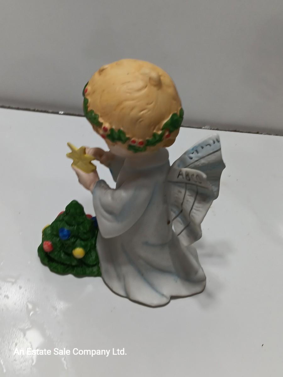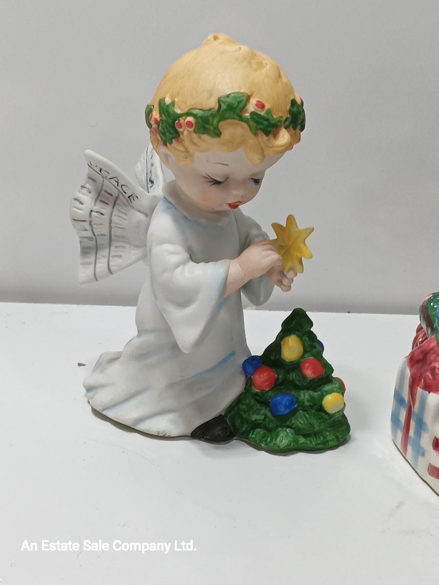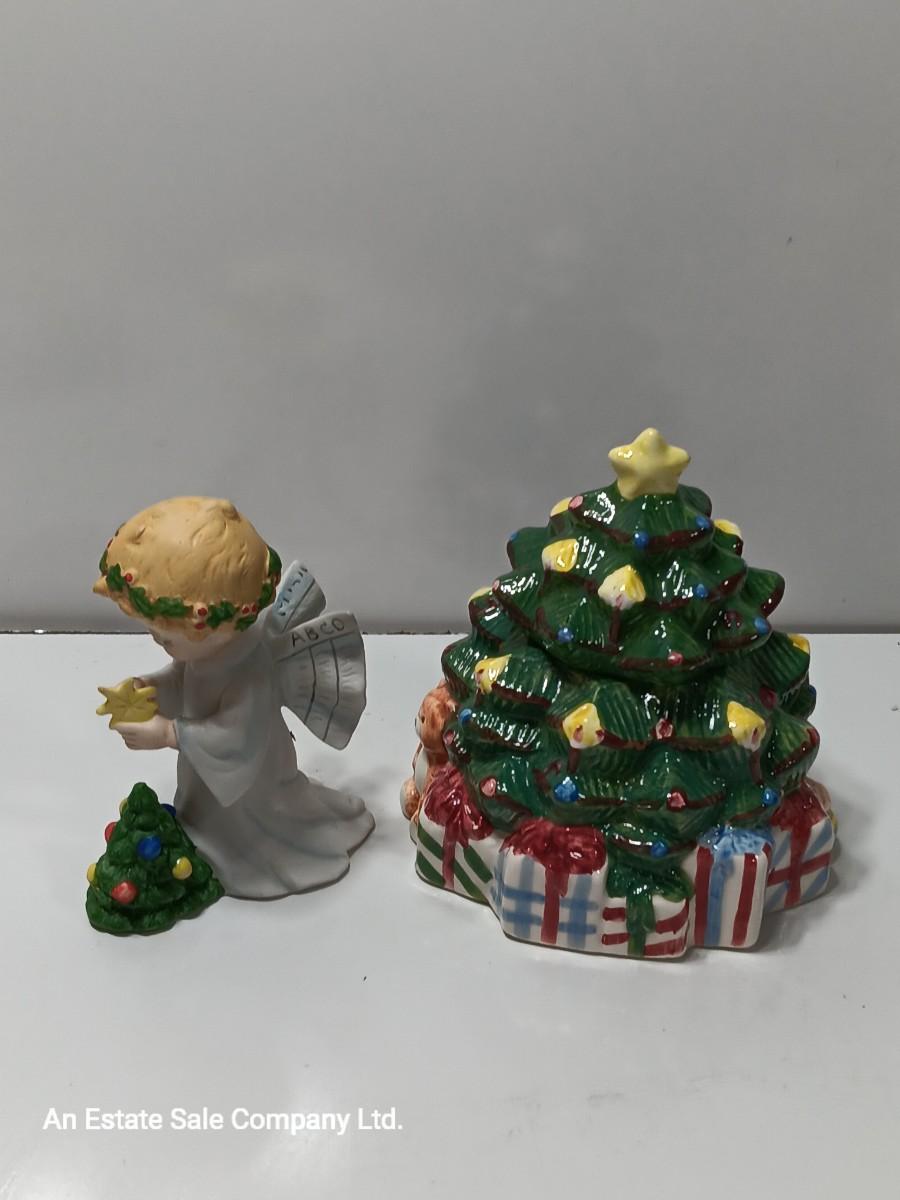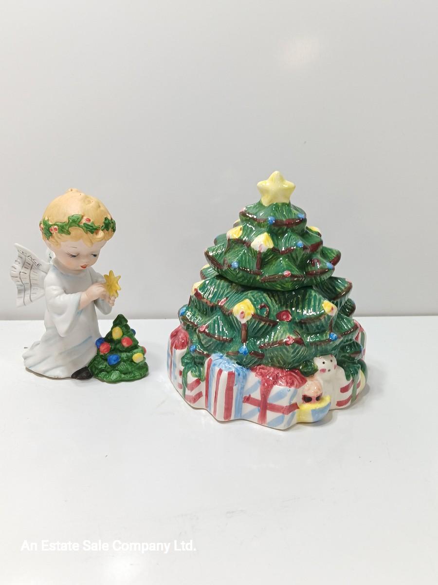 Vintage blonde angel putting star on Christmas tree figurine with tree canister.