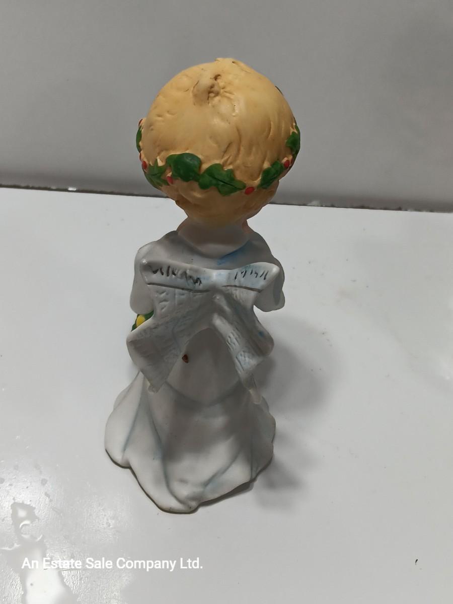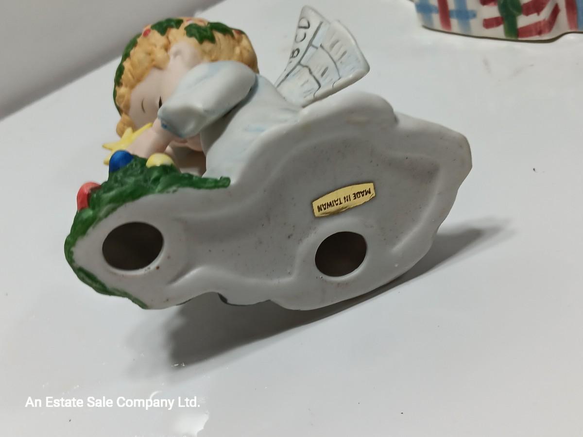 Vintage blonde angel putting star on Christmas tree figurine with tree canister