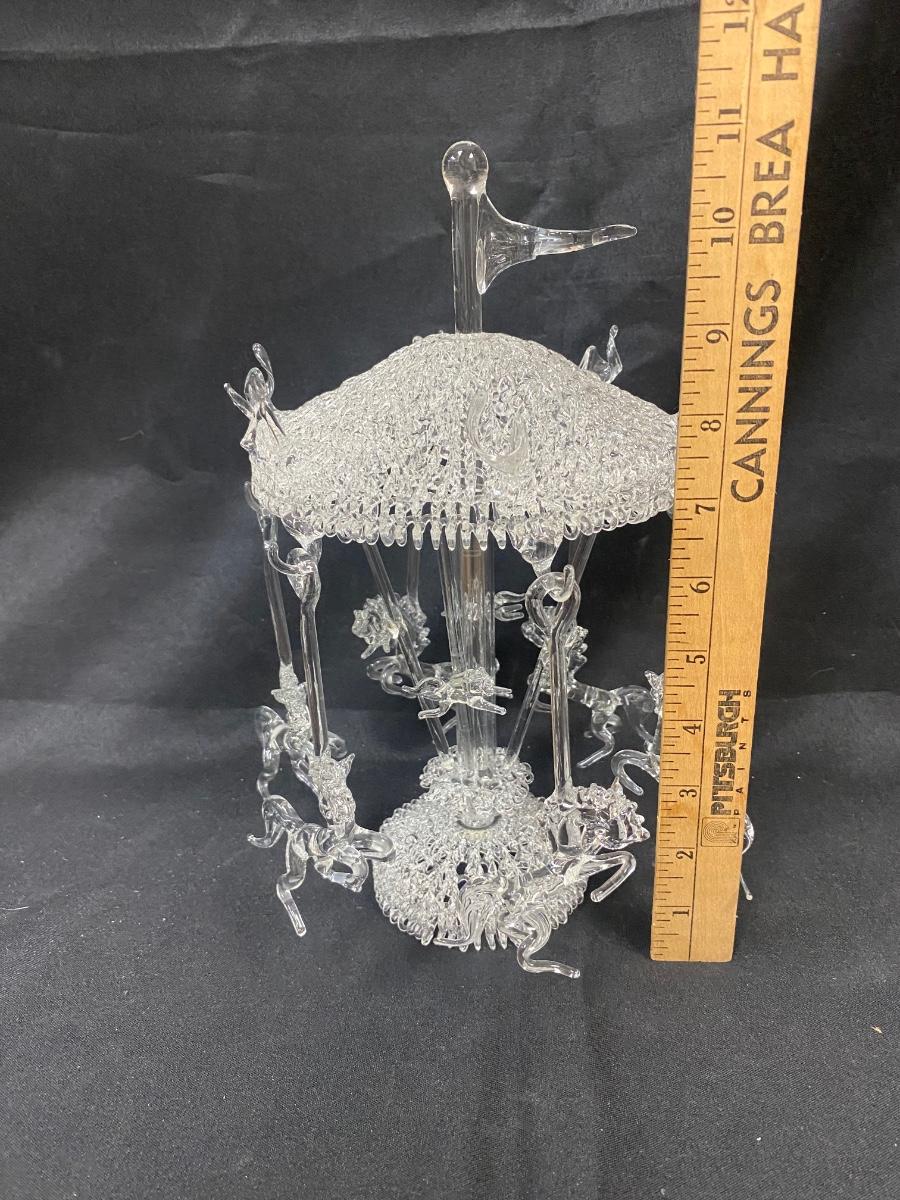 Vintage Blown Spun Glass Horse Carousel Figurine. In good condition, no damage noticed. Multiple pieces, made to spin. Horses can be removed for cleaning. Almost 12" size.