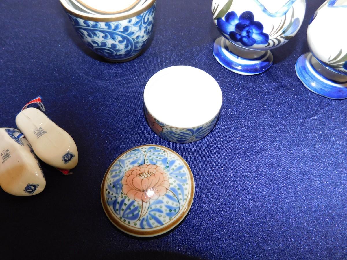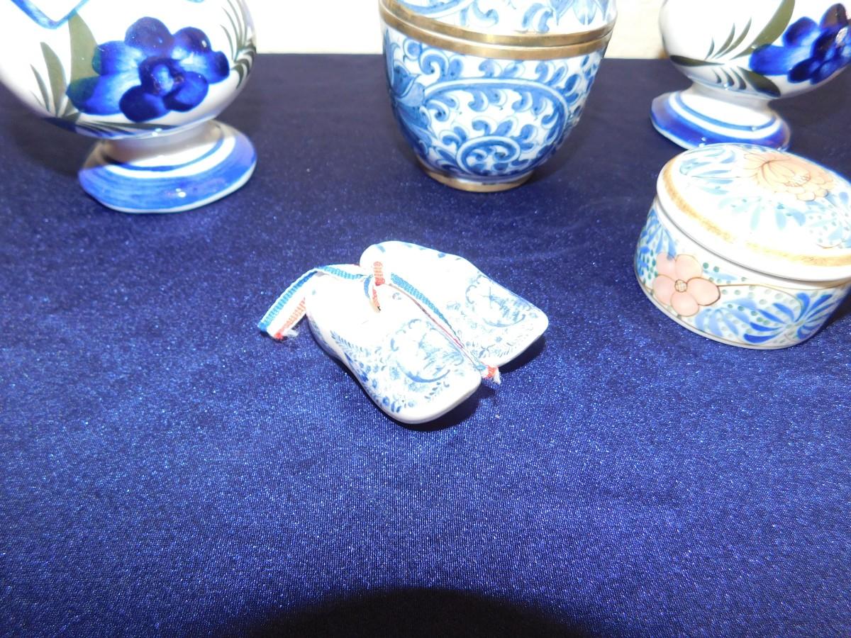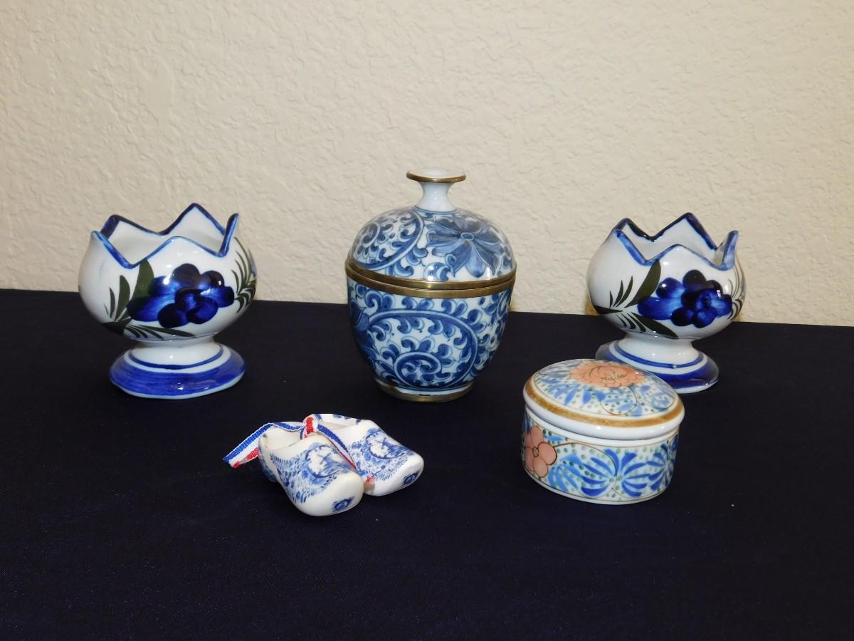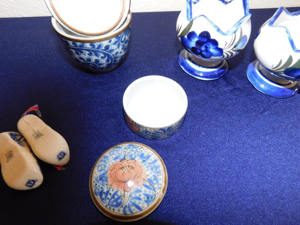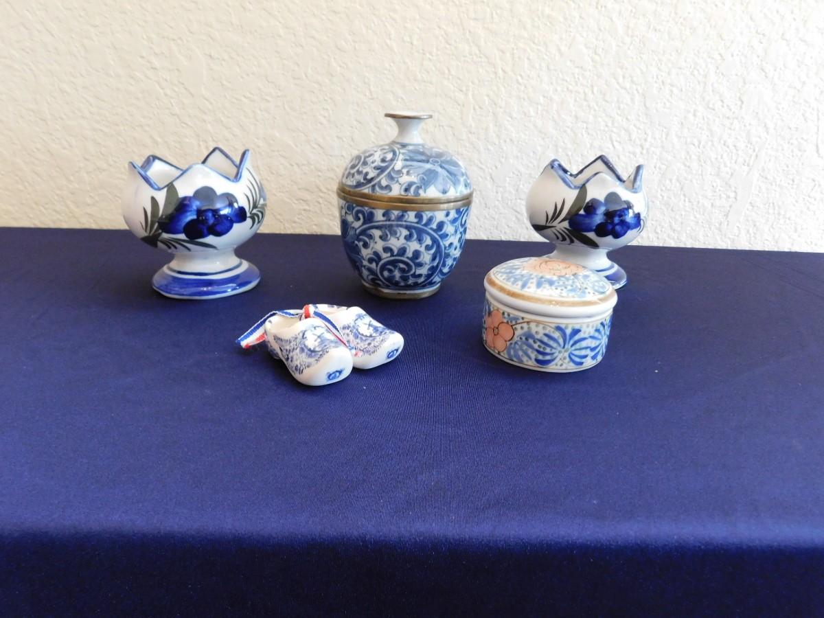 VINTAGE BLUE AND WHITE TRINKET BOXES, CANDLE HOLDERS AND LITTLE SHOES