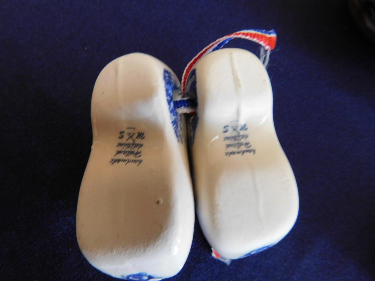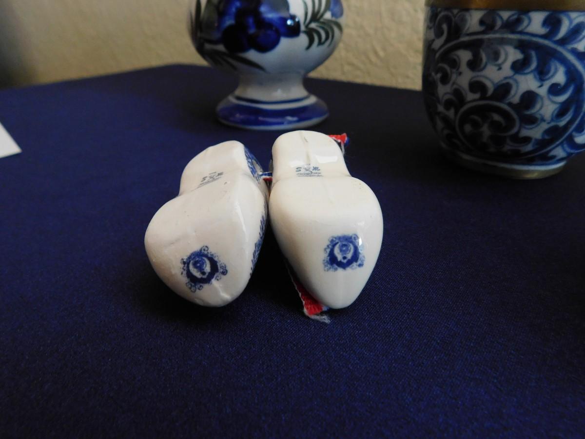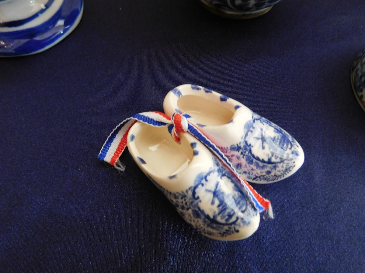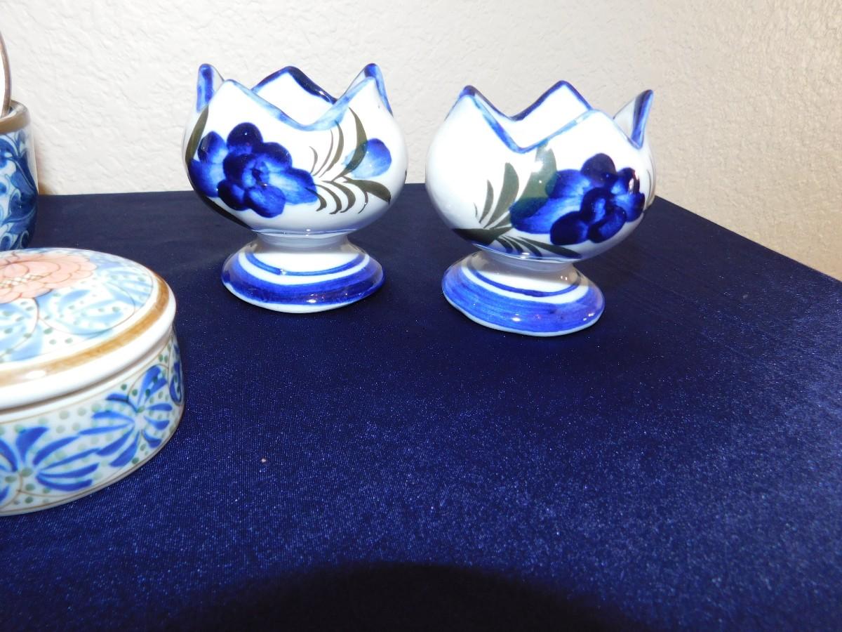 VINTAGE BLUE AND WHITE TRINKET BOXES, CANDLE HOLDERS AND LITTLE SHOES