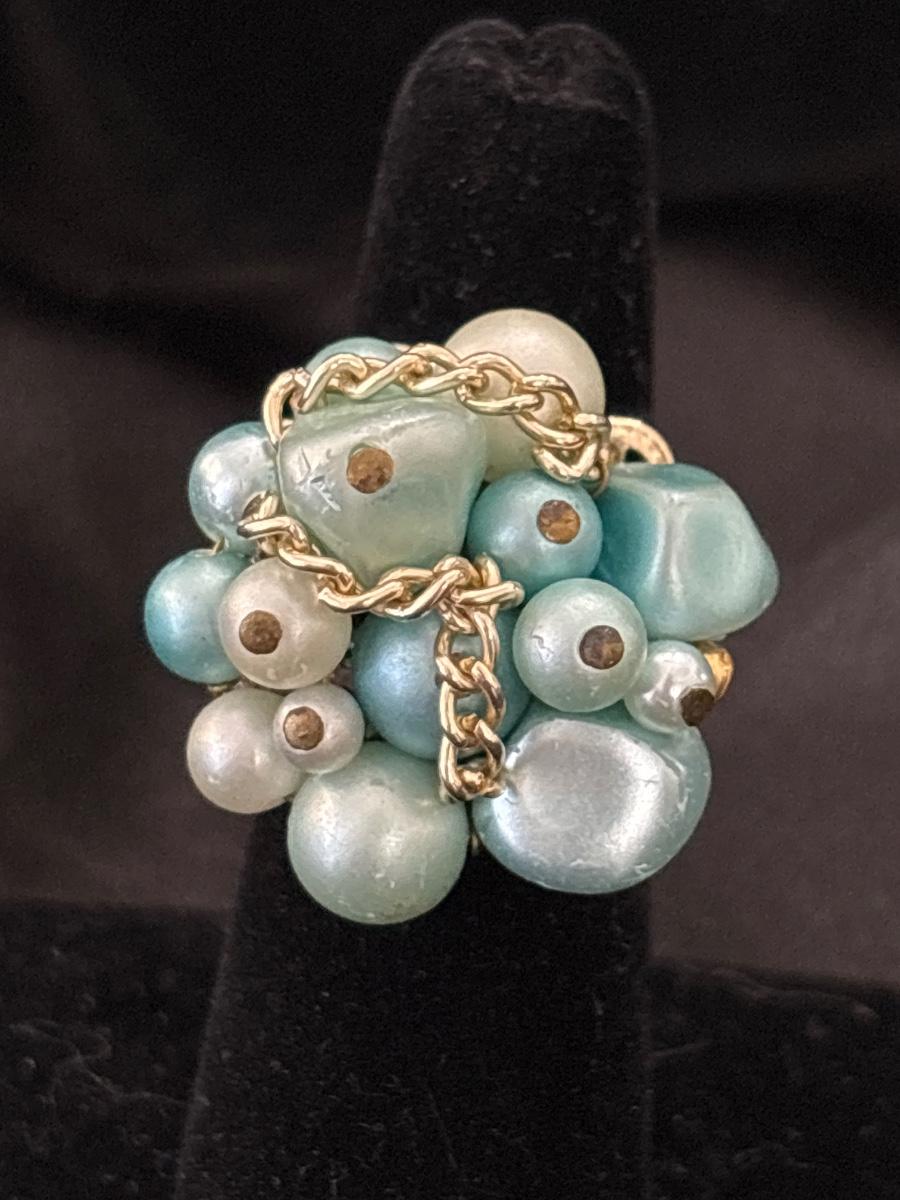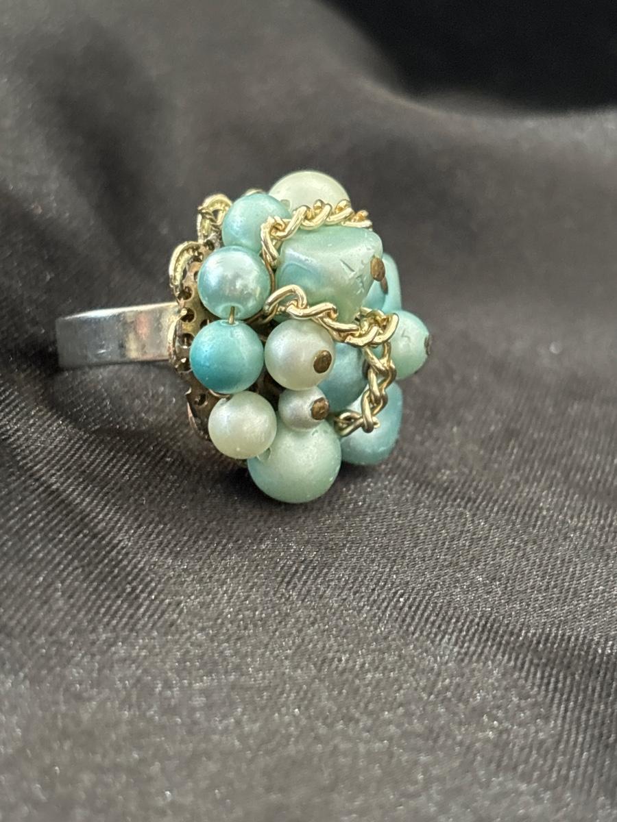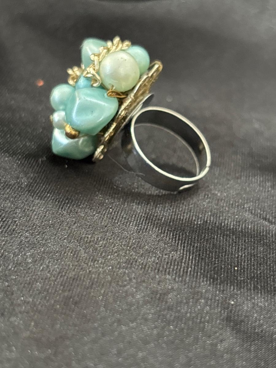 Vintage blue beaded cluster adjustable ring