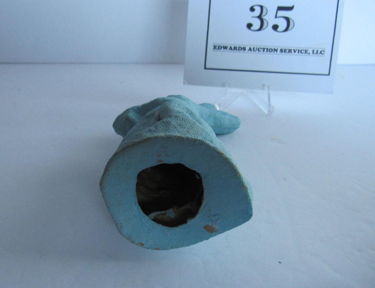 Blue paint over egg carton type cardboard, intact, very little damage but has some pencil marks on neck. See all photos. Shipping is available at shipping cost plus $5 a box handling fee. See our terms for details.
