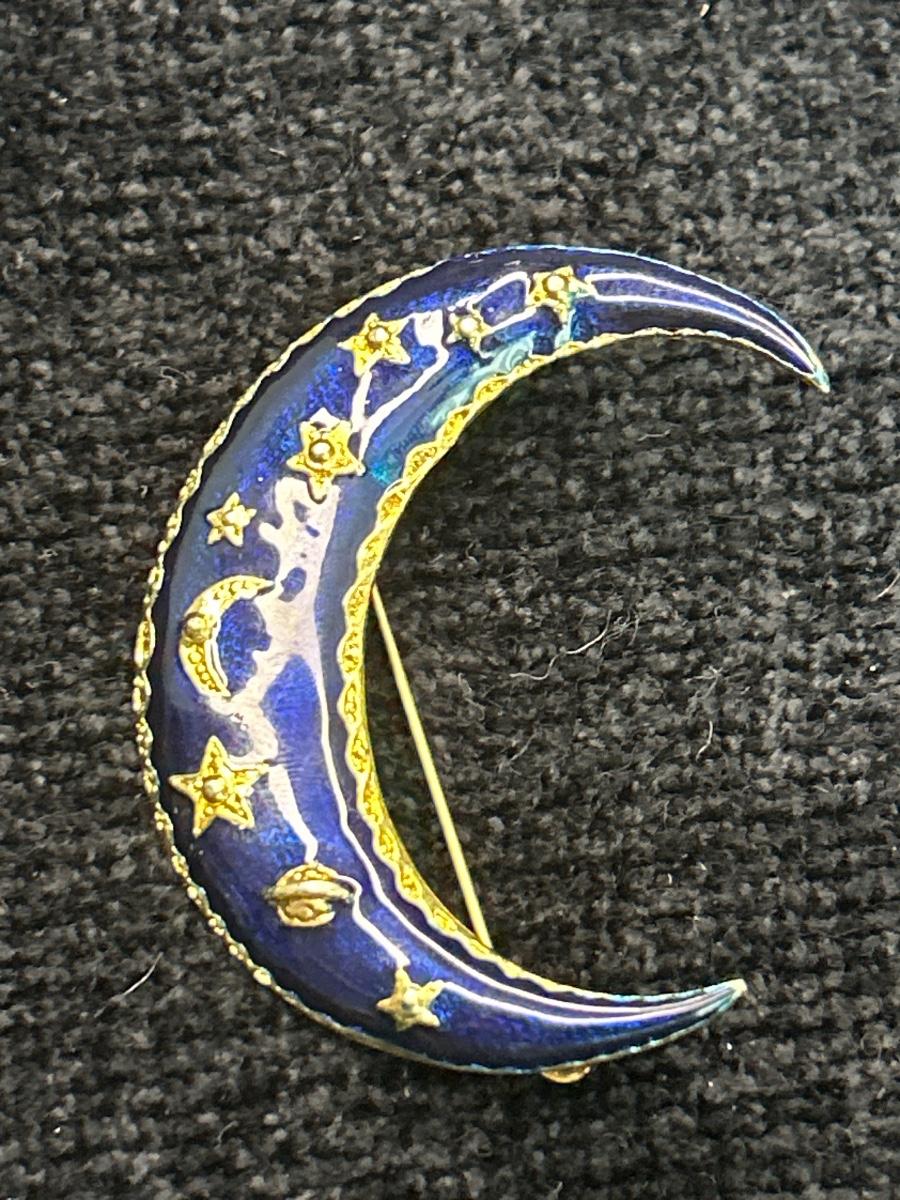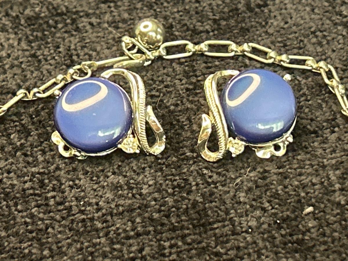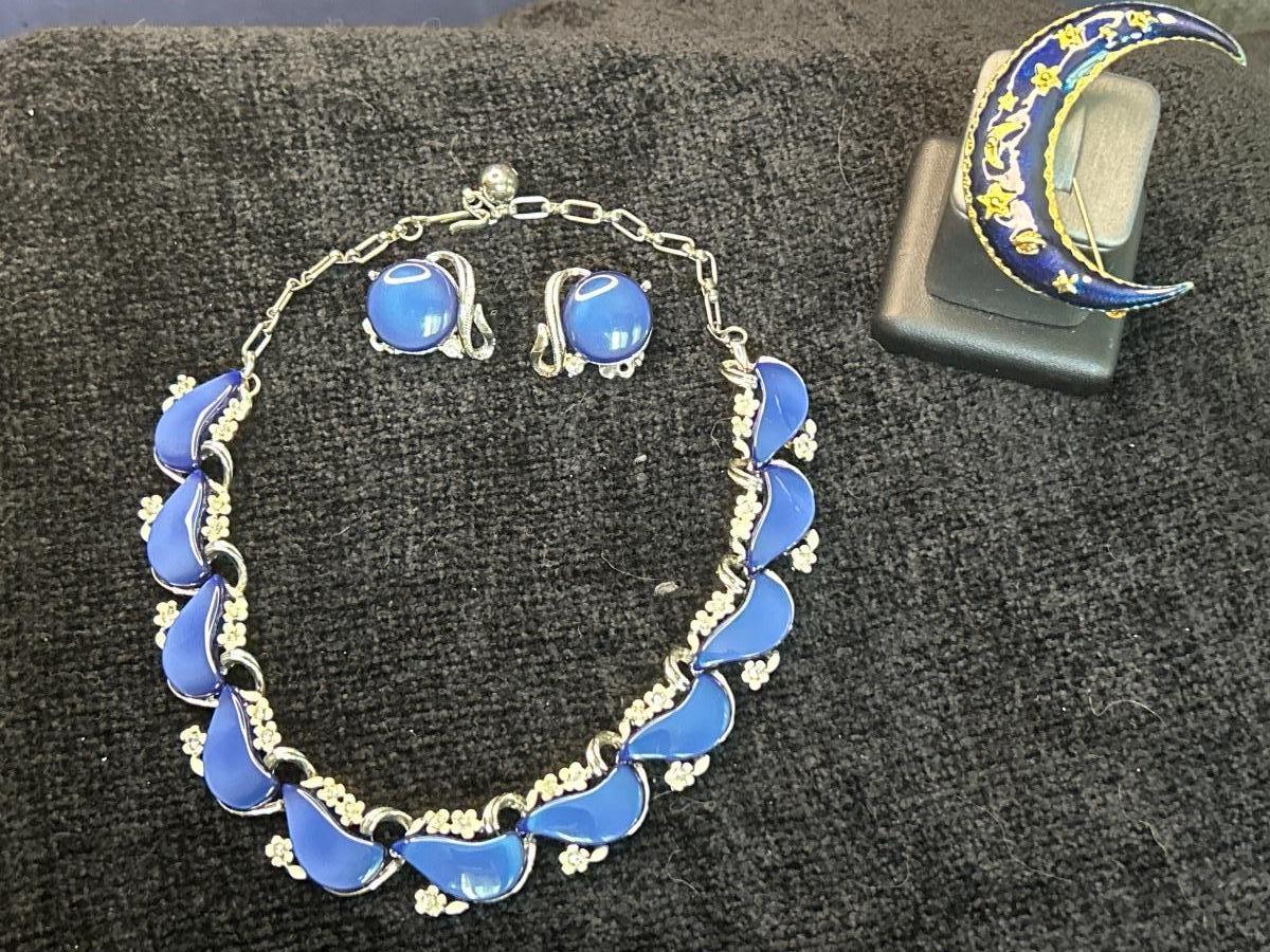 This set is in wonderful shape! The earrings are clip on. I added the beautiful blue moon brooch as well.