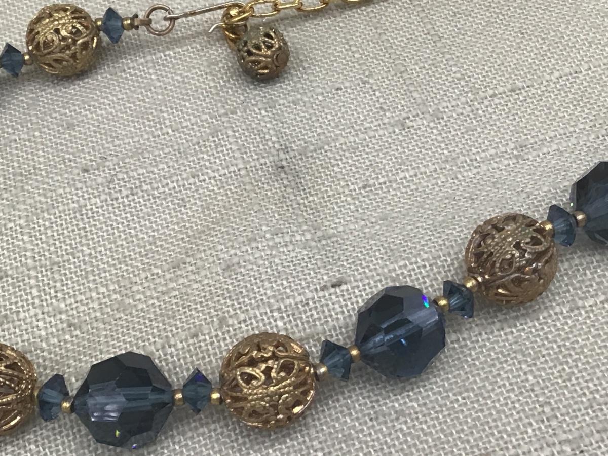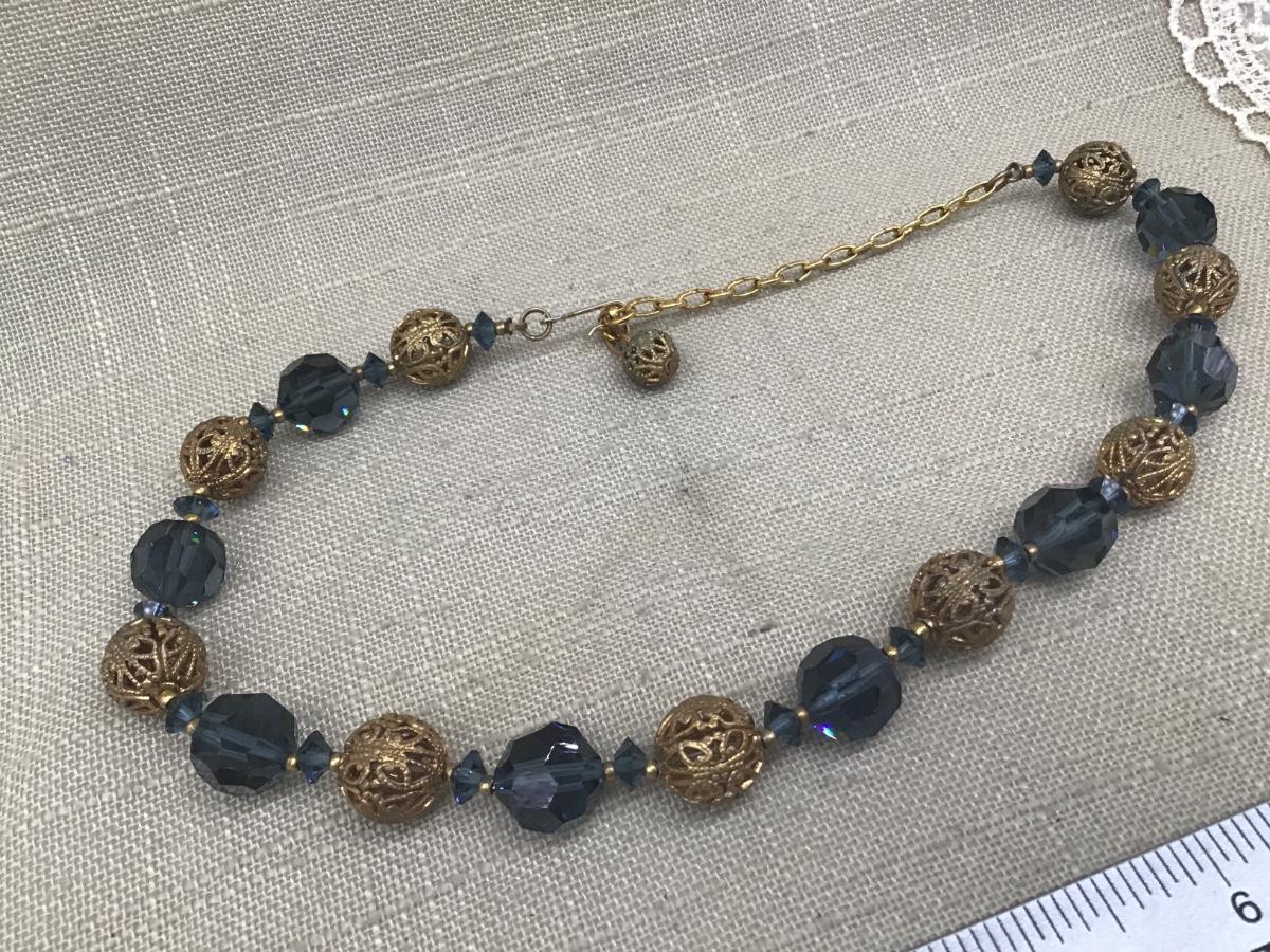 Vintage Blue Facet Cut Beaded Necklace GOld Ball Wire Chain
