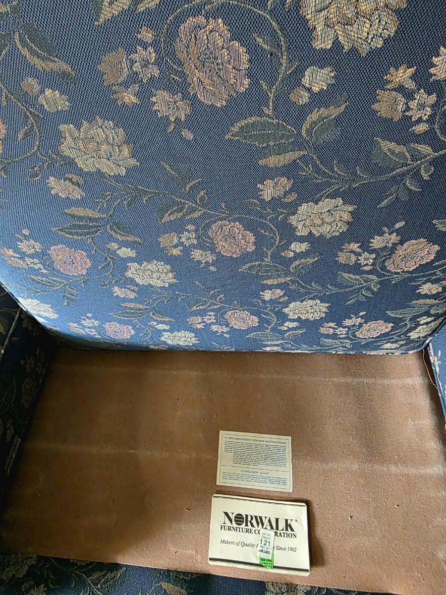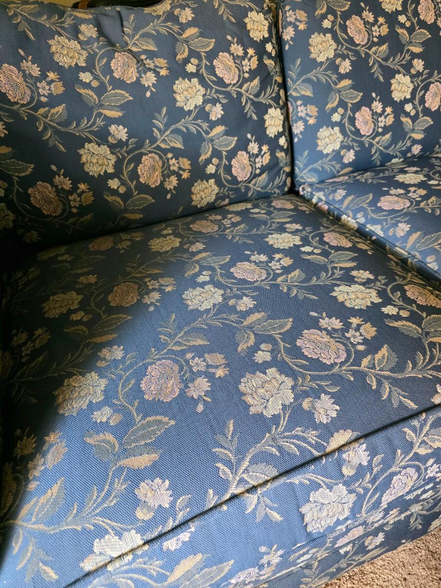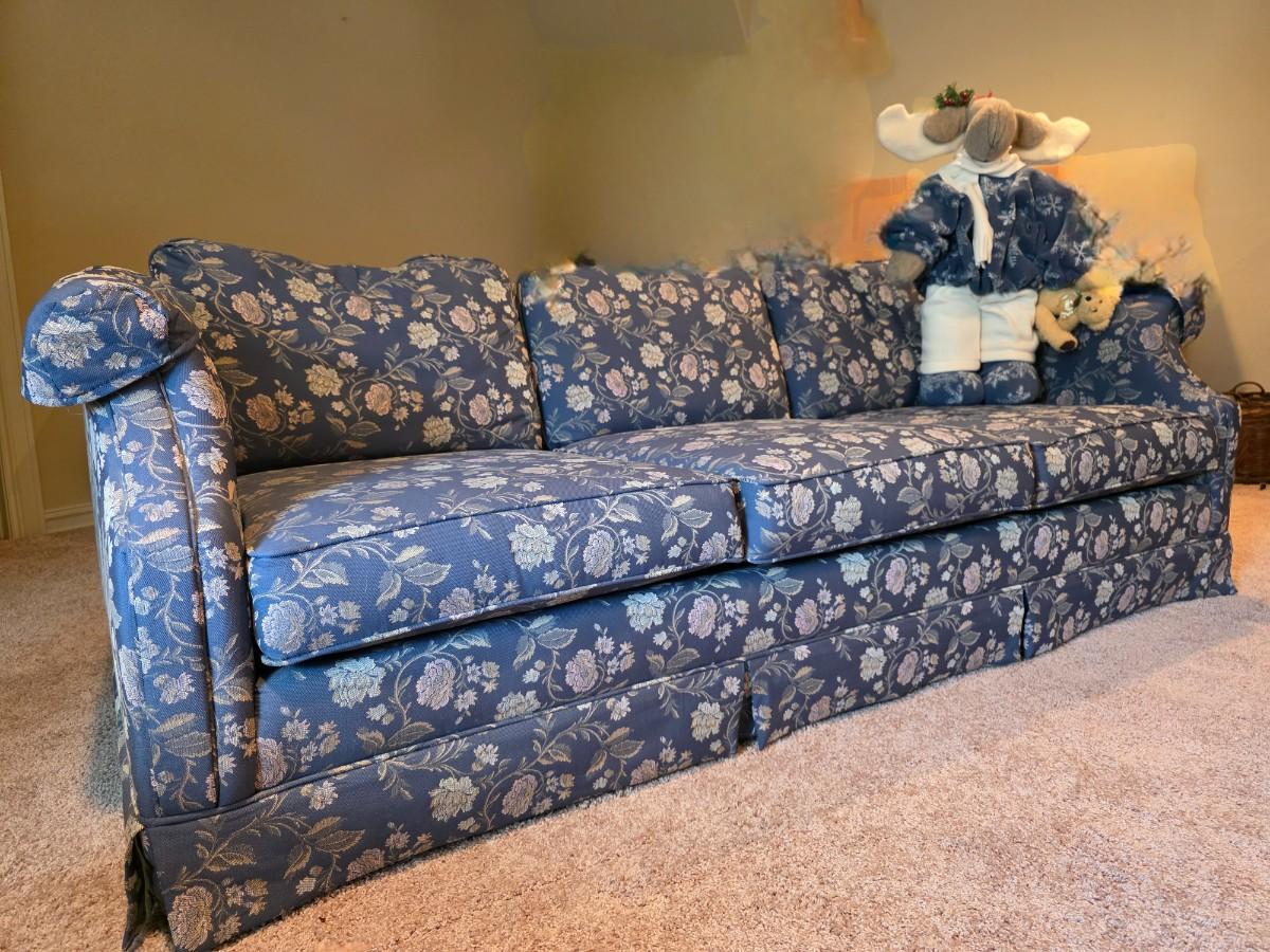 Vintage Blue Floral Sofa by Norwalk with Winter Moose