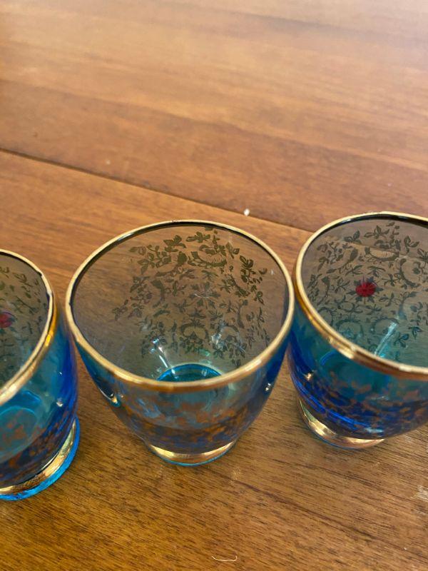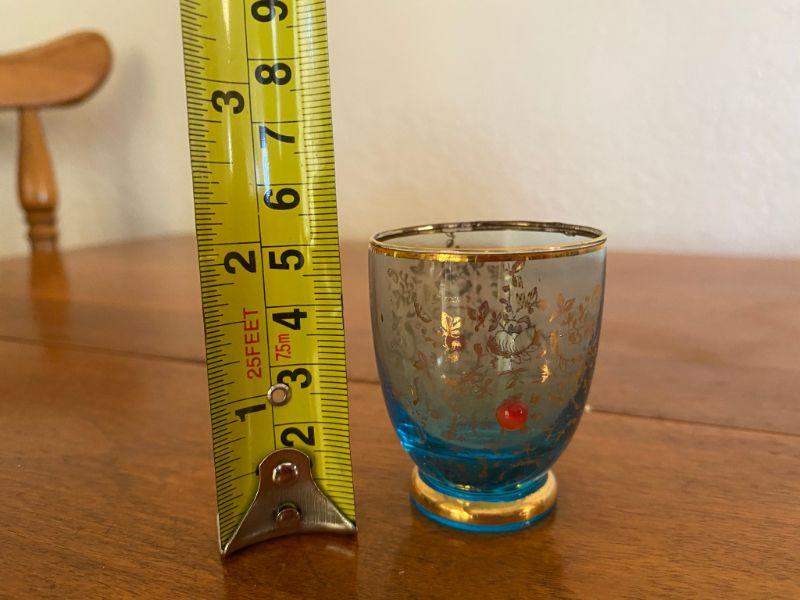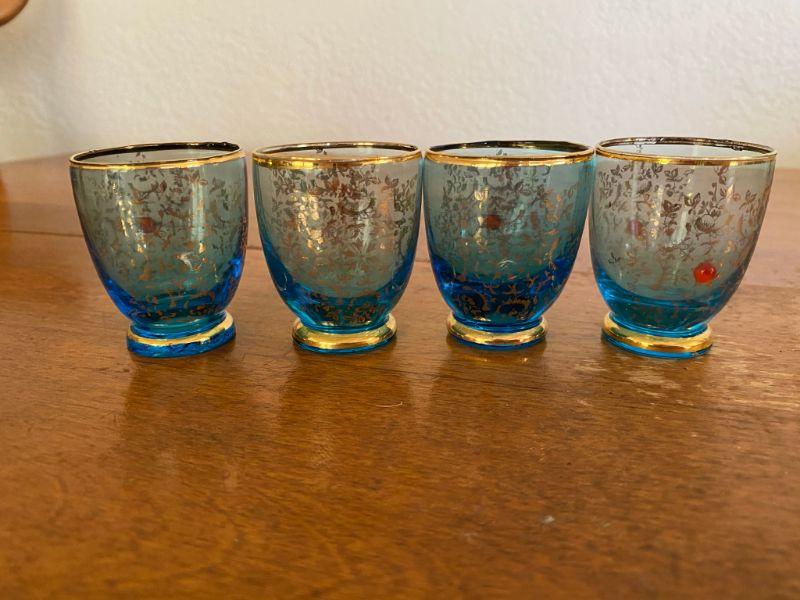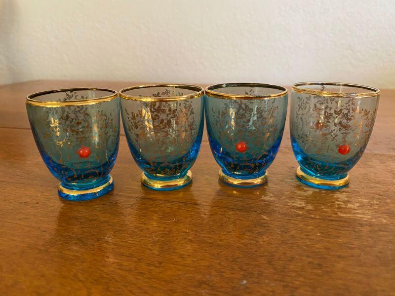 Set of 4 cordial glasses. Blue glass with gold accent. A red bead was glued on the centers but most have fallen off, could probably be removed from all. 2" size.