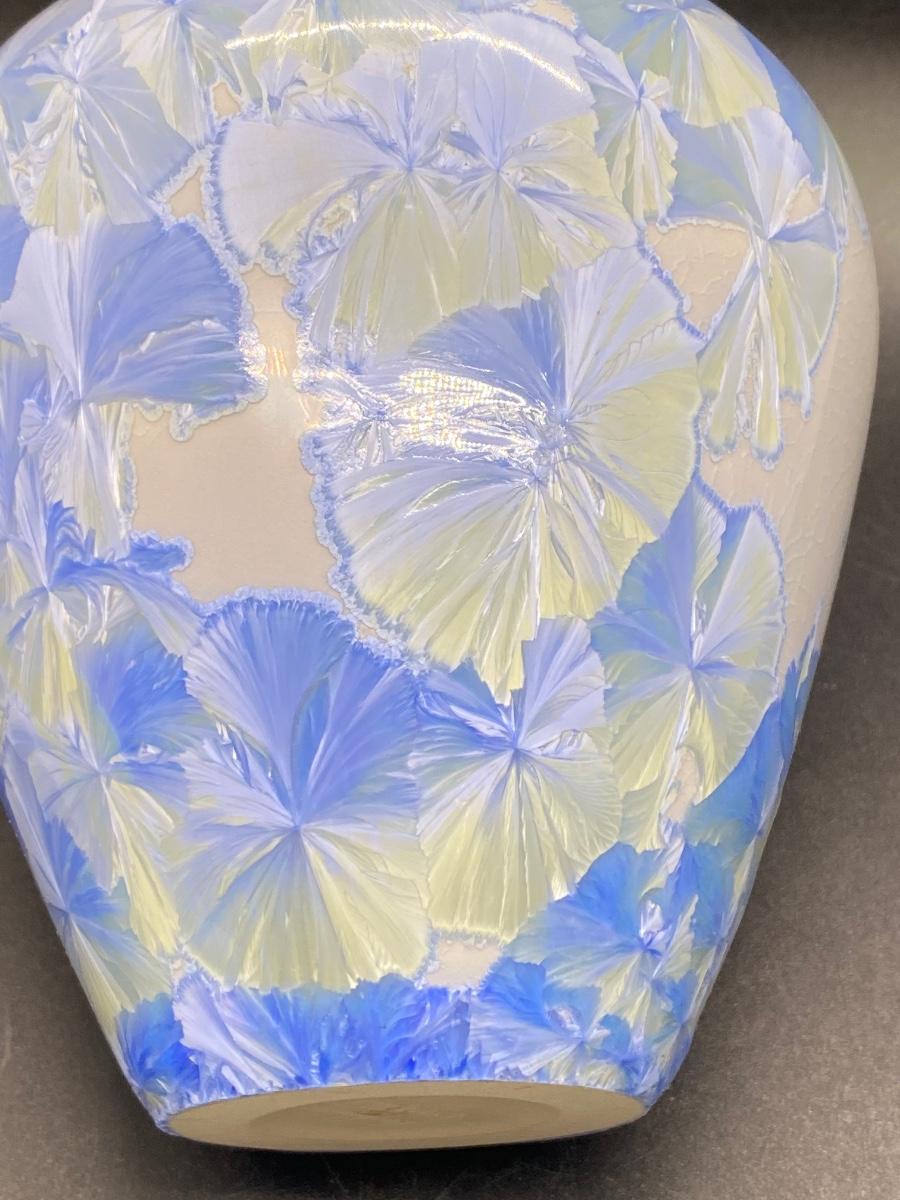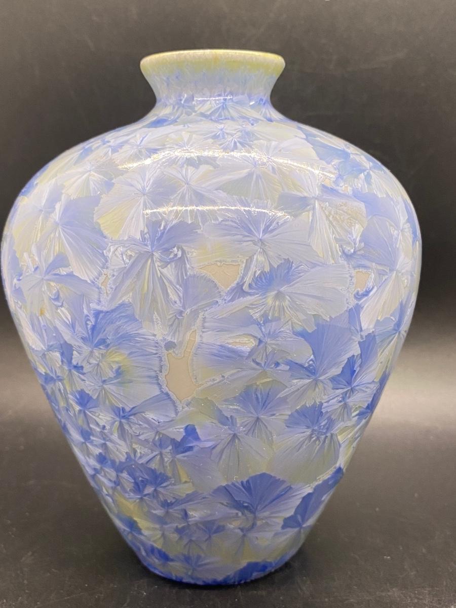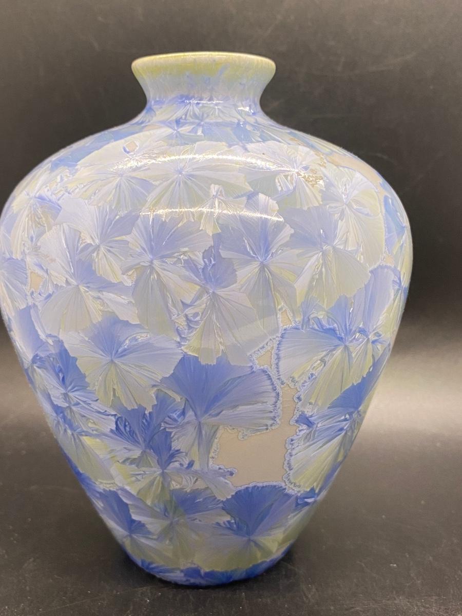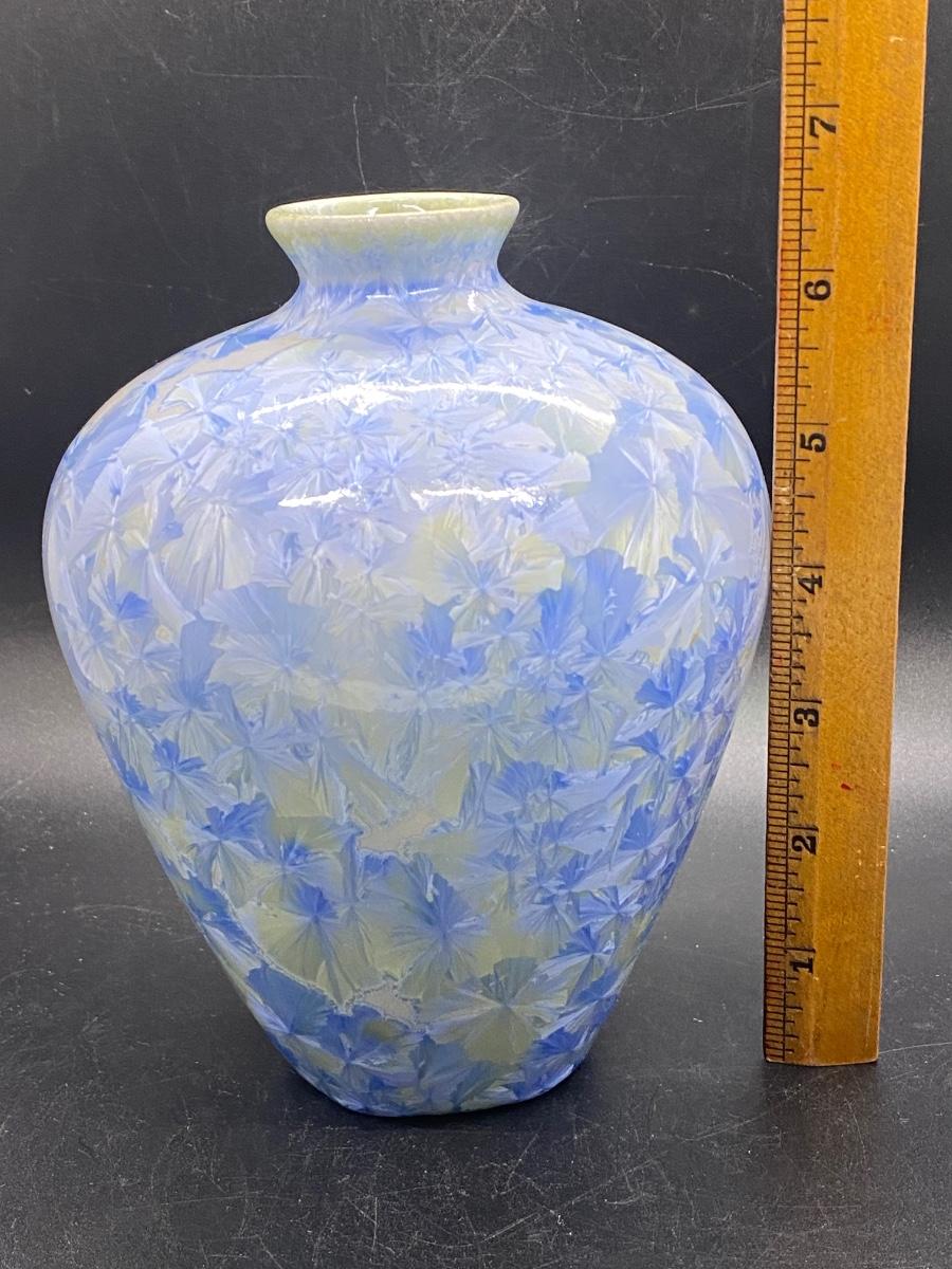 Vintage crystalline pottery vase by John Price. Pale blue with hints of yellow gold on a white pottery vase. No cracks or chips but there is crazing, noticeable on the white vase parts. About 6.5" tall.