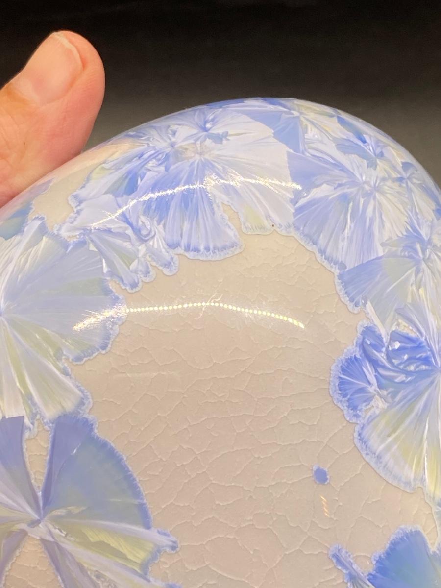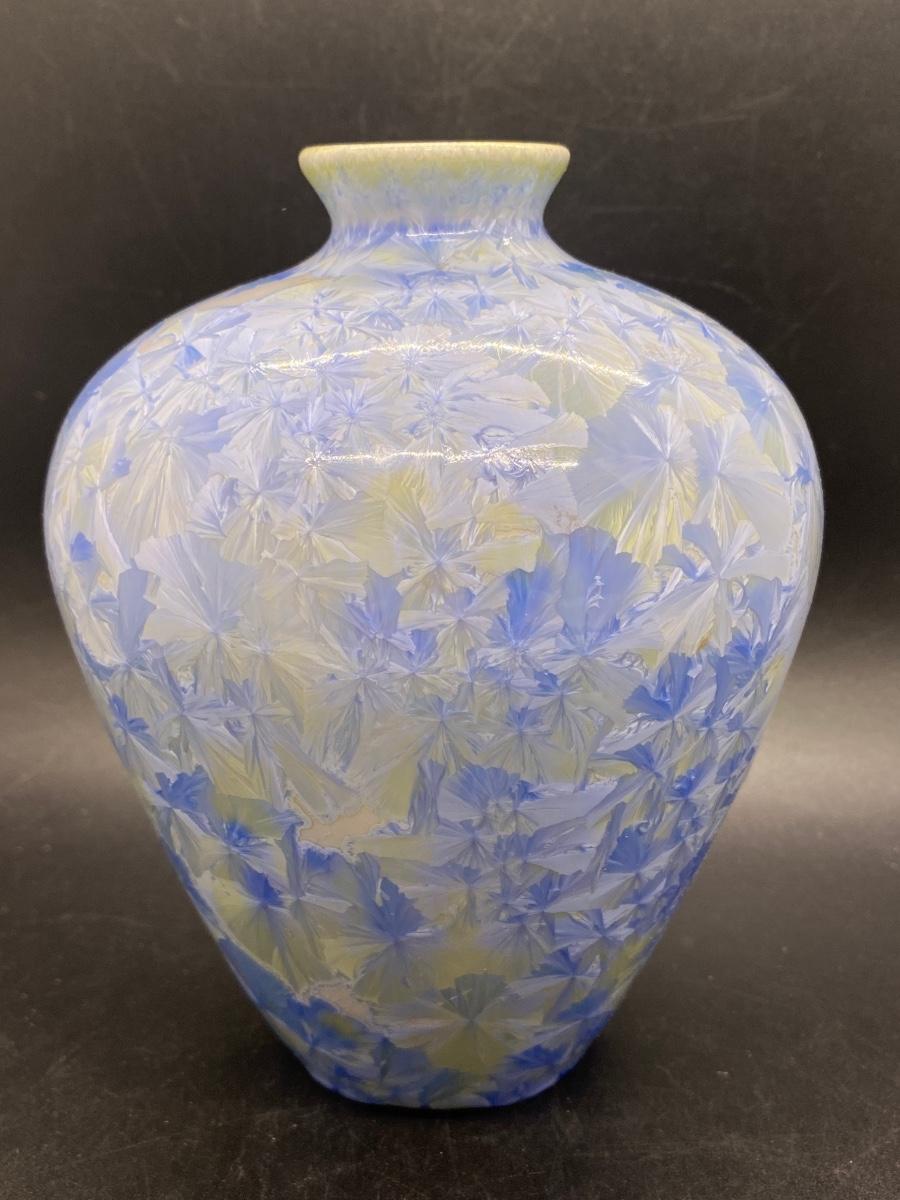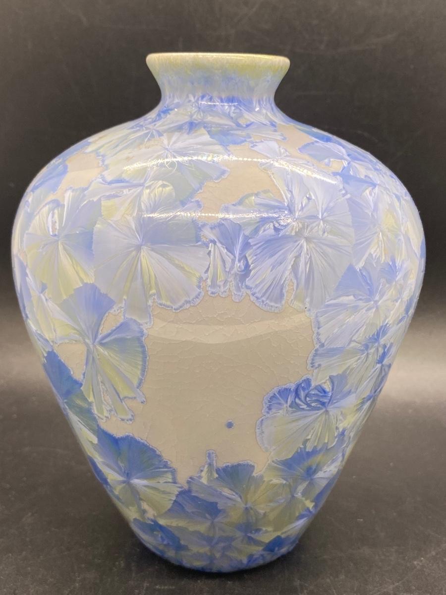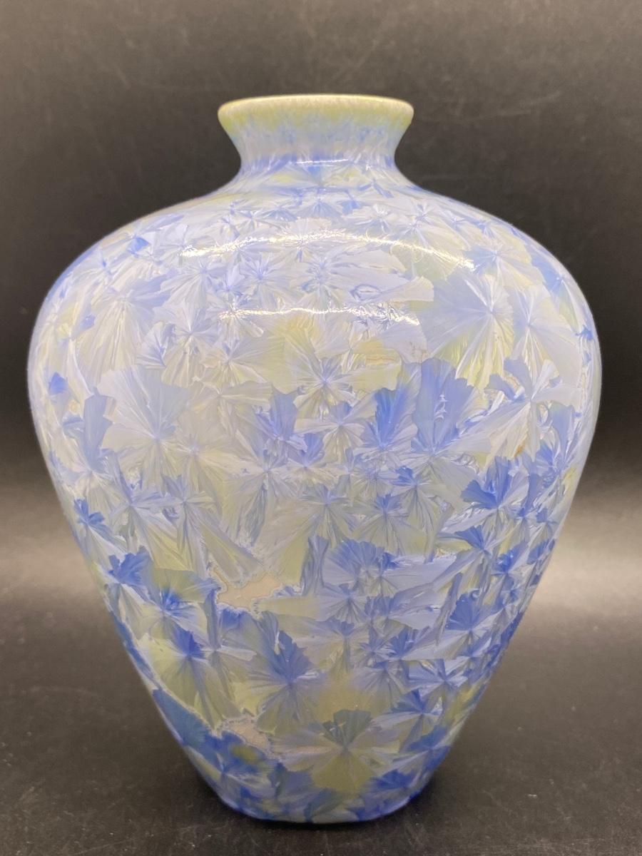 Vintage crystalline pottery vase by John Price. Pale blue with hints of yellow gold on a white pottery vase. No cracks or chips but there is crazing, noticeable on the white vase parts. About 6.5" tall.