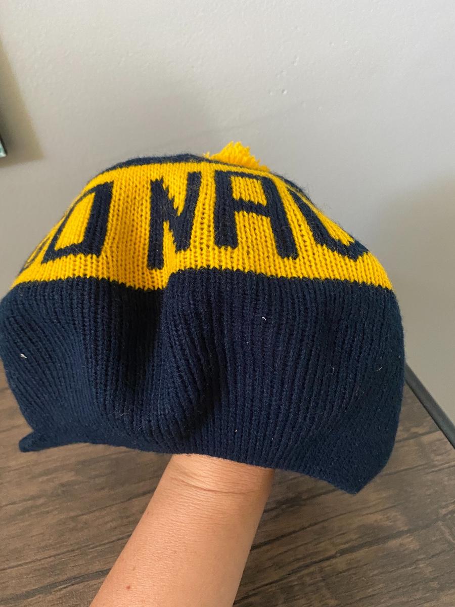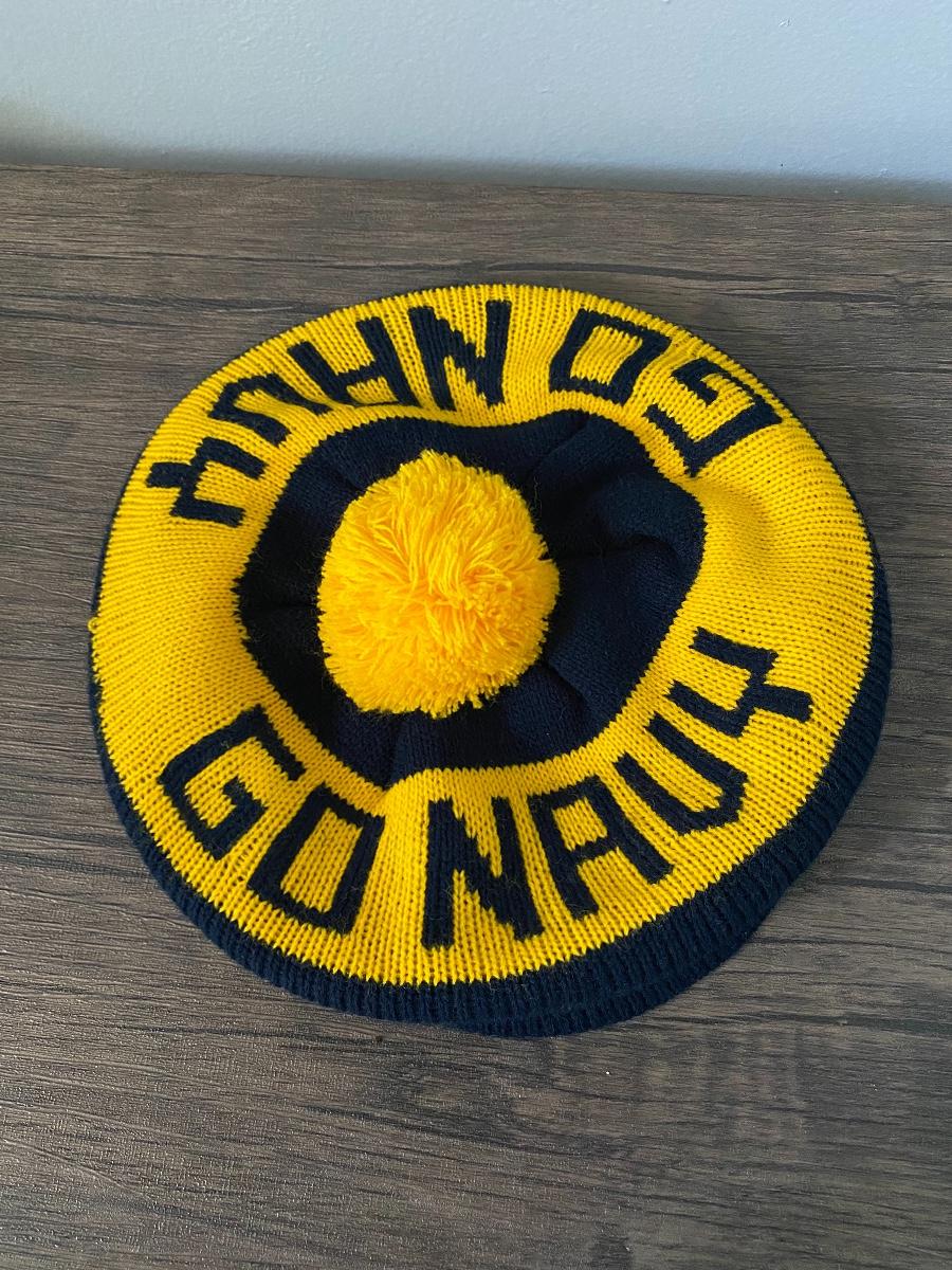 Vintage Blue & Gold GO NAVY Knit Winter Cap Hat Beanie with Visor Pom Pom