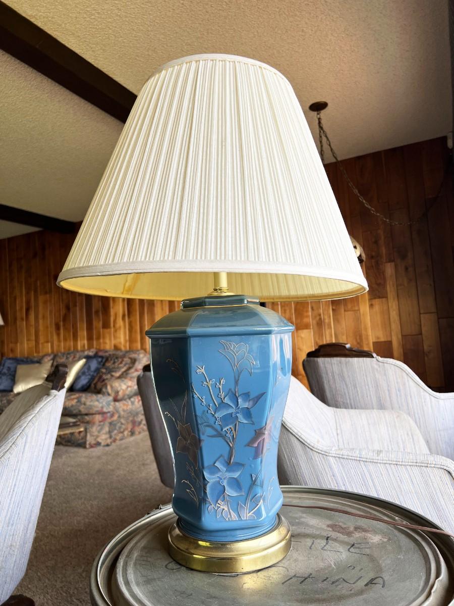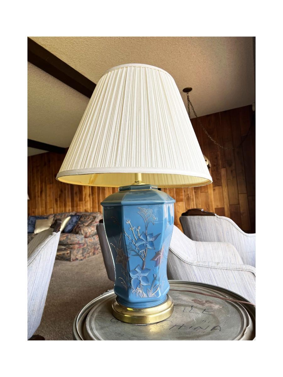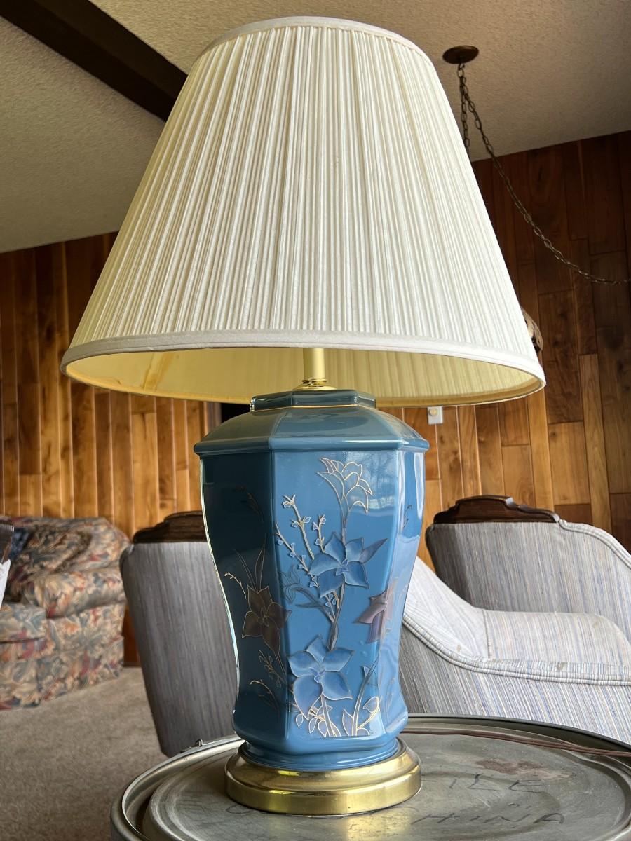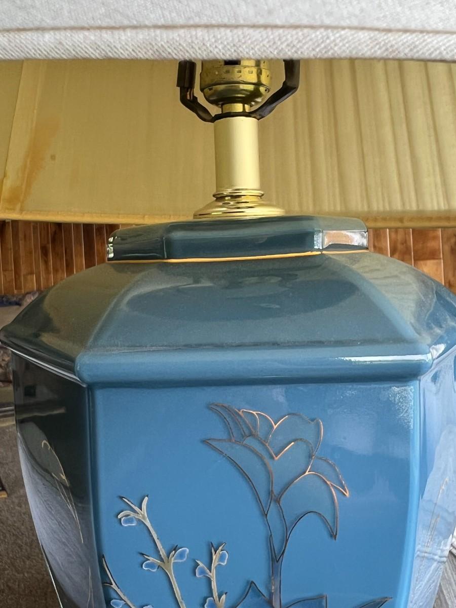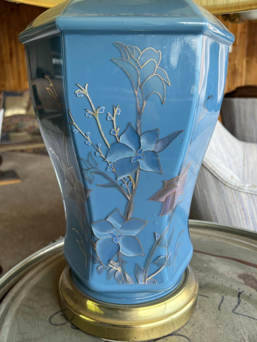 Vintage Blue Gold Painted Floral Table Lamp. In good condition. About 29" tall.