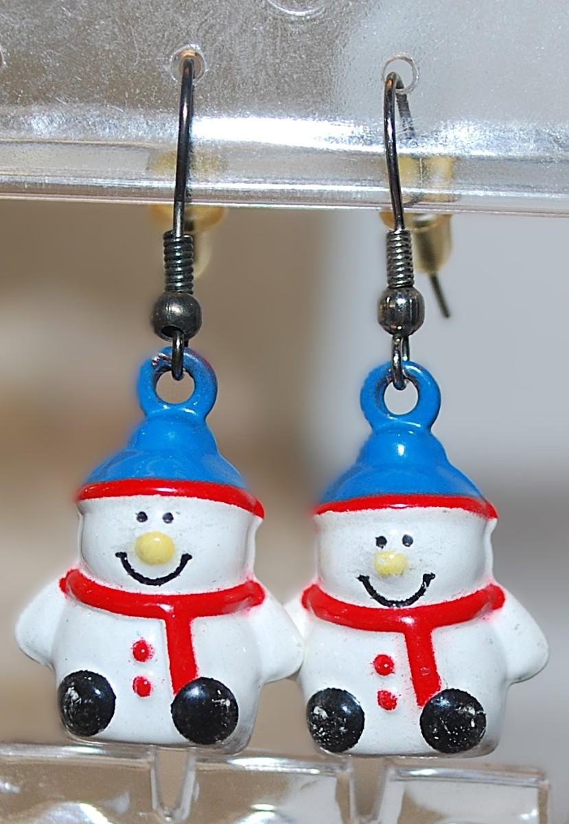 Vintage BLUE HAT SNOWMAN EARRINGS Pair (1" x ¾") with a Yellow Nose & Red Scarf on a Wire Hook Clasp