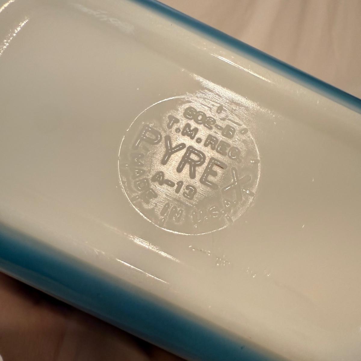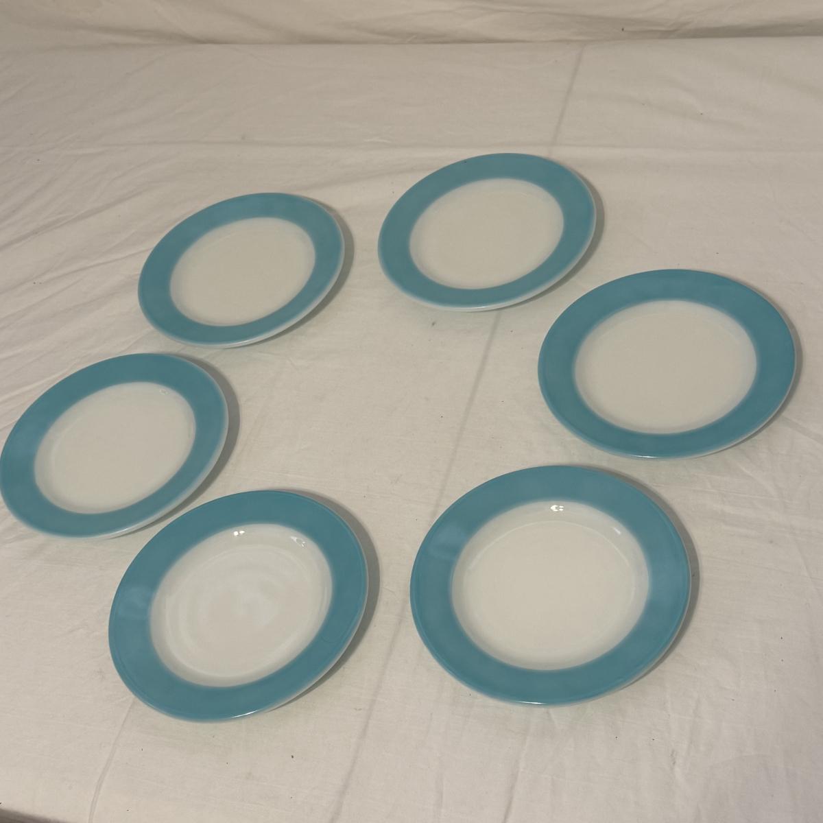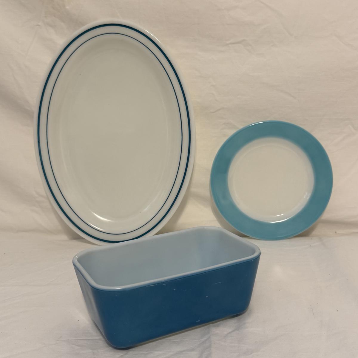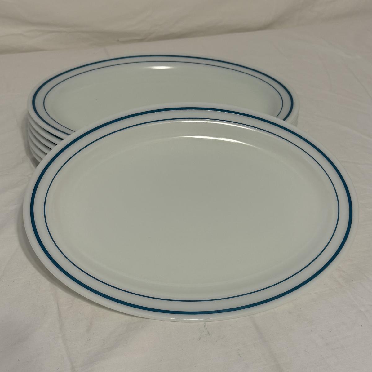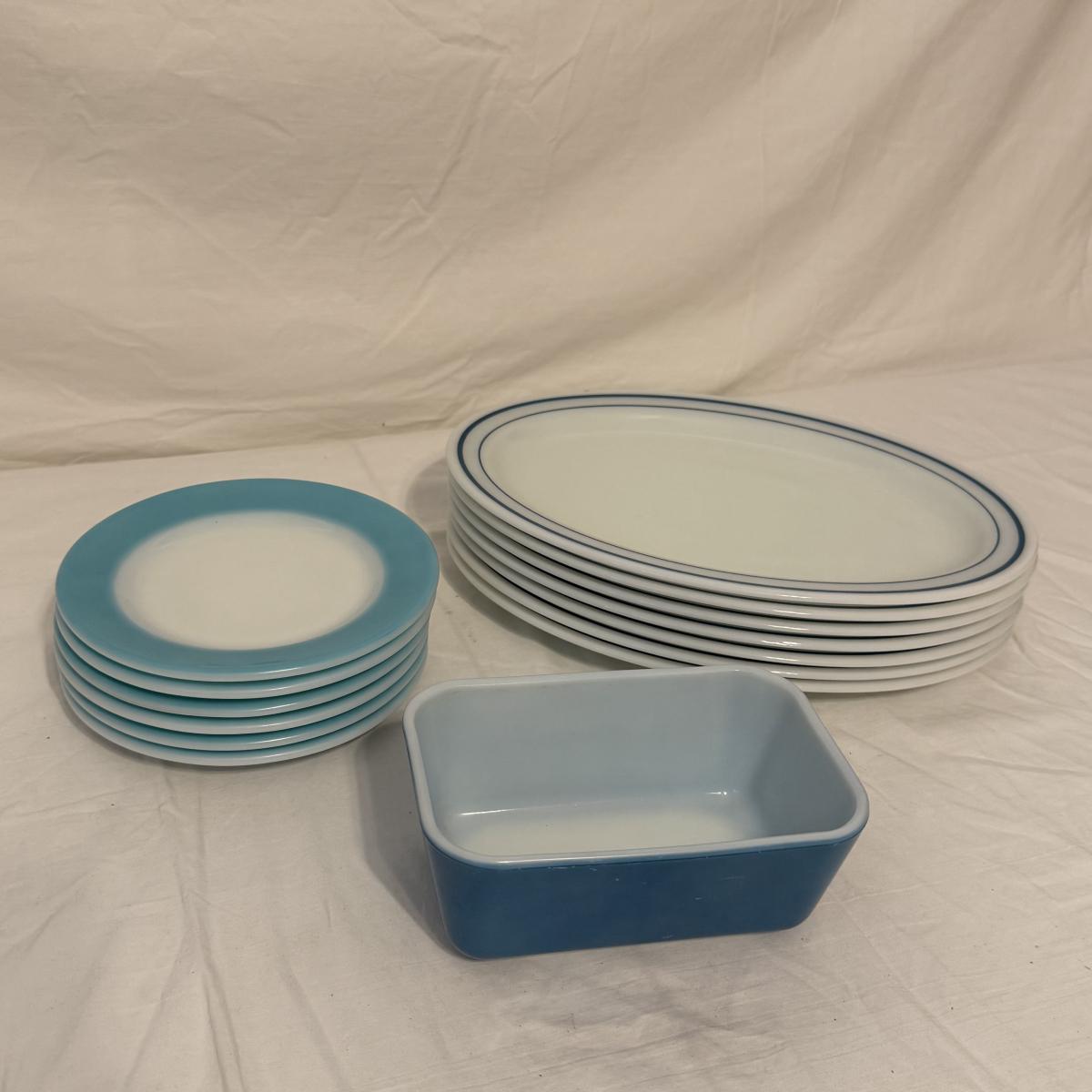 A variety of vintage Pyrex and Corning dishes with blue accents. There are seven oval Corning plates that are 12.5” x 9”. Their pattern has two blue bands. There are six Pyrex Double Tough 6.75”D turquoise plates, and one blue Pyrex loaf pan. The loaf pan has some light scratches in the blue exterior. The turquoise color on the Pyrex plates appears more blue in the photos than in person.