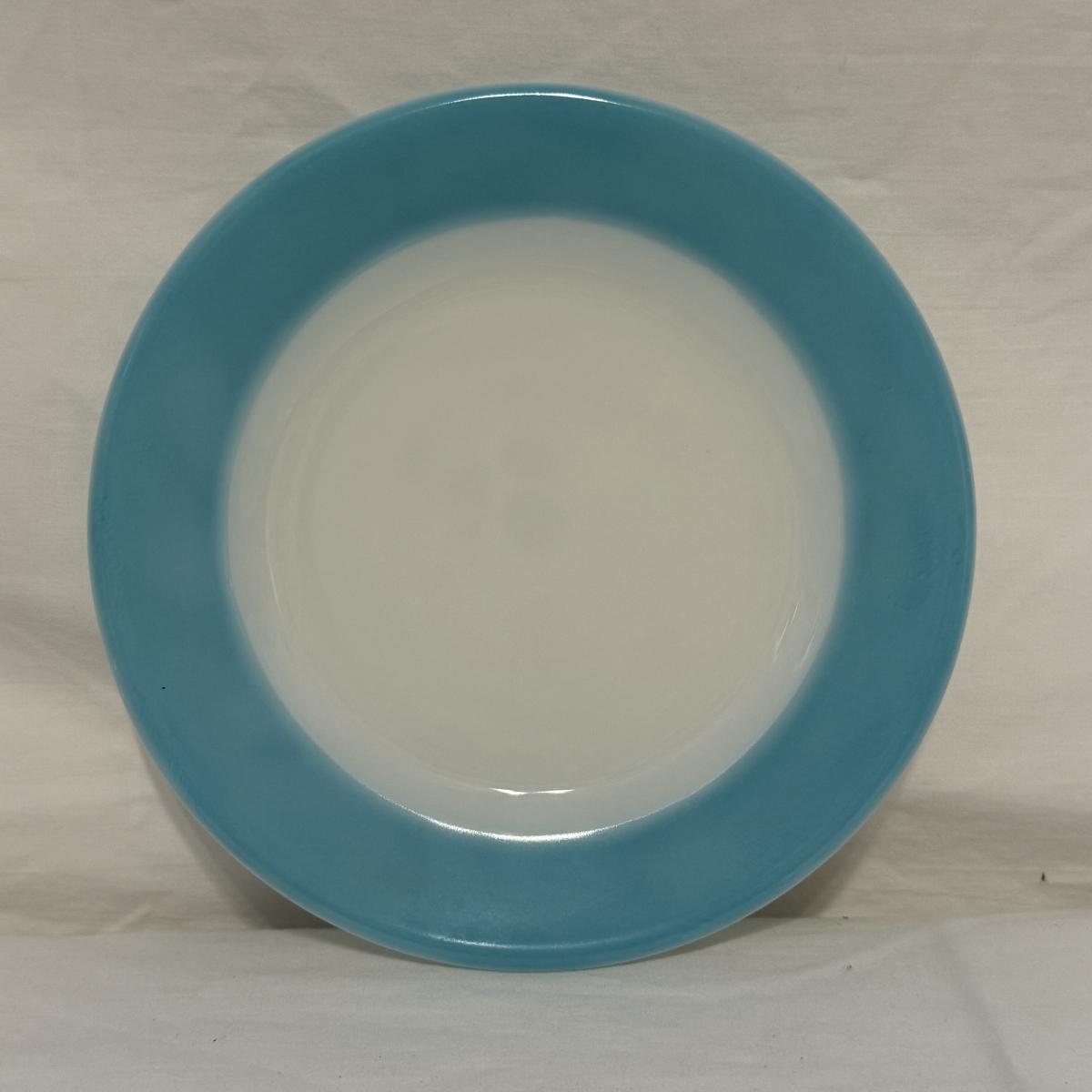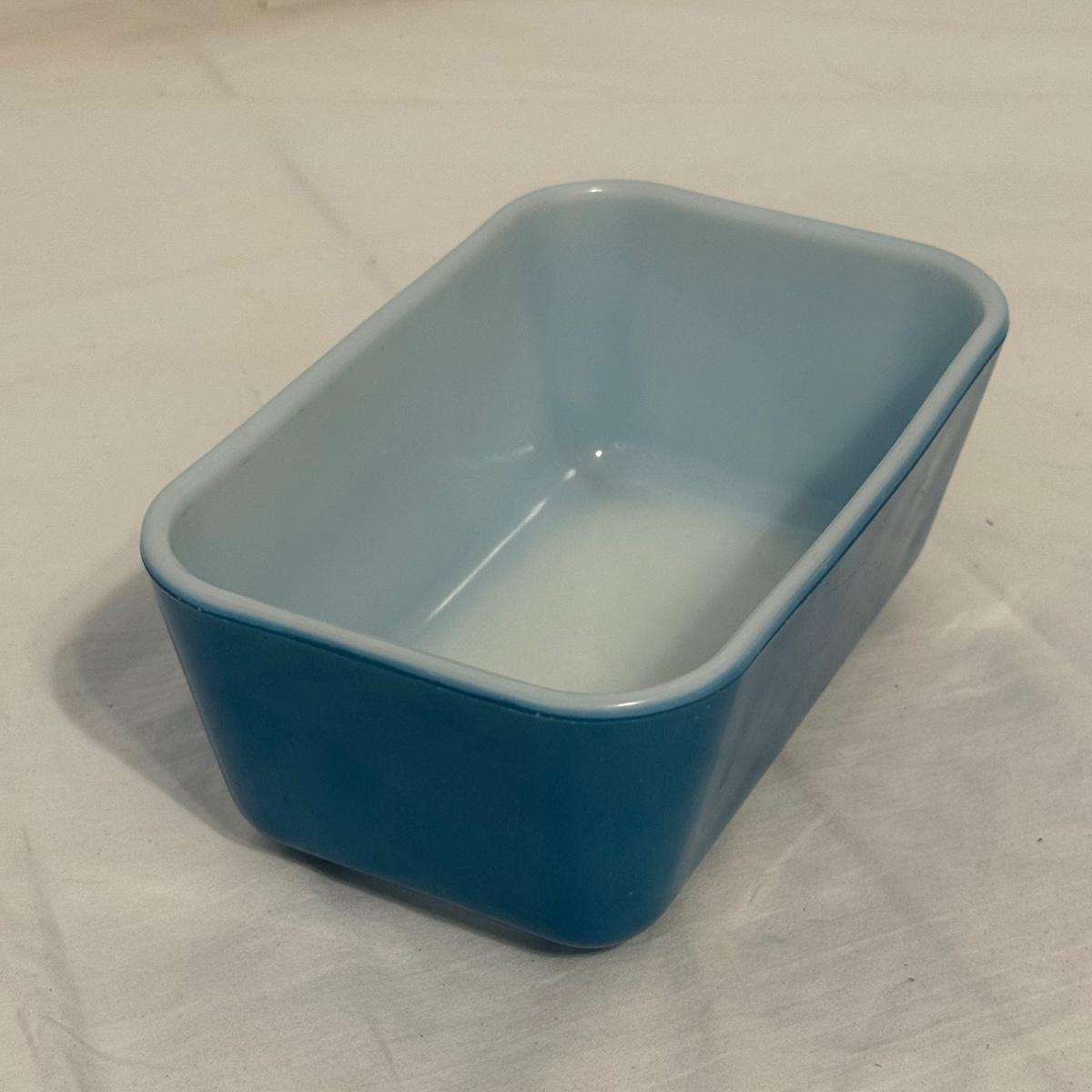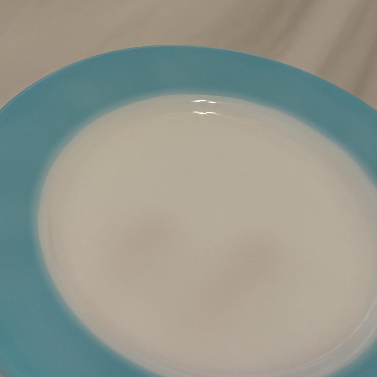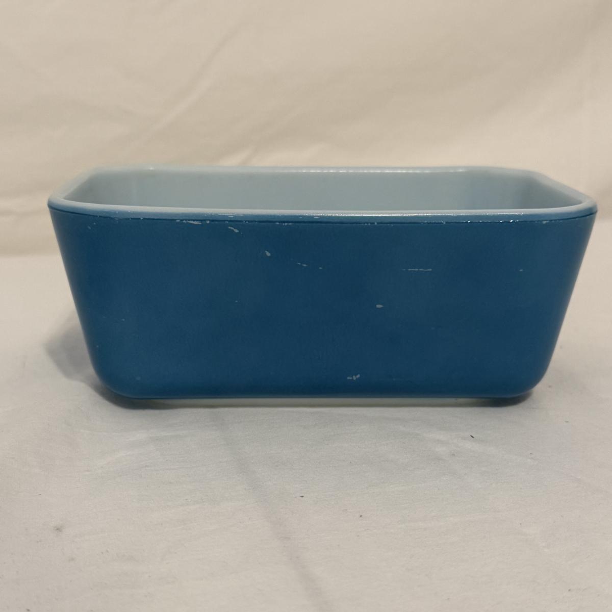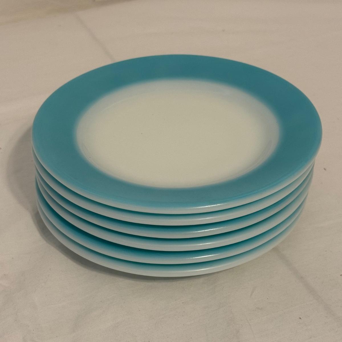 A variety of vintage Pyrex and Corning dishes with blue accents. There are seven oval Corning plates that are 12.5” x 9”. Their pattern has two blue bands. There are six Pyrex Double Tough 6.75”D turquoise plates, and one blue Pyrex loaf pan. The loaf pan has some light scratches in the blue exterior. The turquoise color on the Pyrex plates appears more blue in the photos than in person.