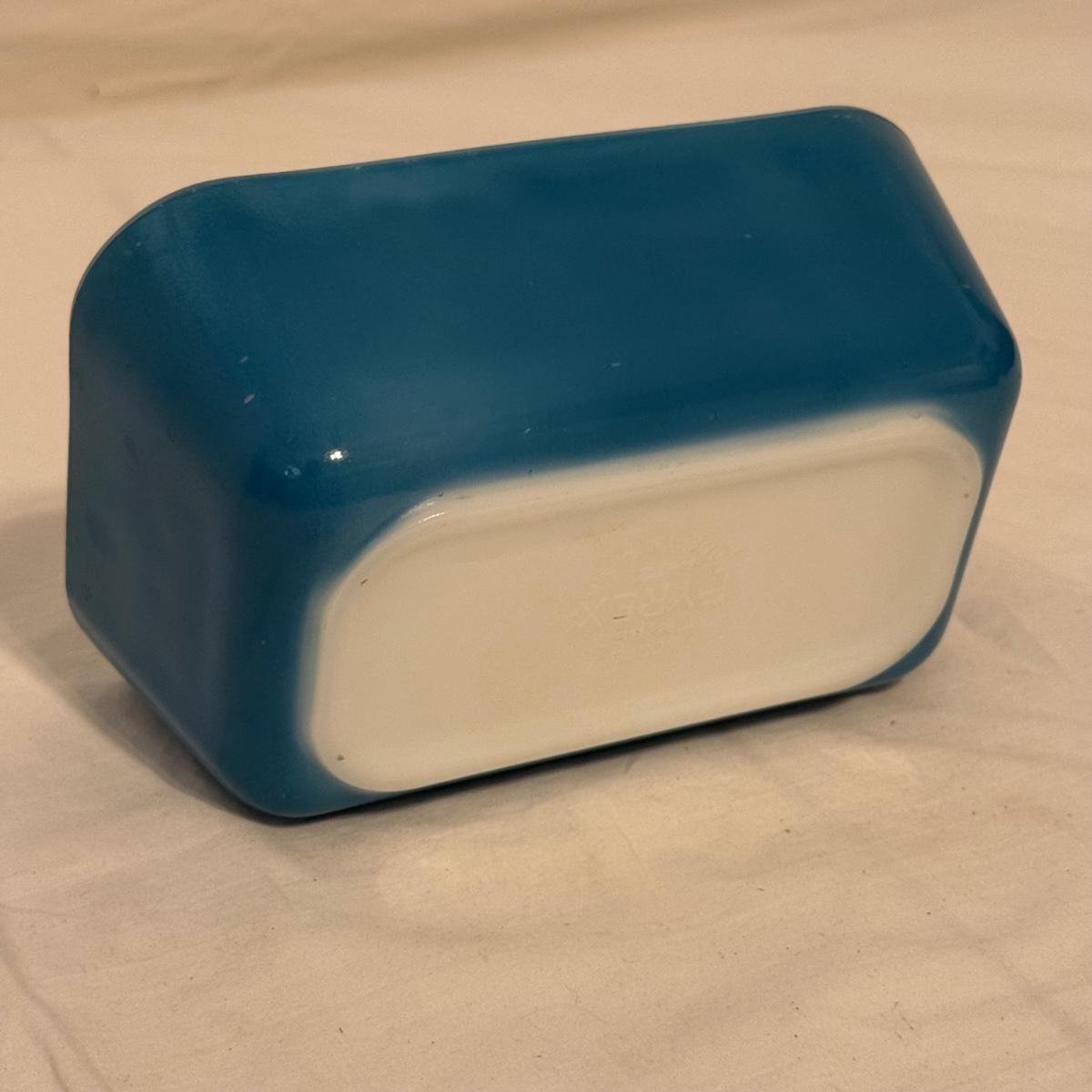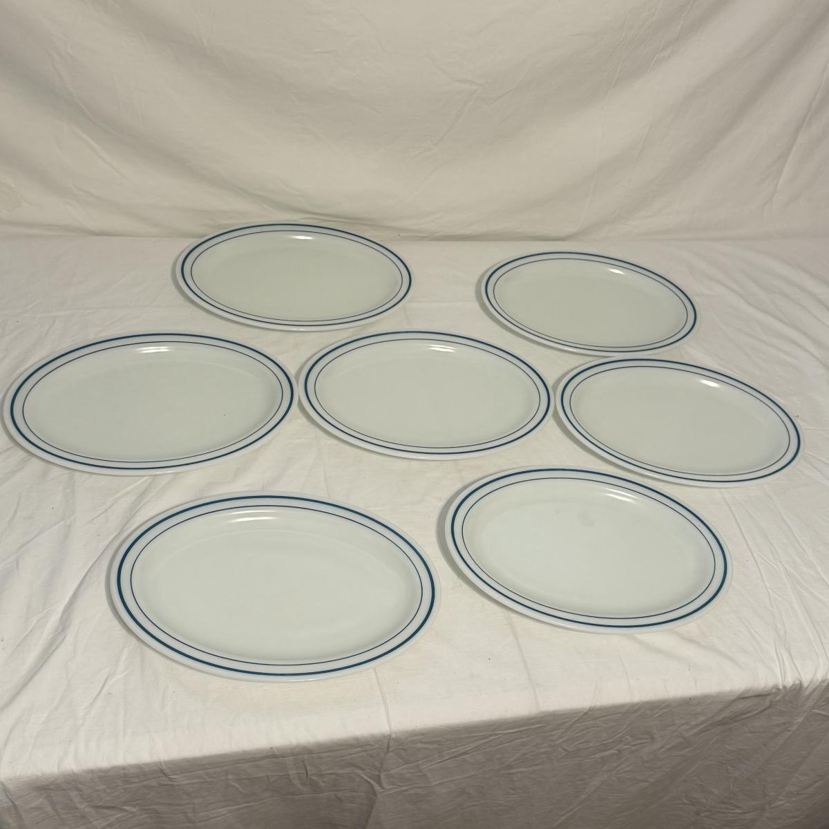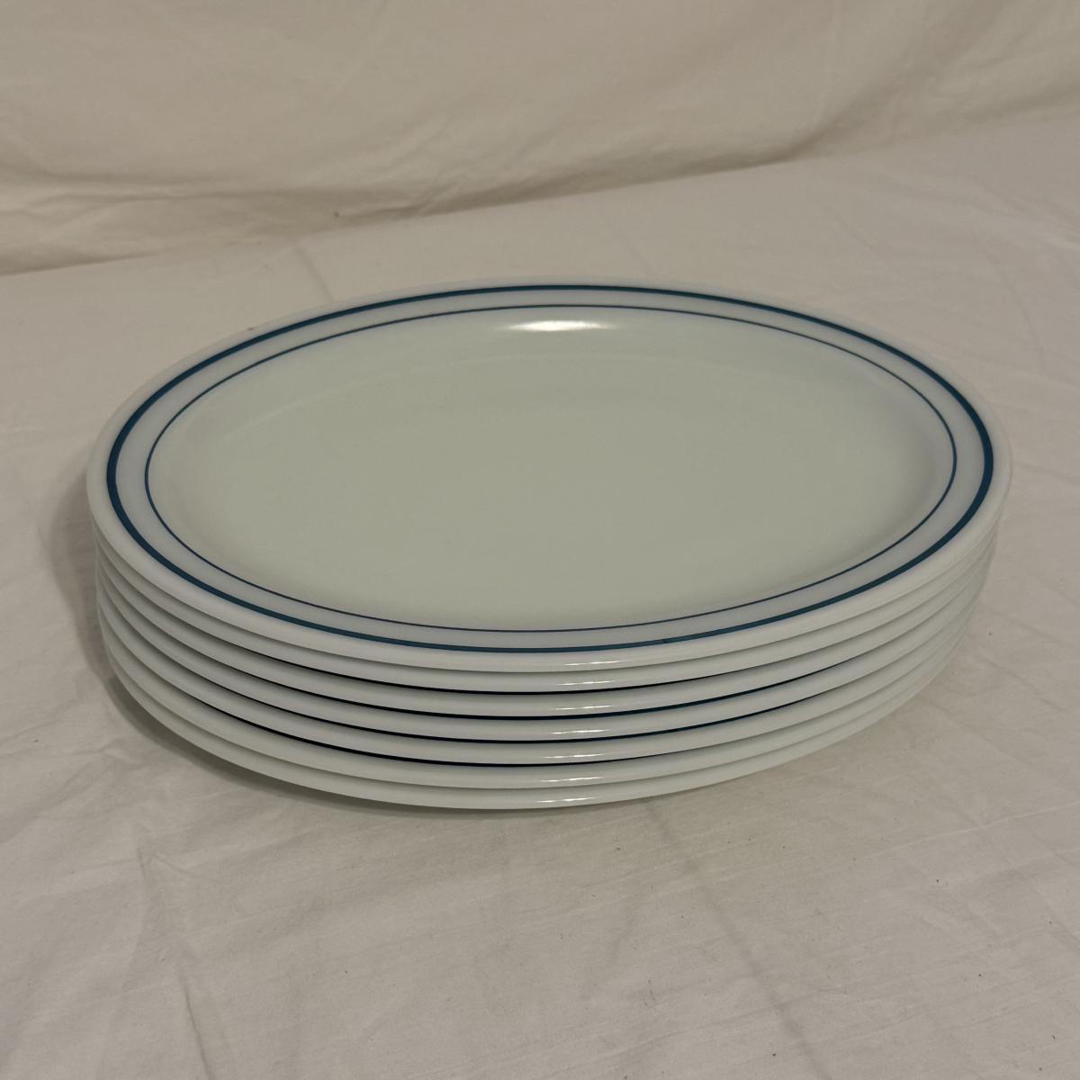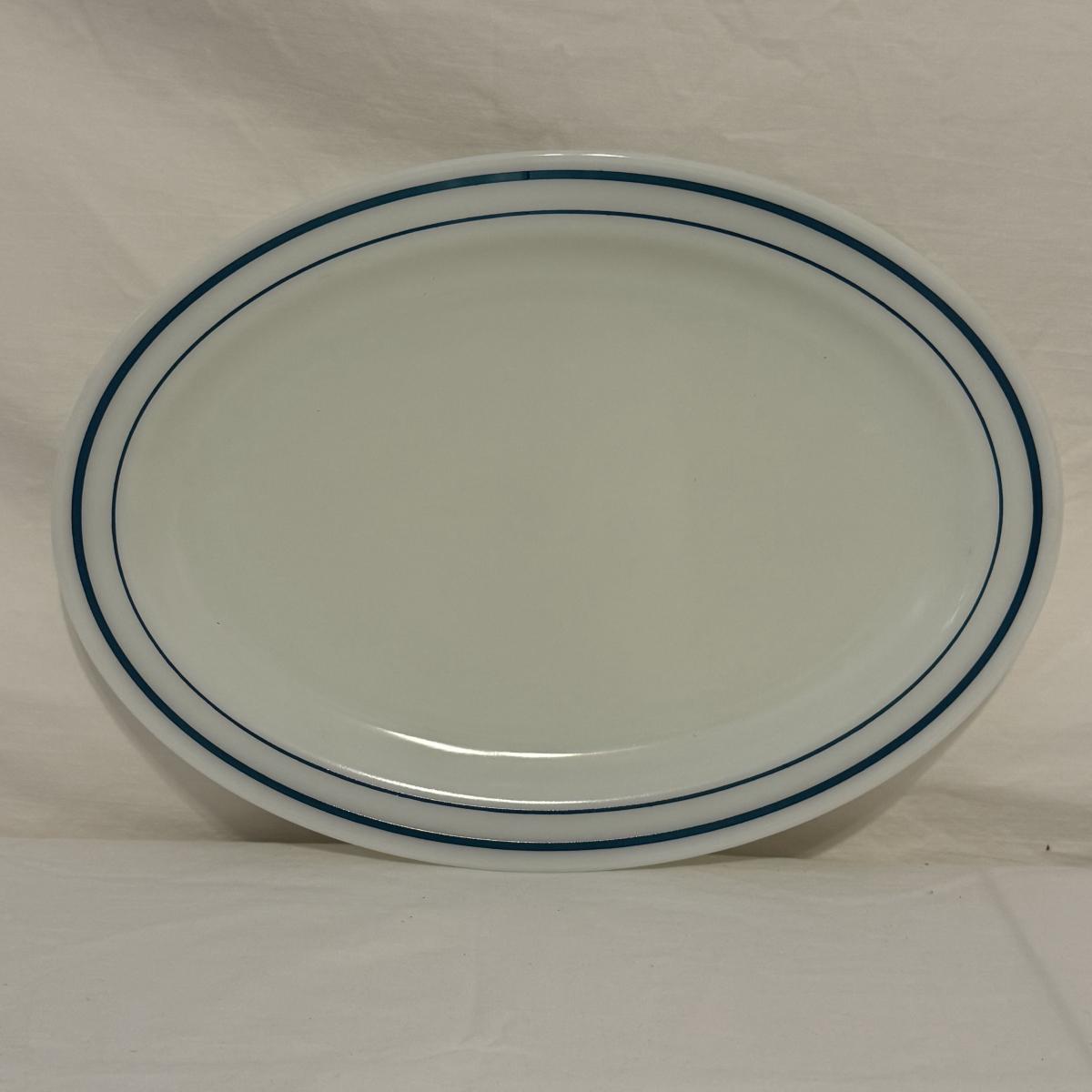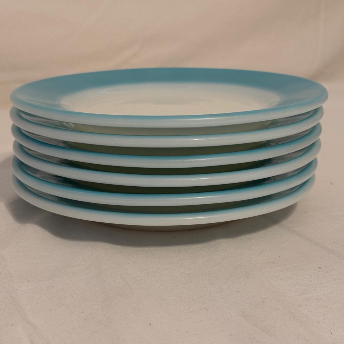 A variety of vintage Pyrex and Corning dishes with blue accents. There are seven oval Corning plates that are 12.5” x 9”. Their pattern has two blue bands. There are six Pyrex Double Tough 6.75”D turquoise plates, and one blue Pyrex loaf pan. The loaf pan has some light scratches in the blue exterior. The turquoise color on the Pyrex plates appears more blue in the photos than in person.