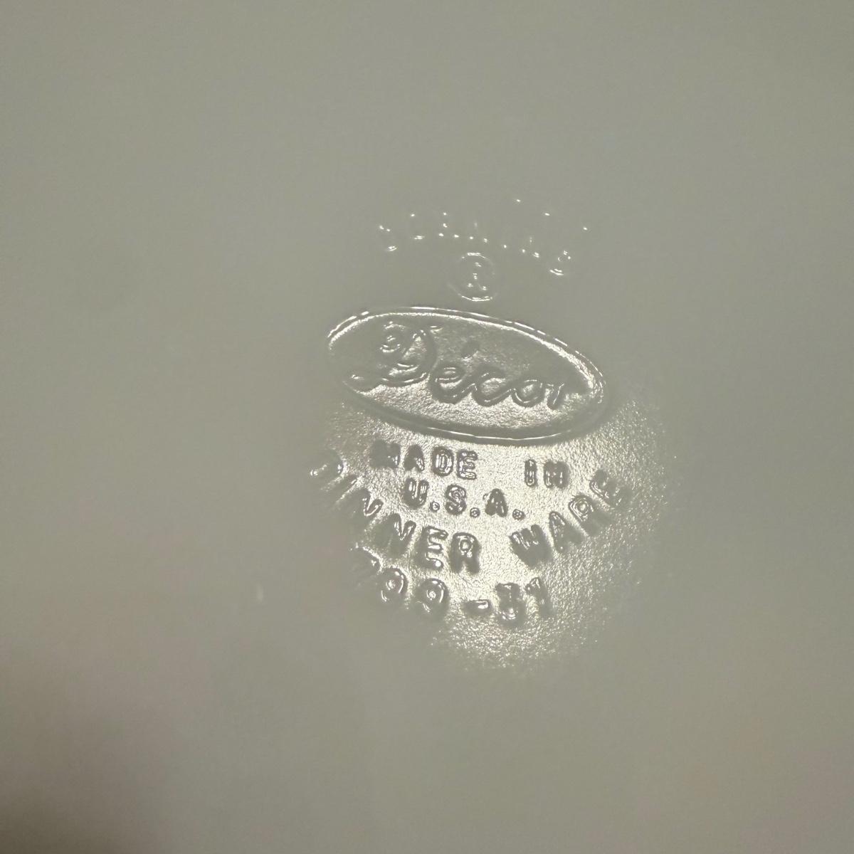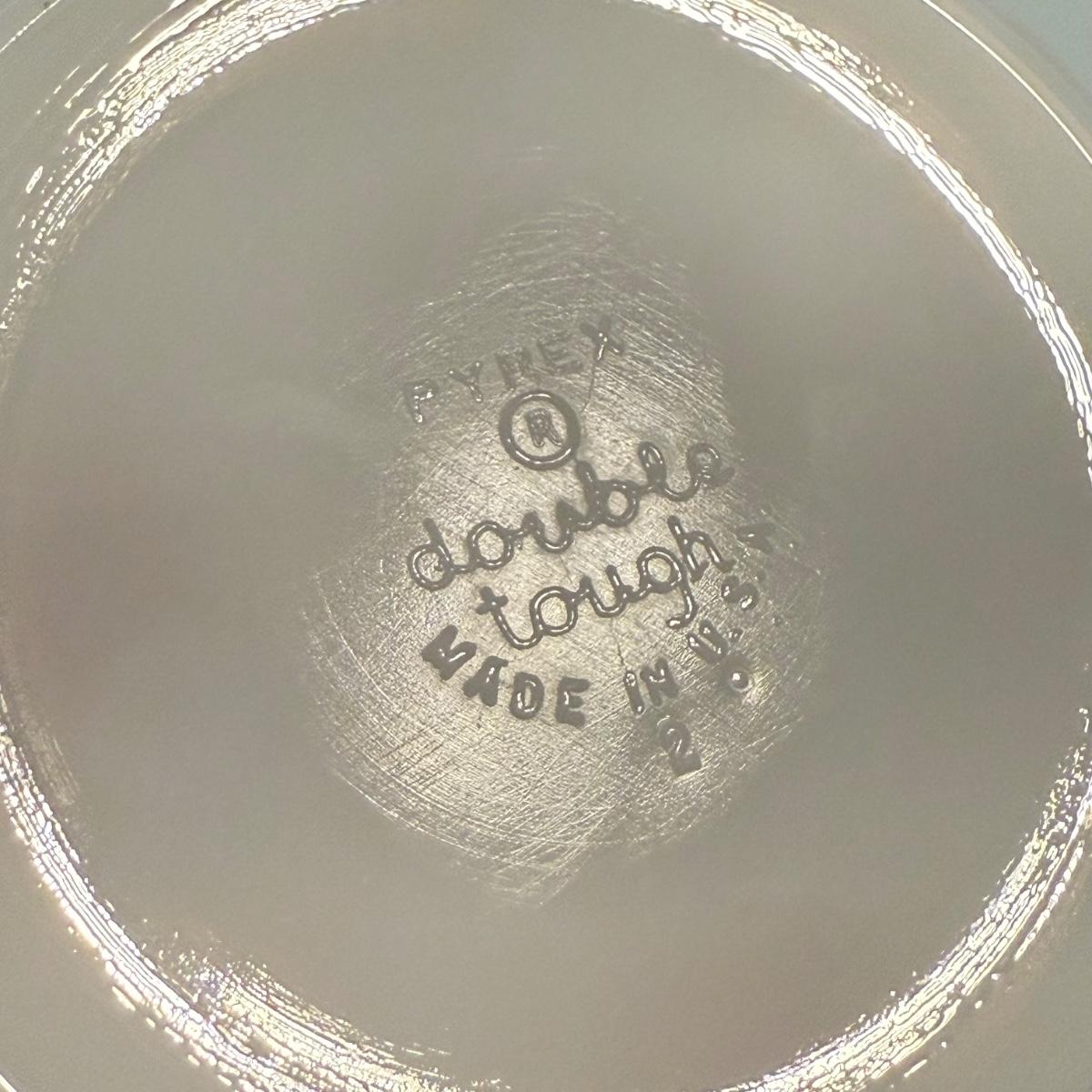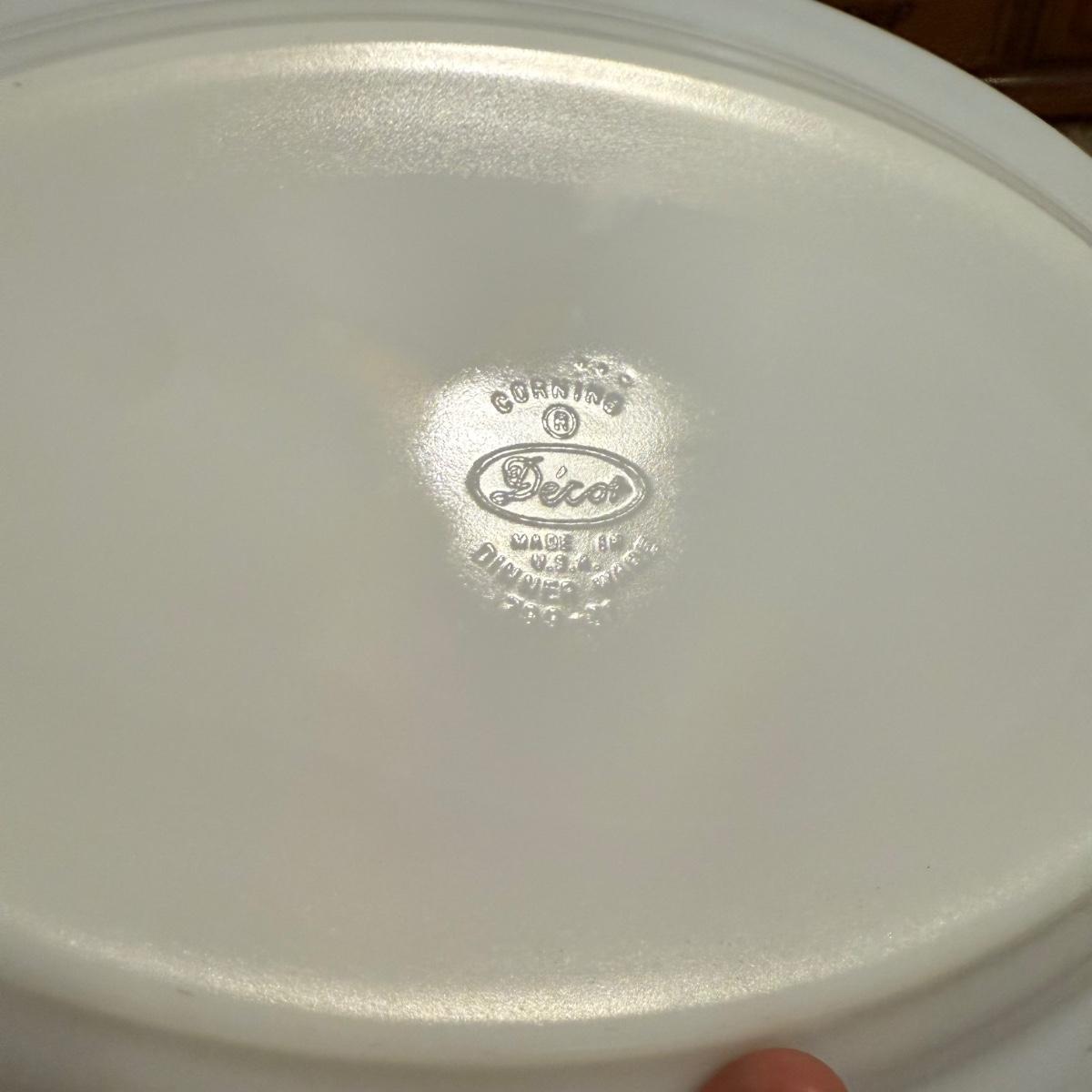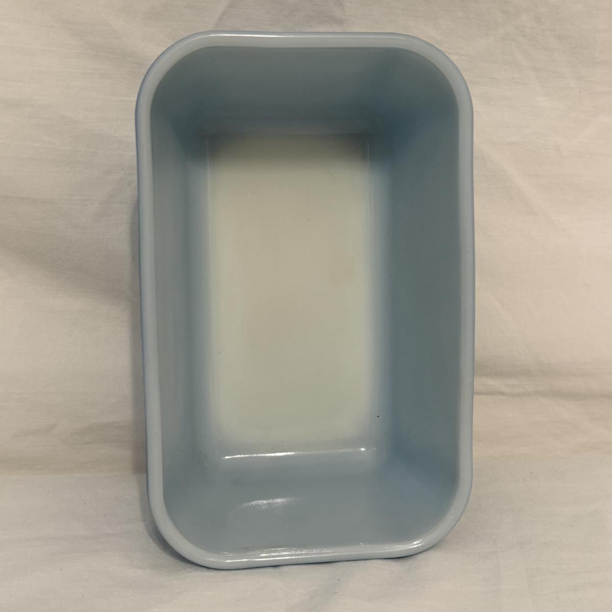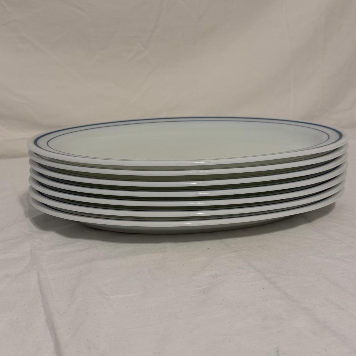 A variety of vintage Pyrex and Corning dishes with blue accents. There are seven oval Corning plates that are 12.5” x 9”. Their pattern has two blue bands. There are six Pyrex Double Tough 6.75”D turquoise plates, and one blue Pyrex loaf pan. The loaf pan has some light scratches in the blue exterior. The turquoise color on the Pyrex plates appears more blue in the photos than in person.
