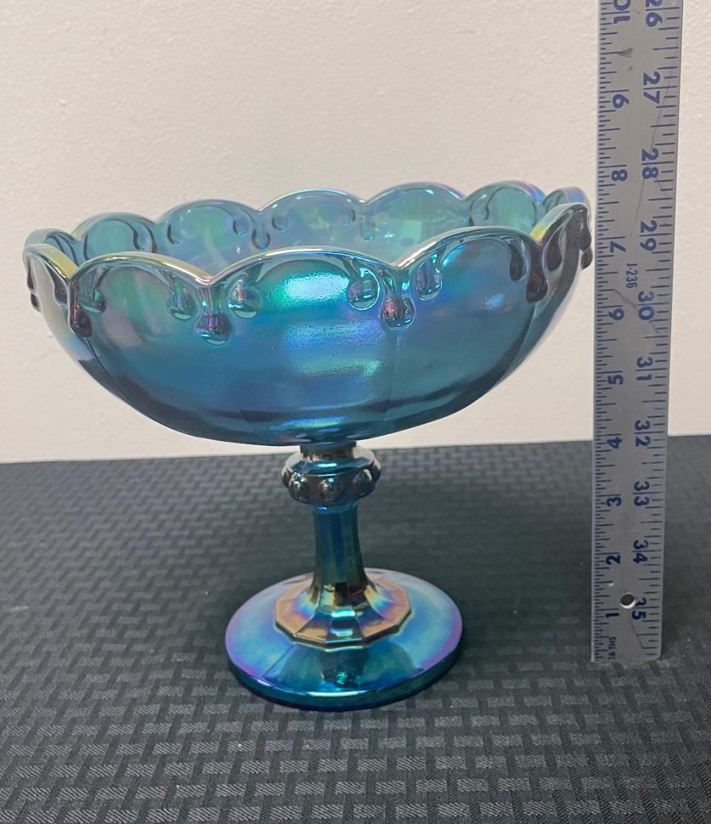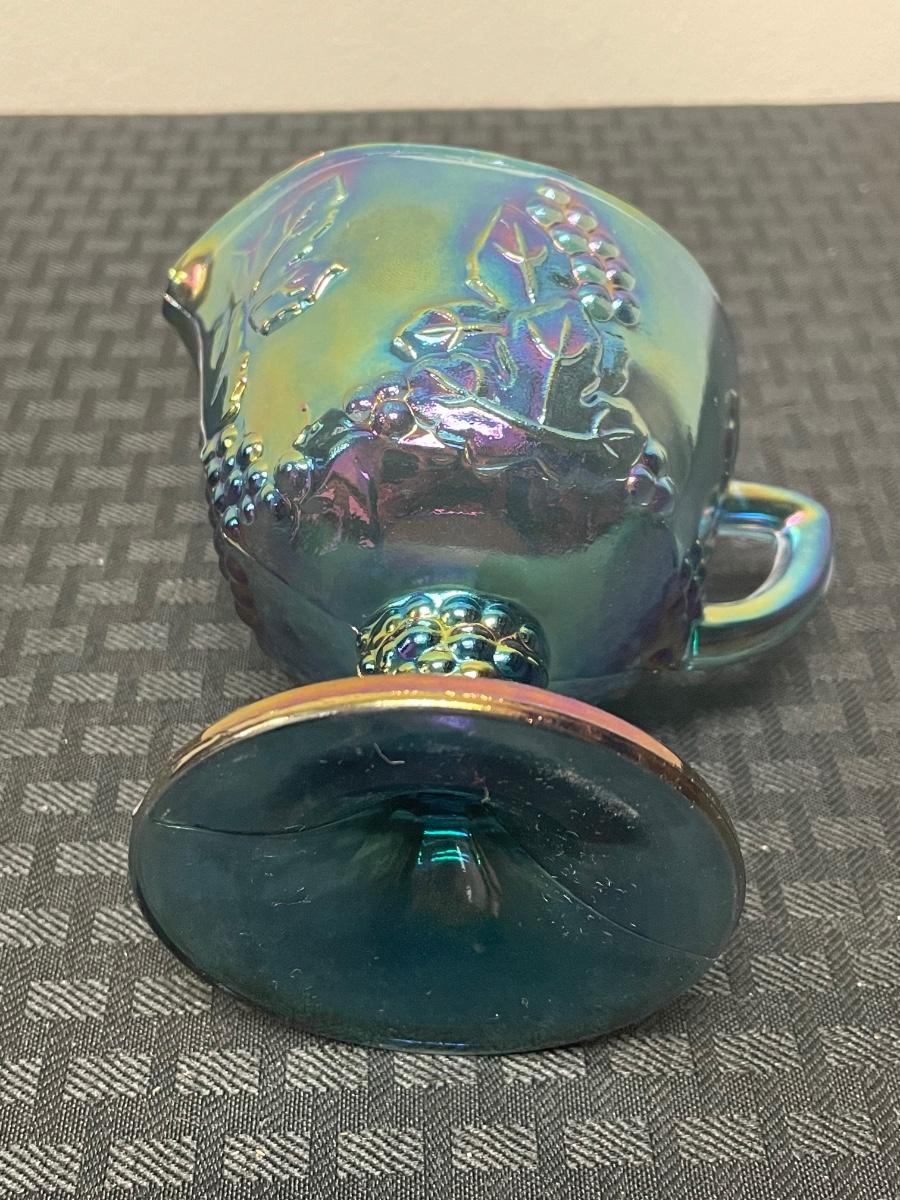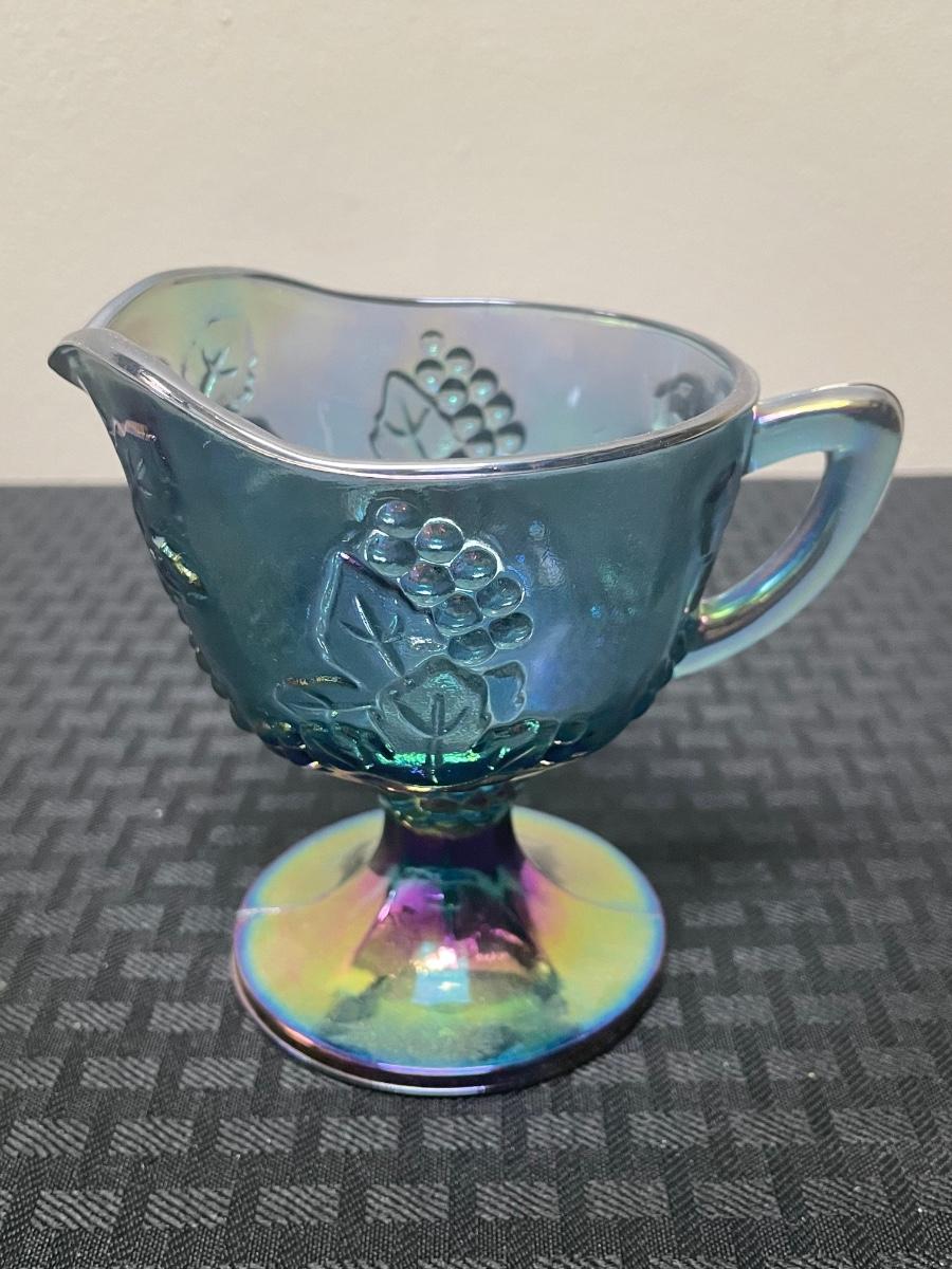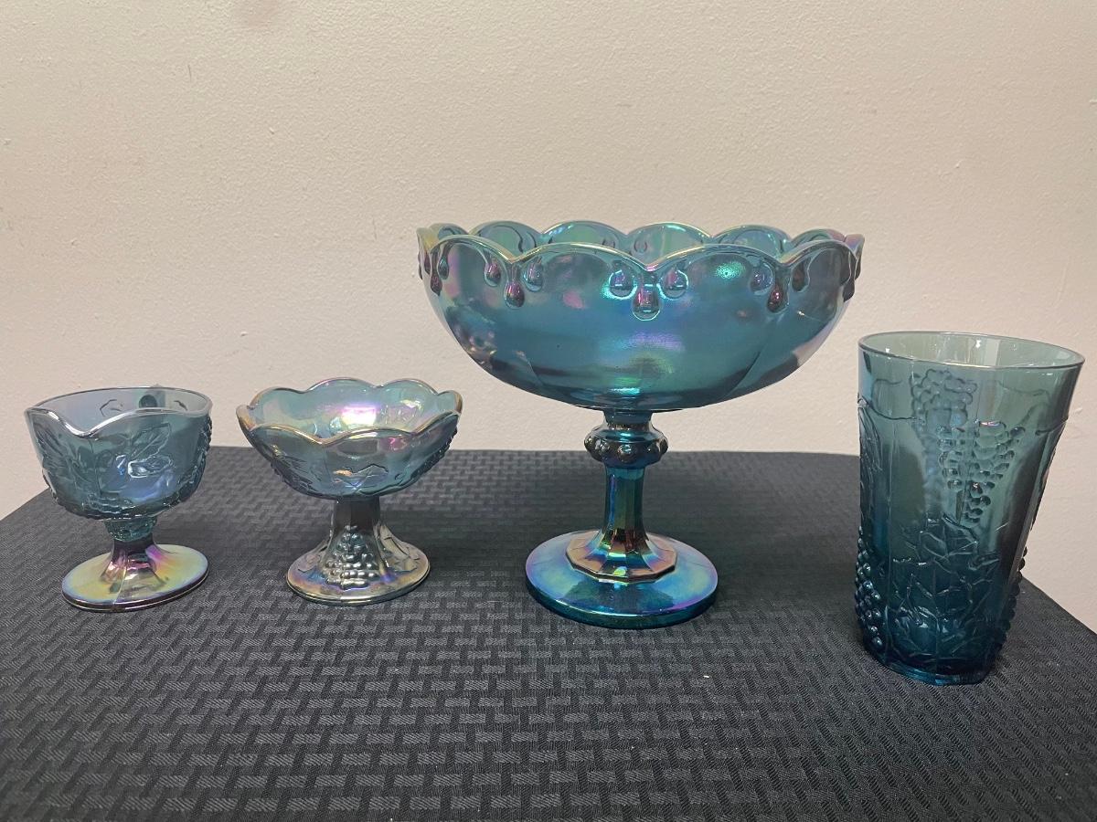 This set of four blue iridescent glasses includes: one compote pedestal bowl, one glass candleholder, a glass cup, and a glass cream pitcher. All items are in good condition but are a little dusty due to years of ownership. The compote is approximately 7.5” tall.