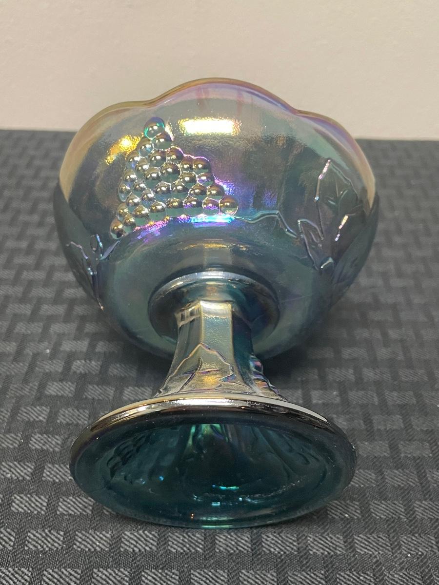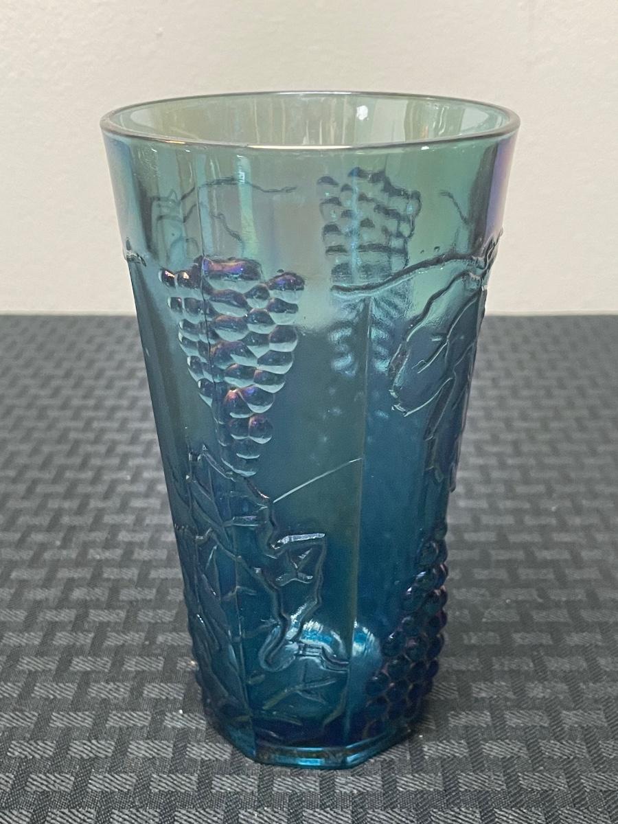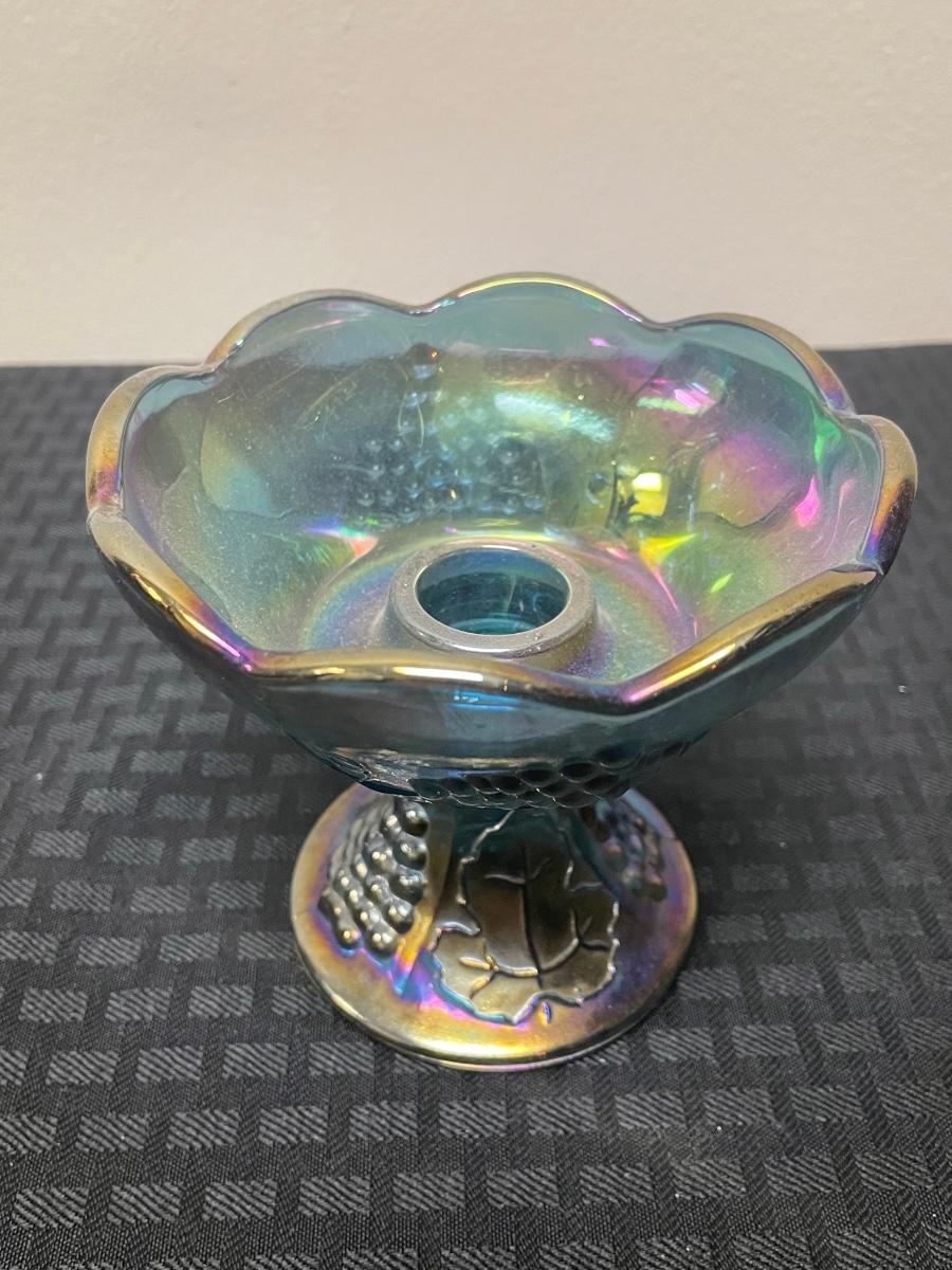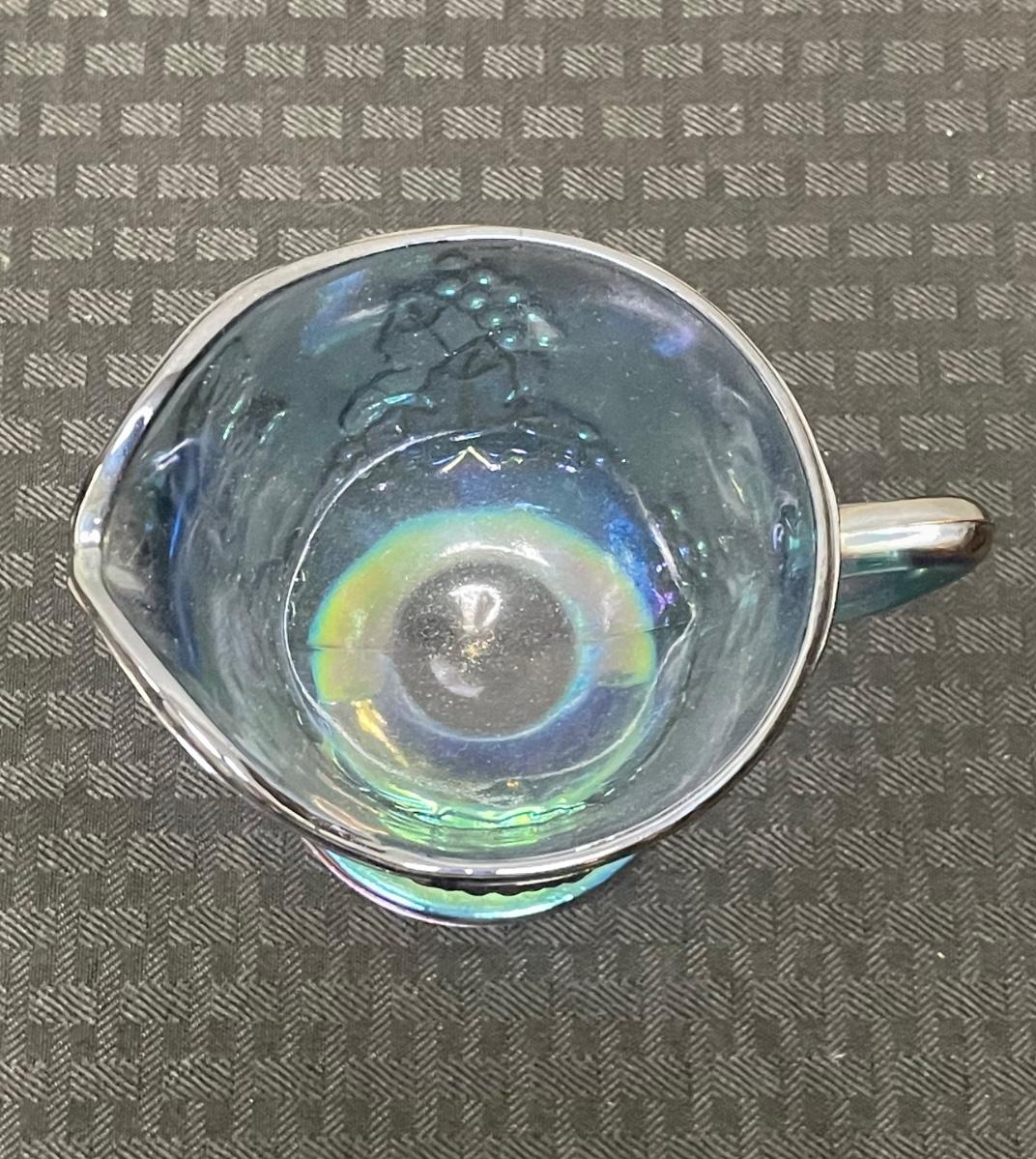 This set of four blue iridescent glasses includes: one compote pedestal bowl, one glass candleholder, a glass cup, and a glass cream pitcher. All items are in good condition but are a little dusty due to years of ownership. The compote is approximately 7.5” tall.