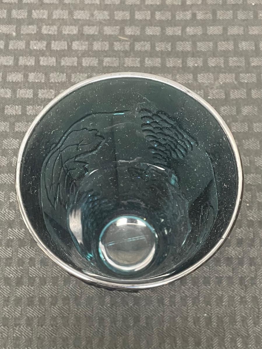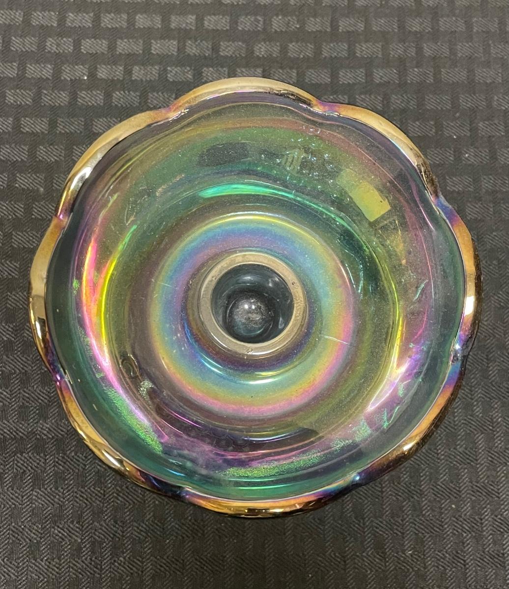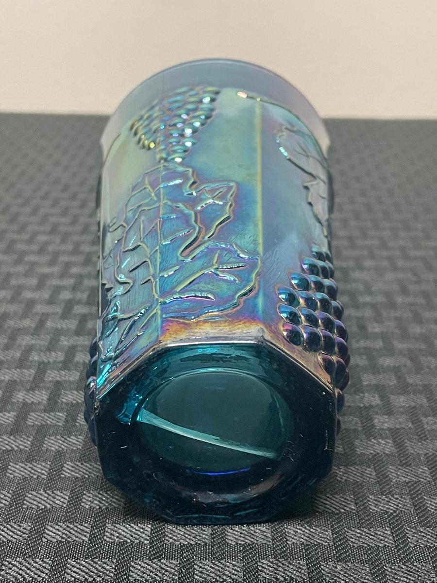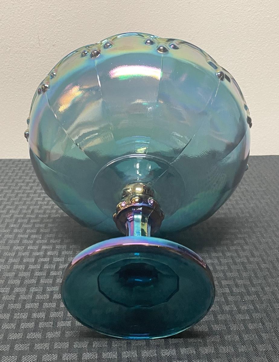 This set of four blue iridescent glasses includes: one compote pedestal bowl, one glass candleholder, a glass cup, and a glass cream pitcher. All items are in good condition but are a little dusty due to years of ownership. The compote is approximately 7.5” tall.