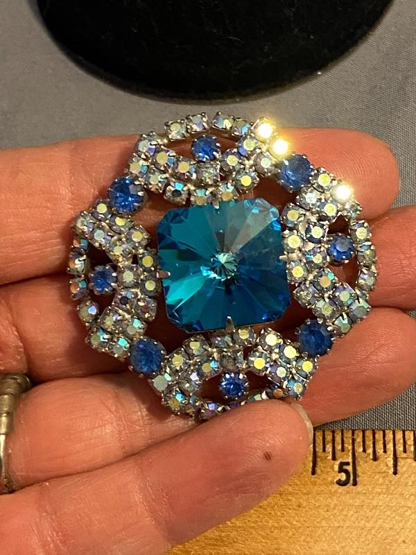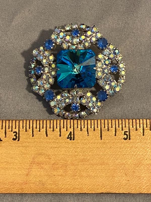 Vintage blue rhinestone brooch. Brilliant large blue center stone with small AB rhinestones. Almost 2" in size. Unbranded.