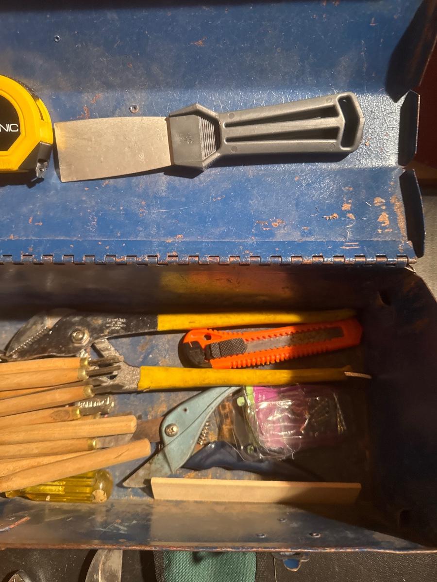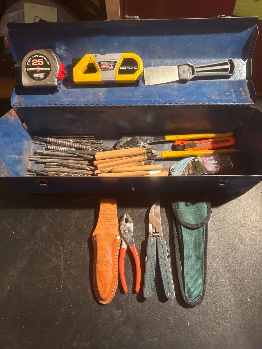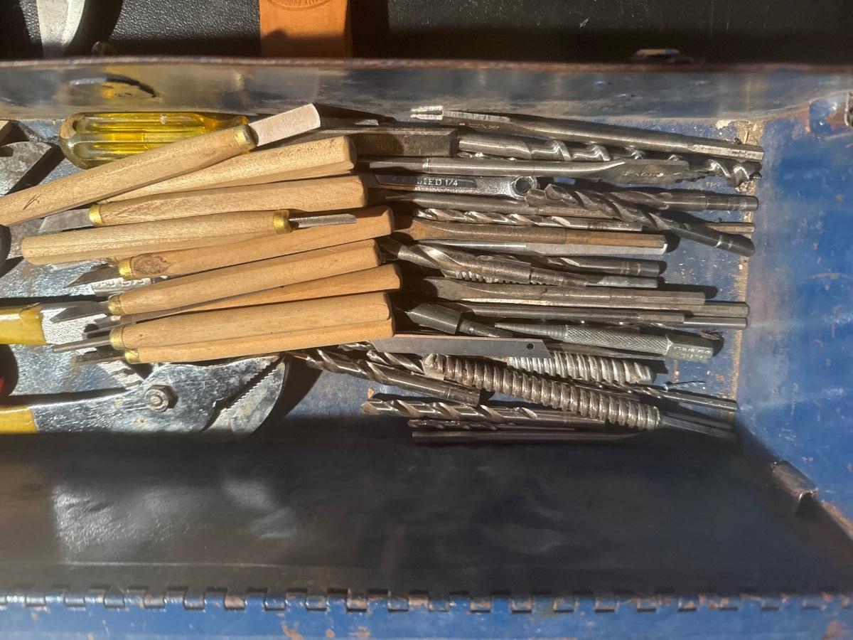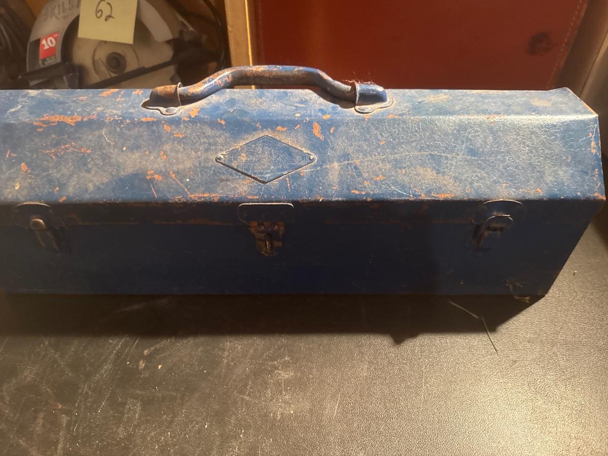 Vintage blue metal toolbox with tools
