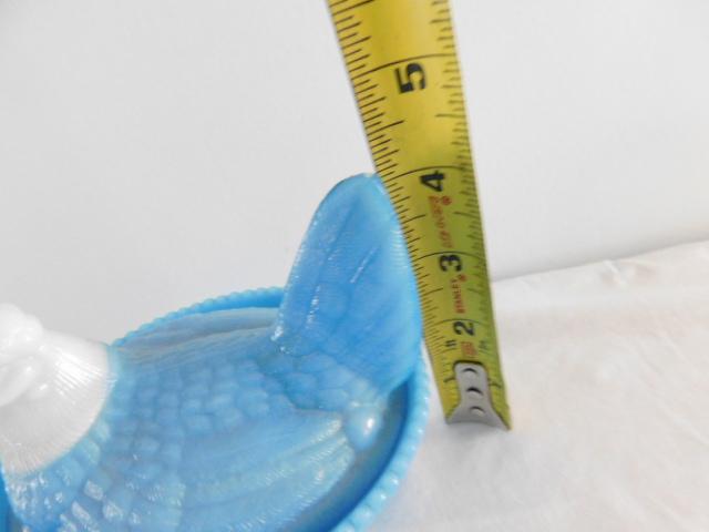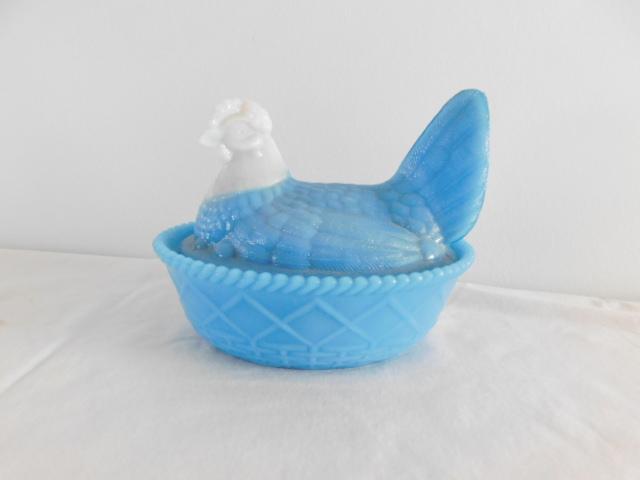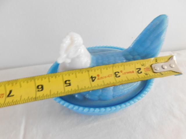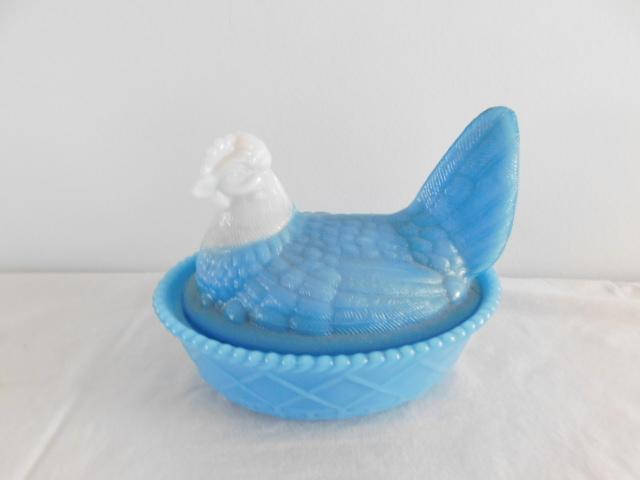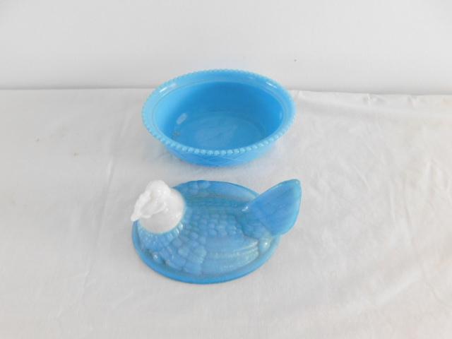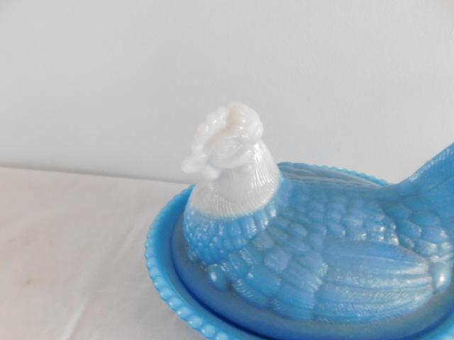 Vintage Blue Milk Glass Dominant Nesting Hen with White Head