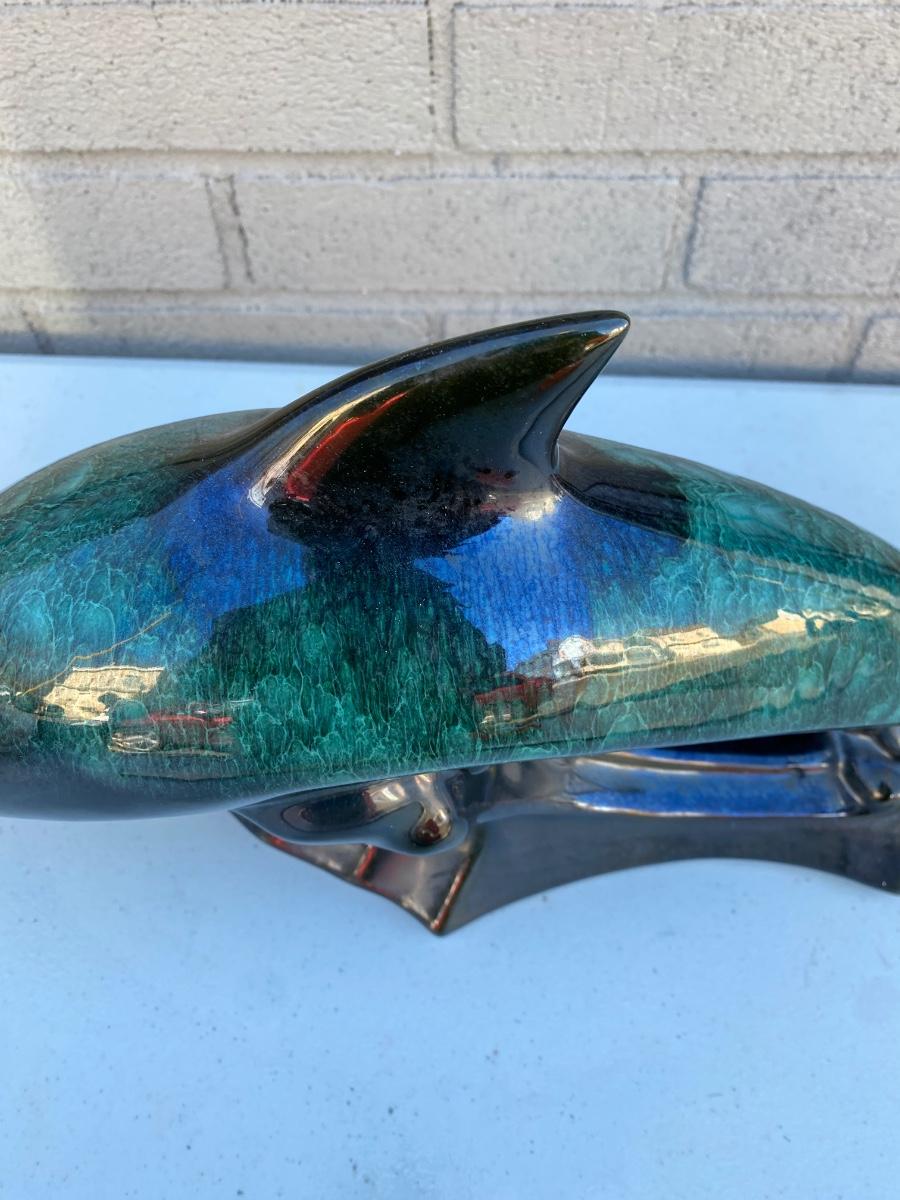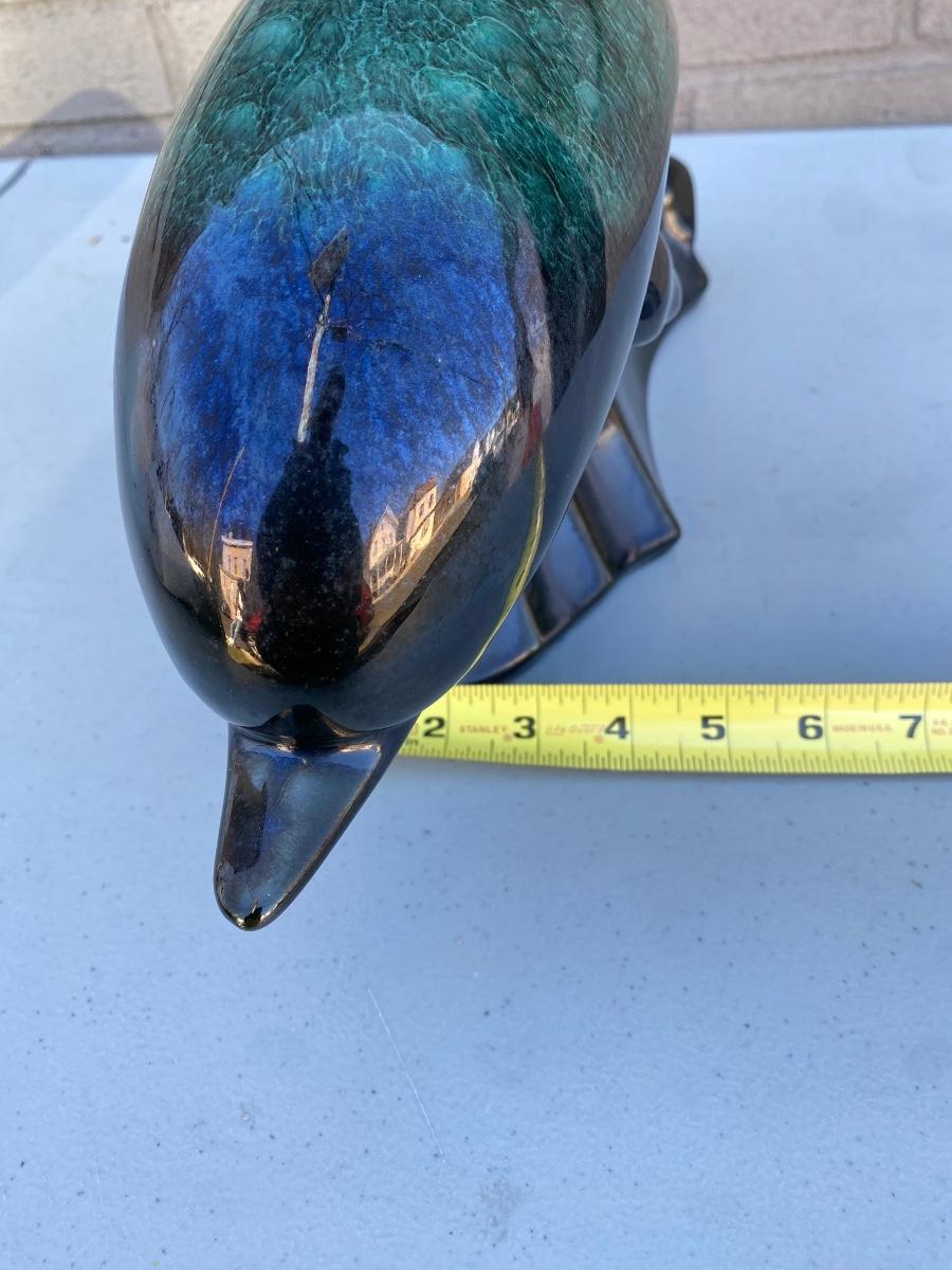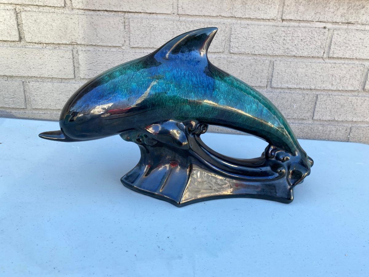 Vintage Blue Mountain Pottery Leaping Dolphin Figurine Black Green Glaze Ceramic. Red clay figurine drip glazed with rich sea green tones