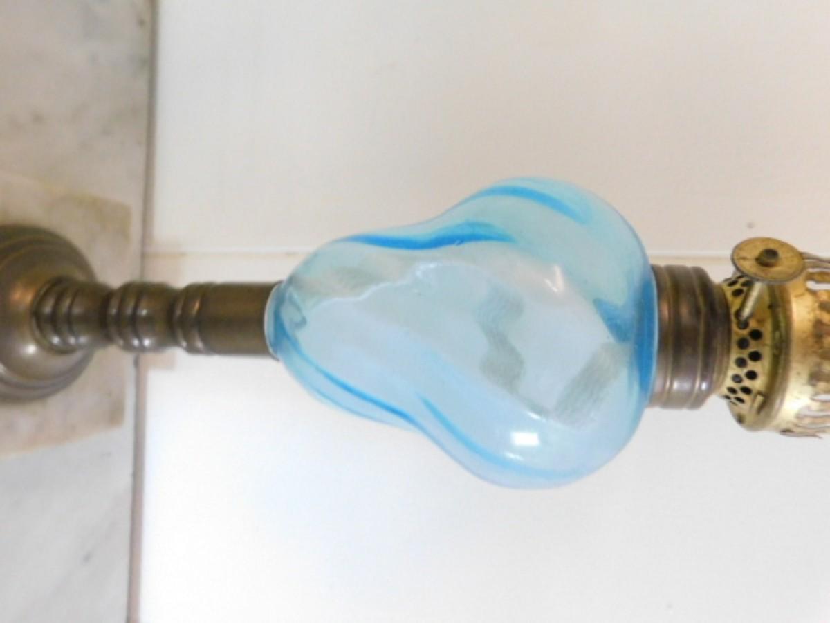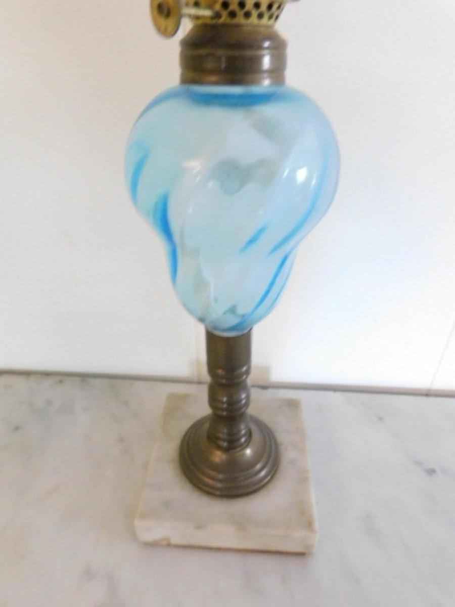 Vintage Blue Pear Glass Post Oil Lamp with Brass Pedestal and Marble Base