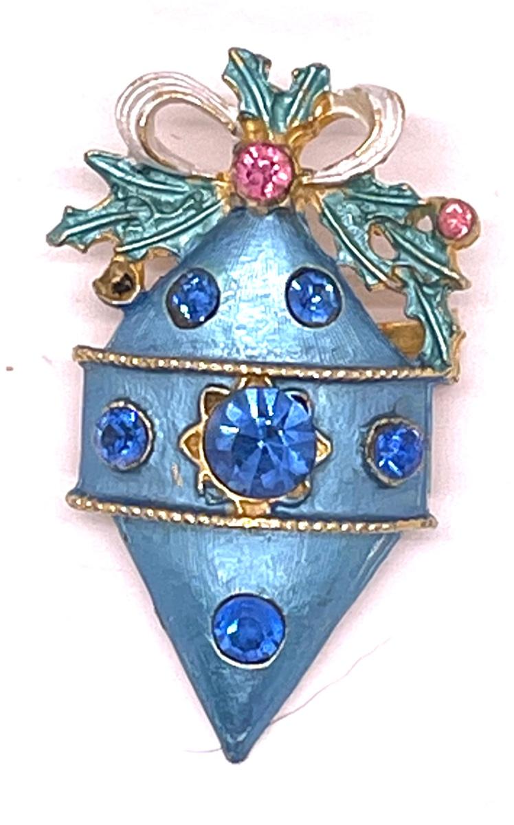 Vintage Blue Rhinestone Christmas Ornament Brooch Pin. Looks like it is missing a small pink stone. Unbranded.