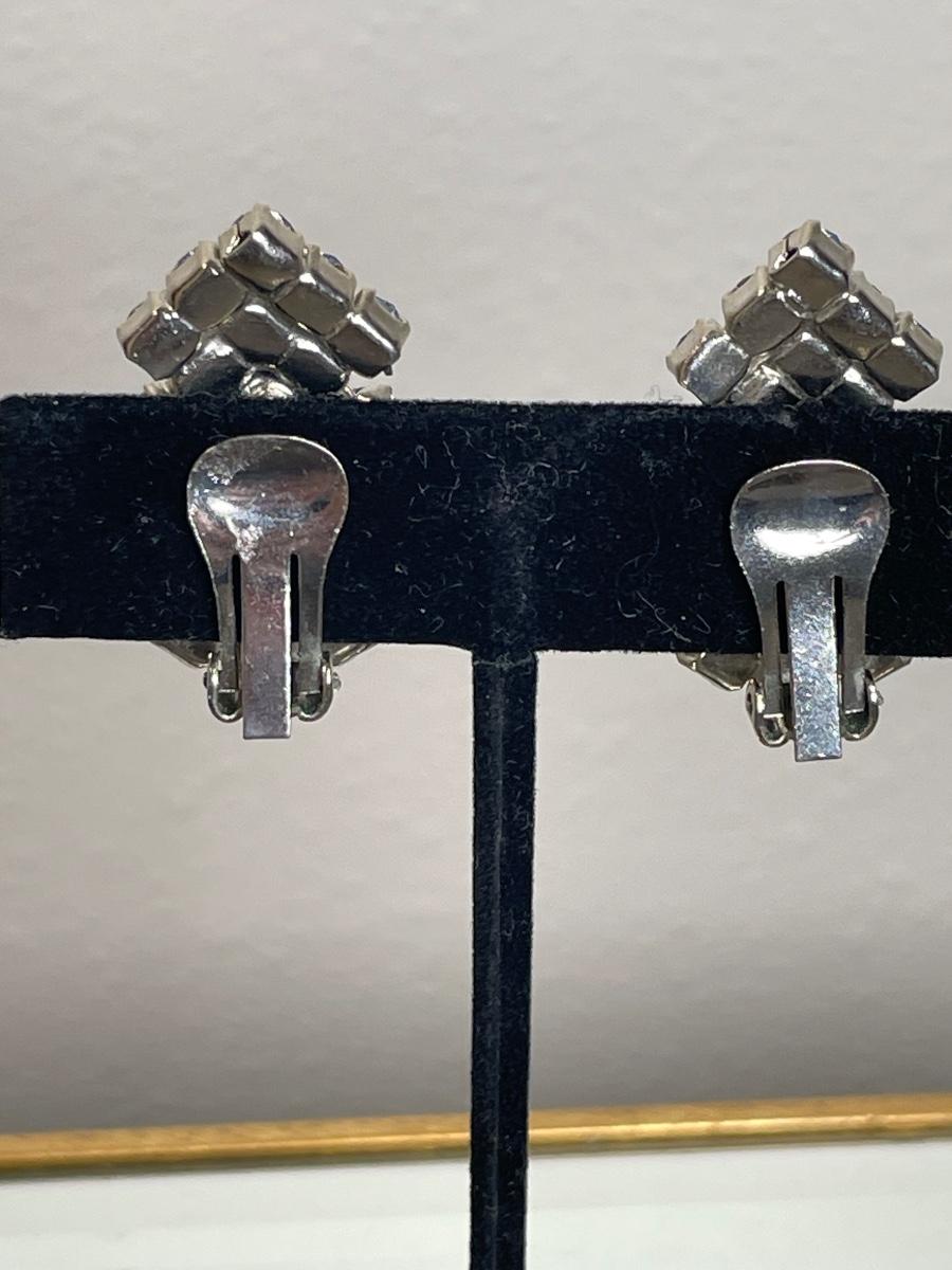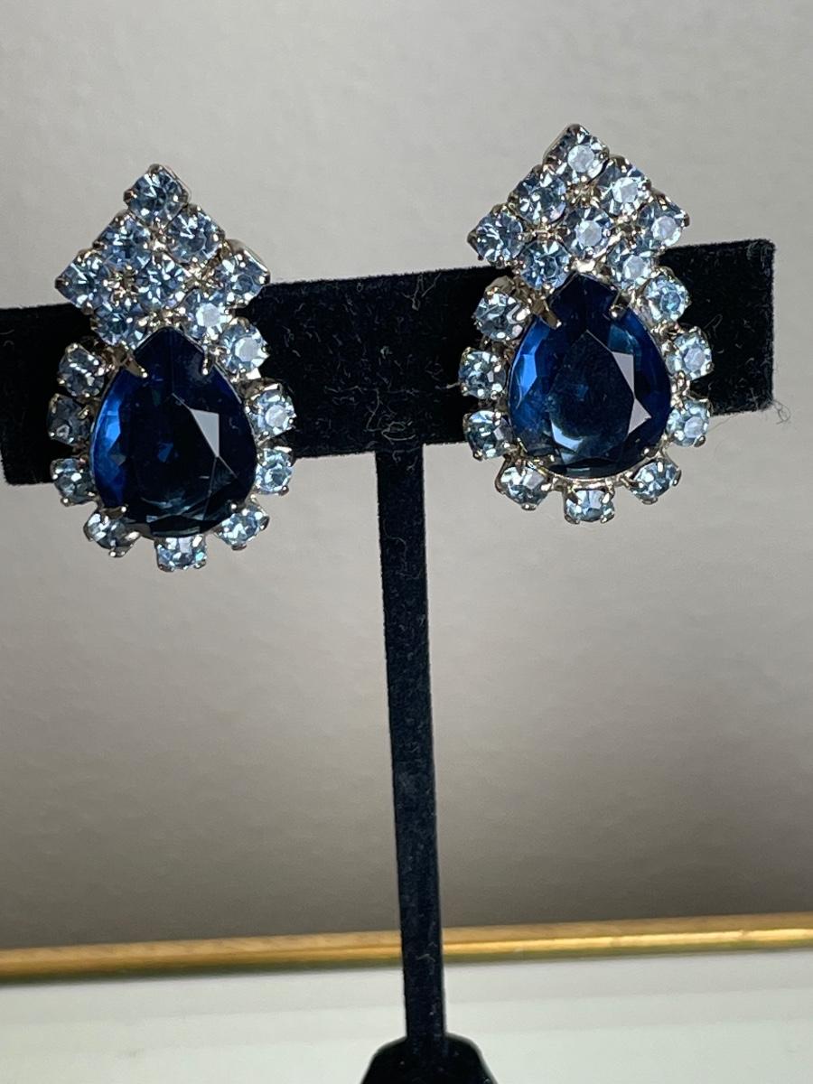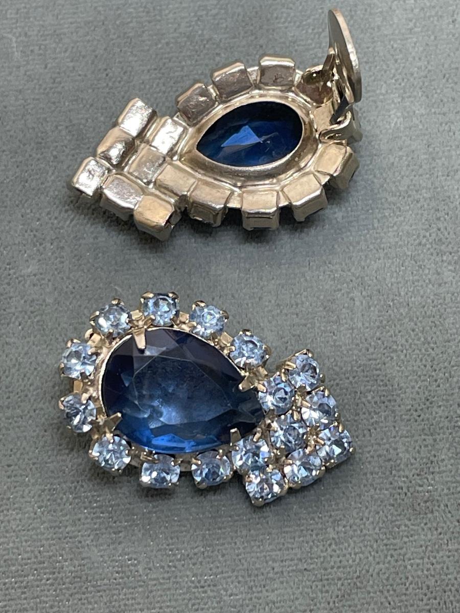 With large dark blue open back stones in silver tone metal. 1 1/4” long. Clip style