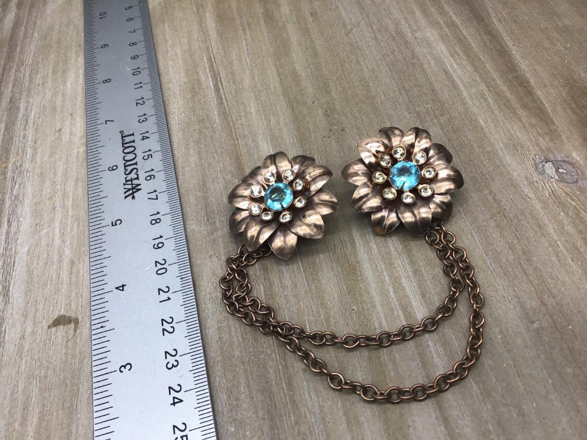 VINTAGE - BLUE RHINESTONE & GOLDTONE-COPPER FLORAL SWEATER BROOCH