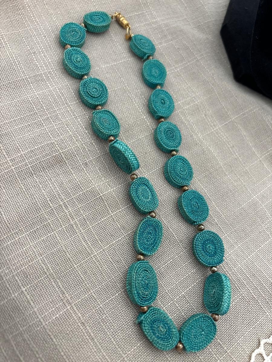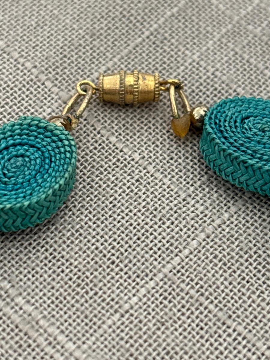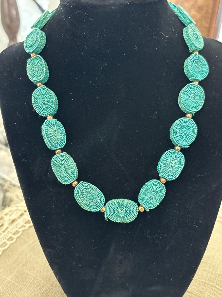Vintage blue ribbon wrapped up gold tone necklace