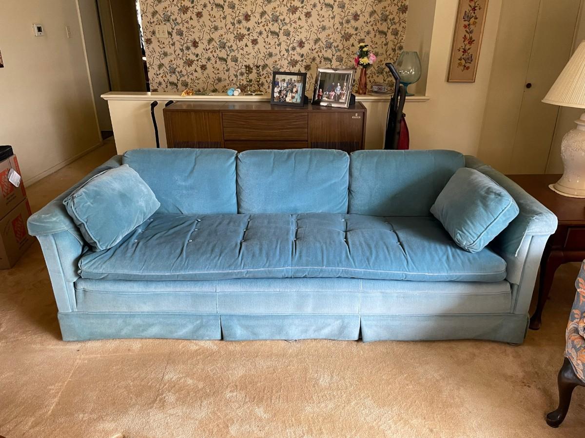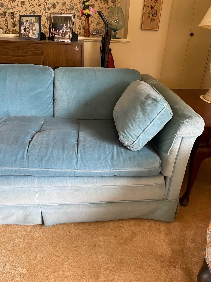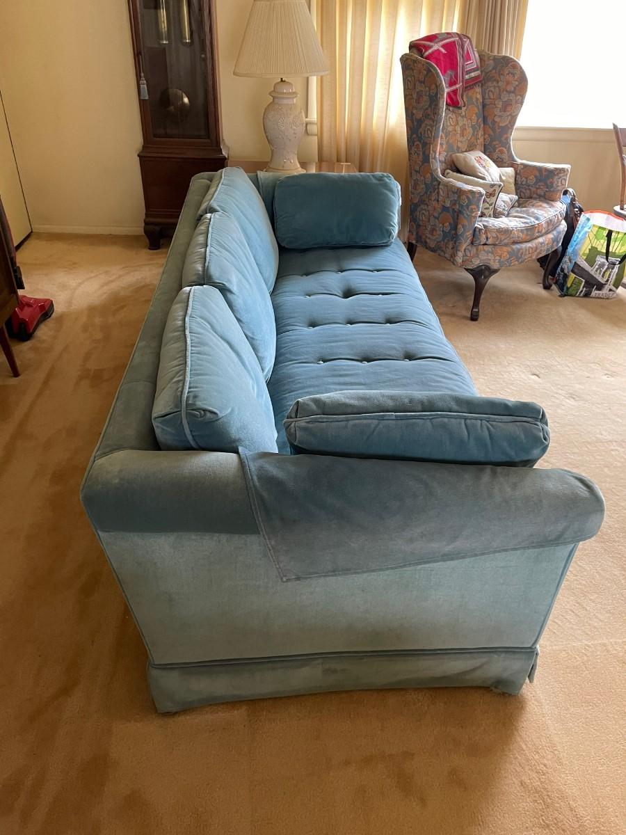 Tufted cushion which is detached from sofa. 84L x 36W x 24H. Clean and comfortable! Much more beautiful in person! It's not faded, stained or dirty.