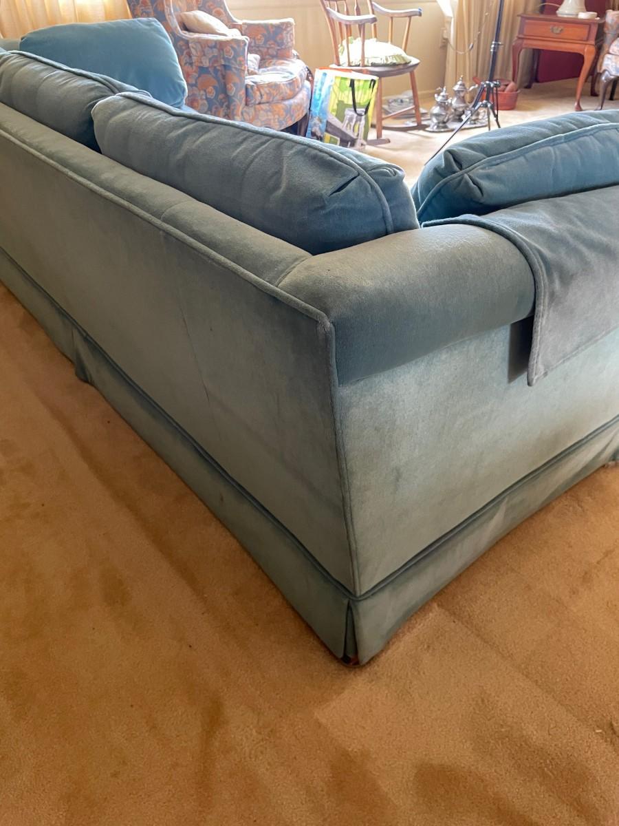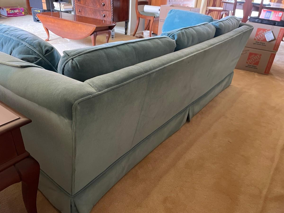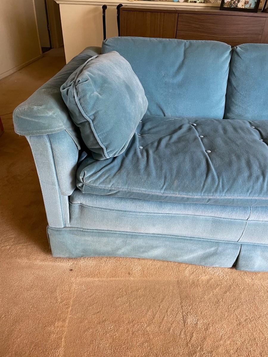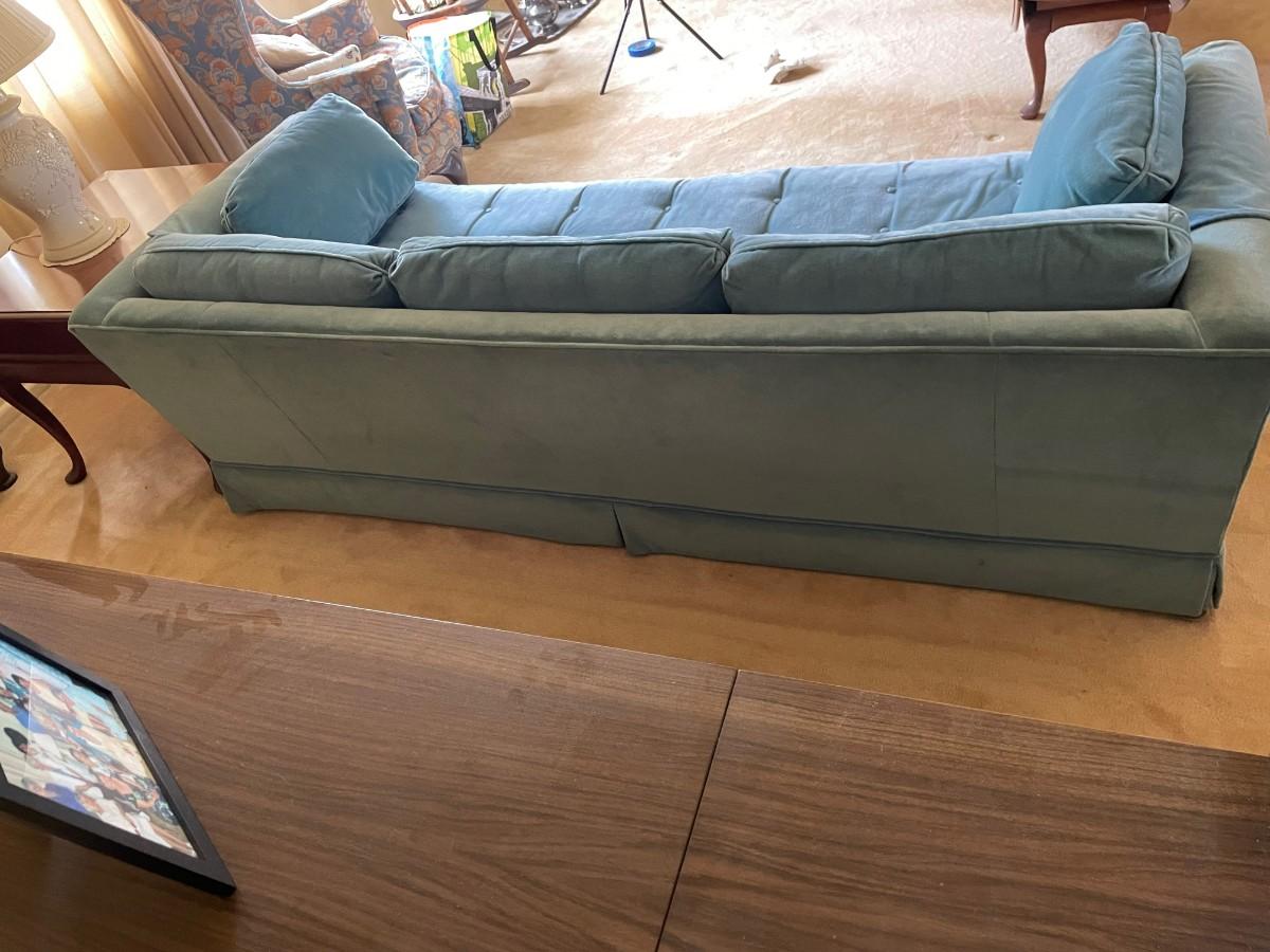 Tufted cushion which is detached from sofa. 84L x 36W x 24H. Clean and comfortable! Much more beautiful in person! It's not faded, stained or dirty.