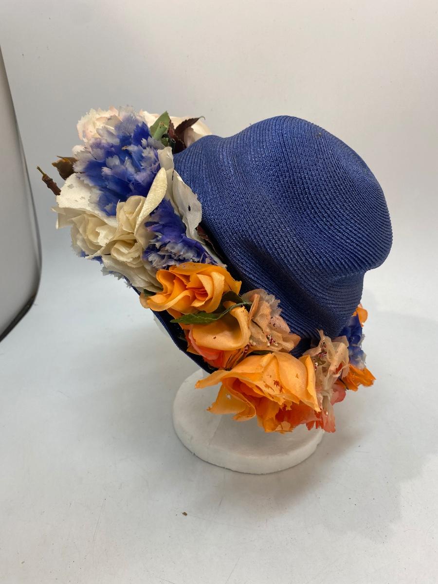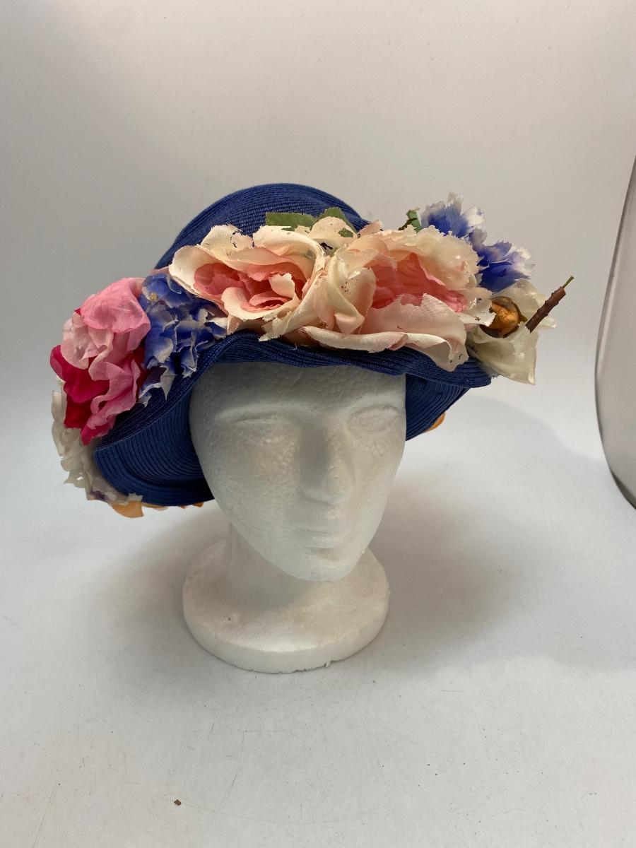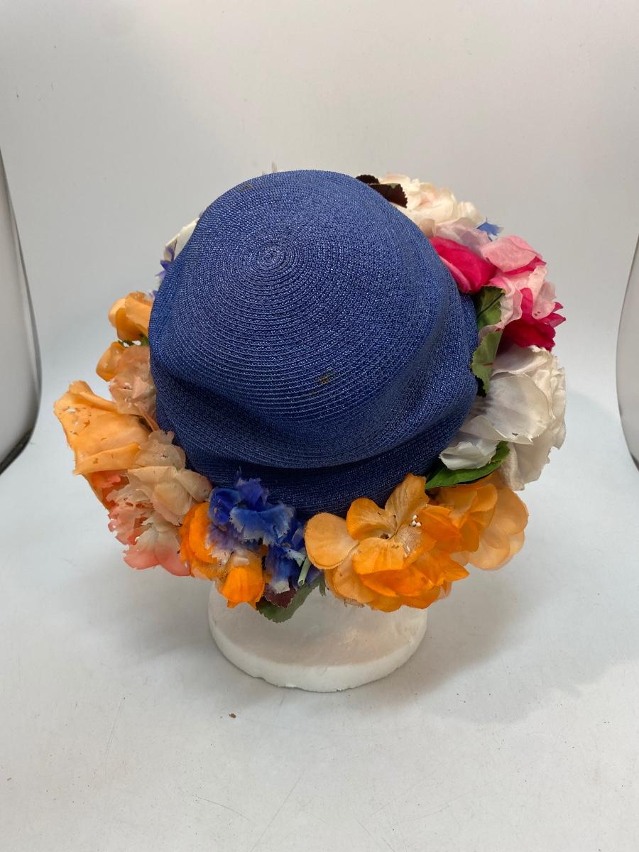 Vintage Blue Straw Like Hat w Faux Artificial Flowers by Evelyn Varon. Royal blue basket weave hat with large faux flowers around the brim. Not sure if flowers were original or added, found a similar Evelyn Varon hat without the flowers. Flowers do have moth holes. Tag inside.