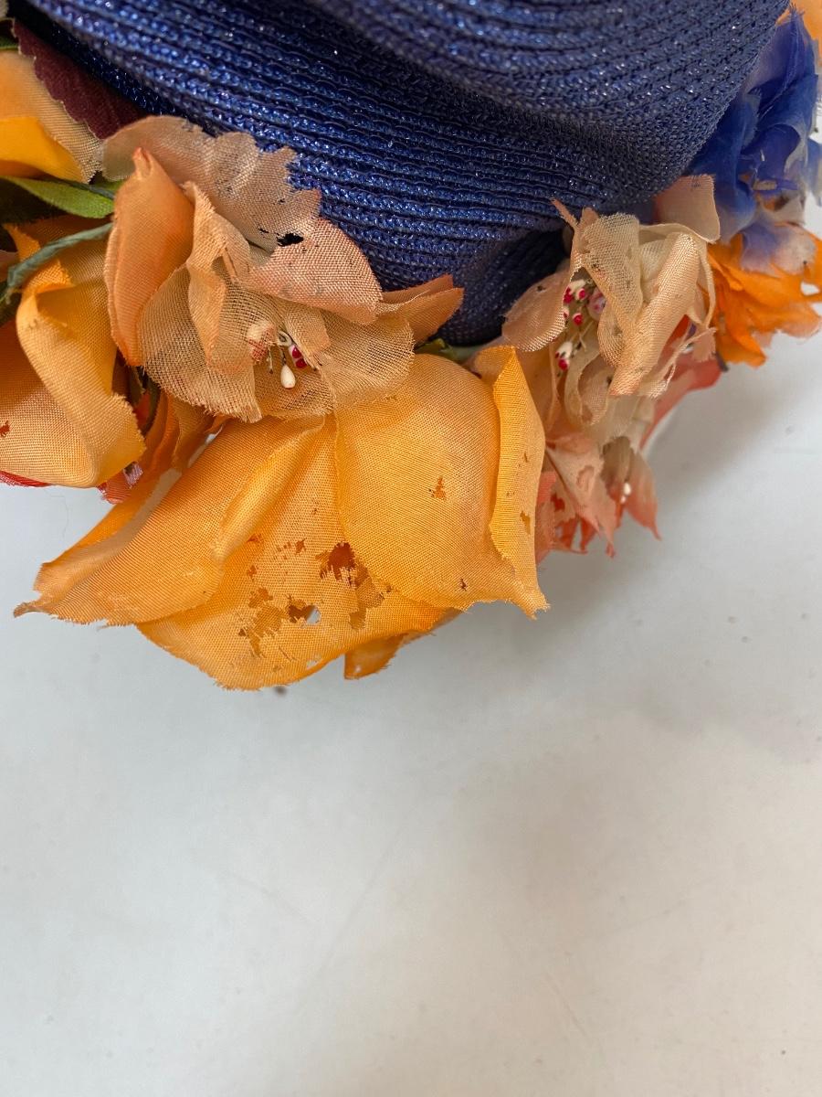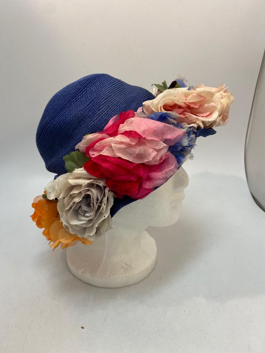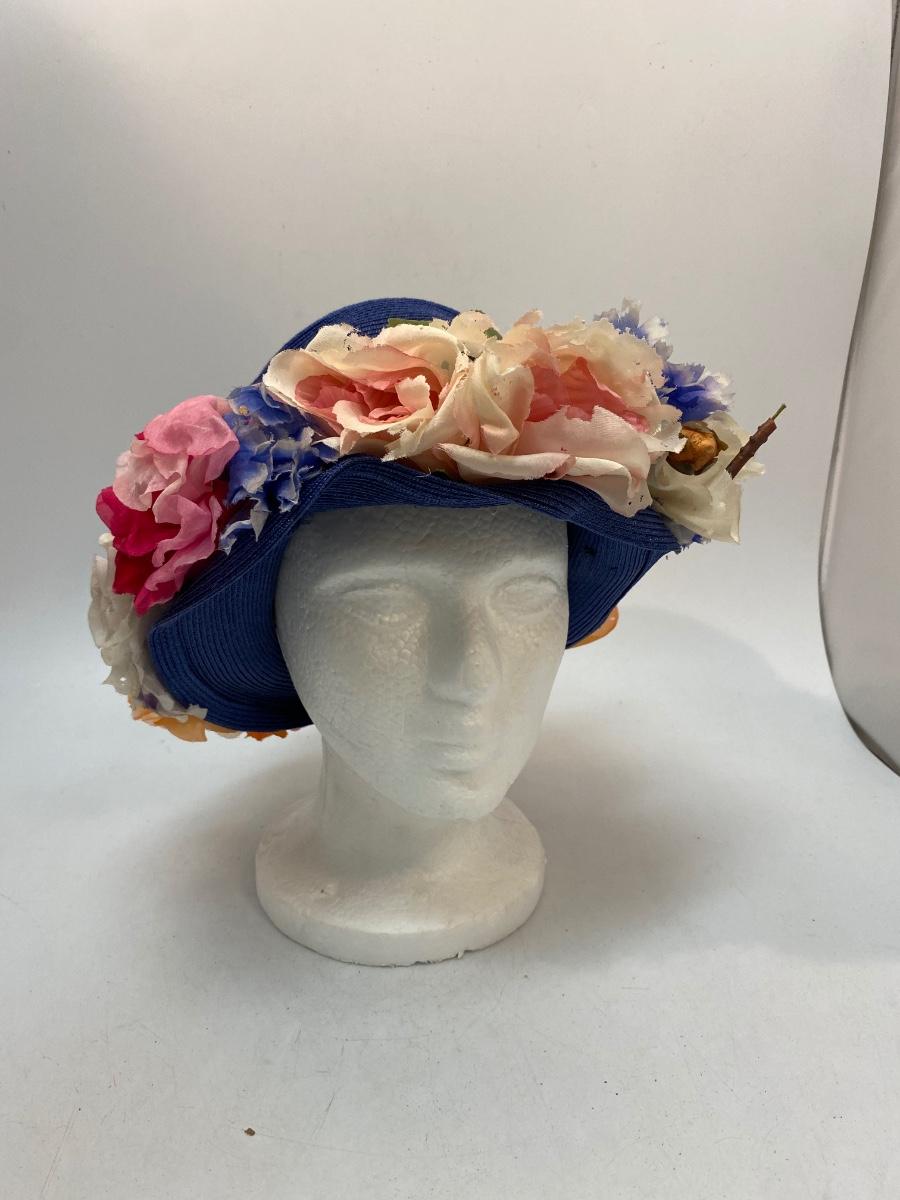 Vintage Blue Straw Like Hat w Faux Artificial Flowers by Evelyn Varon. Royal blue basket weave hat with large faux flowers around the brim. Not sure if flowers were original or added, found a similar Evelyn Varon hat without the flowers. Flowers do have moth holes. Tag inside.
