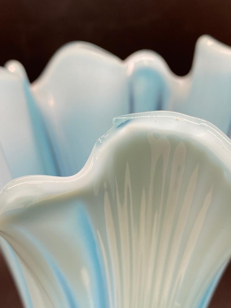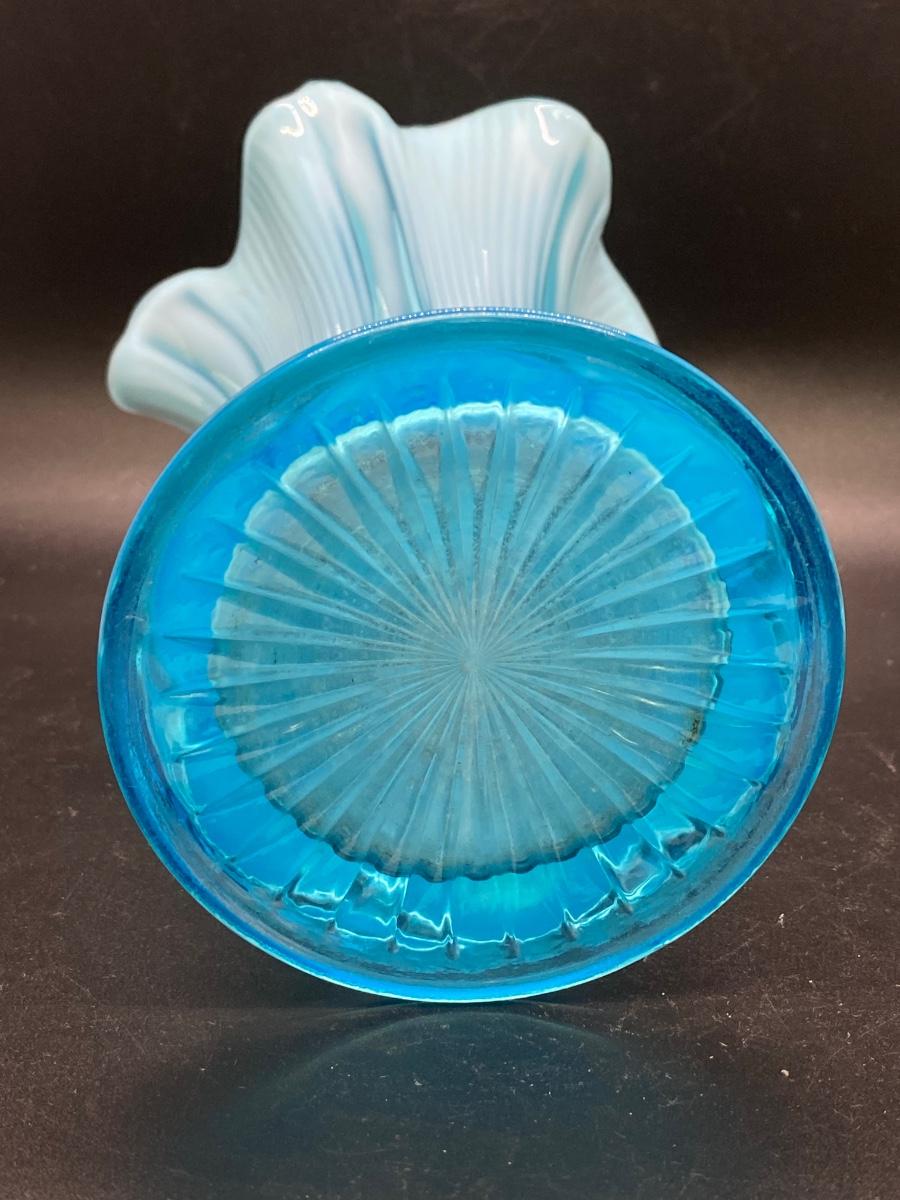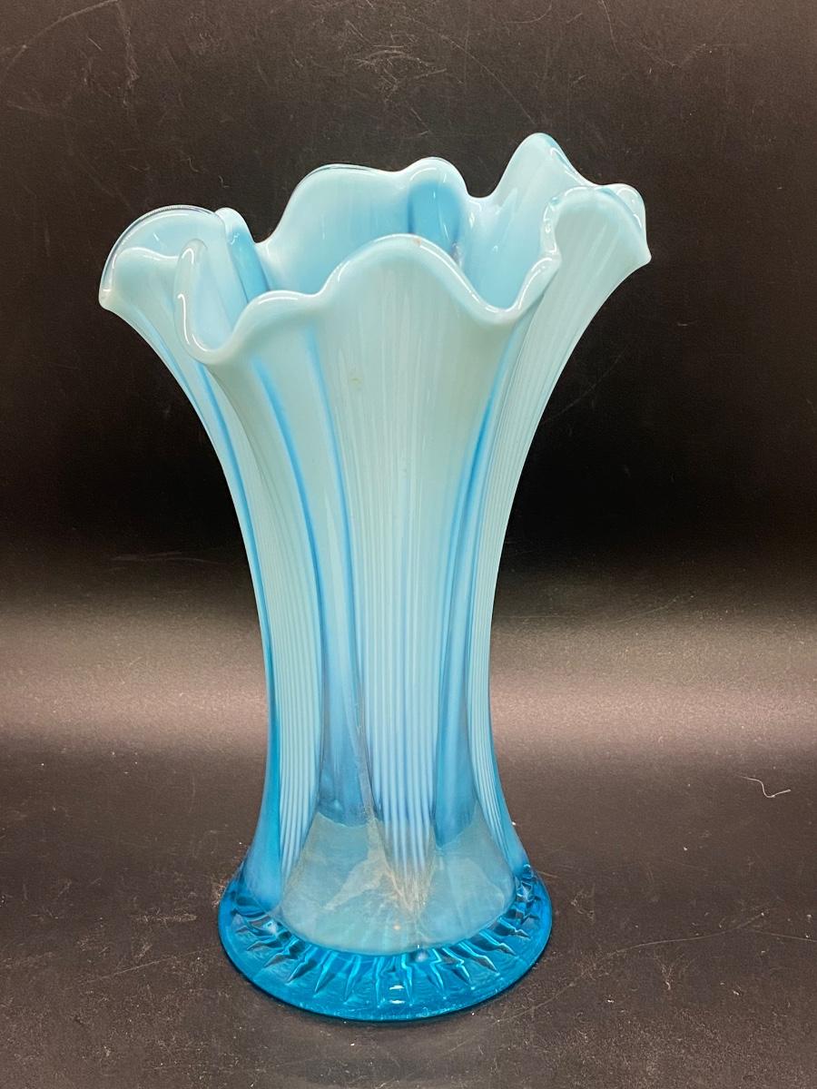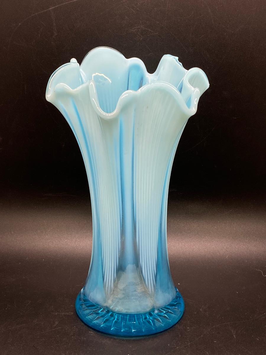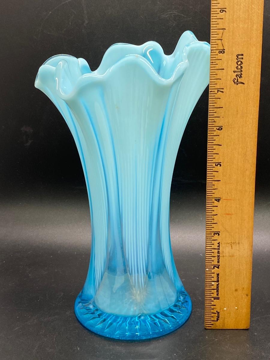 Vintage blue to white opalescent swung vase. Squatty fine ribbed vase looks to be from Jefferson Glass. About 8" tall. There is a spot along the rim that has a point, doesn't feel like damage but it is a rough spot. Displays nicely.
