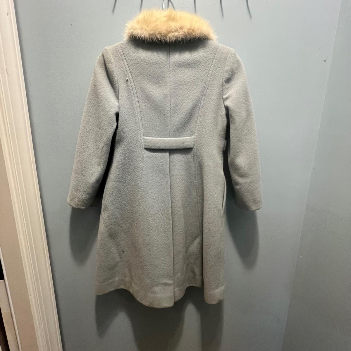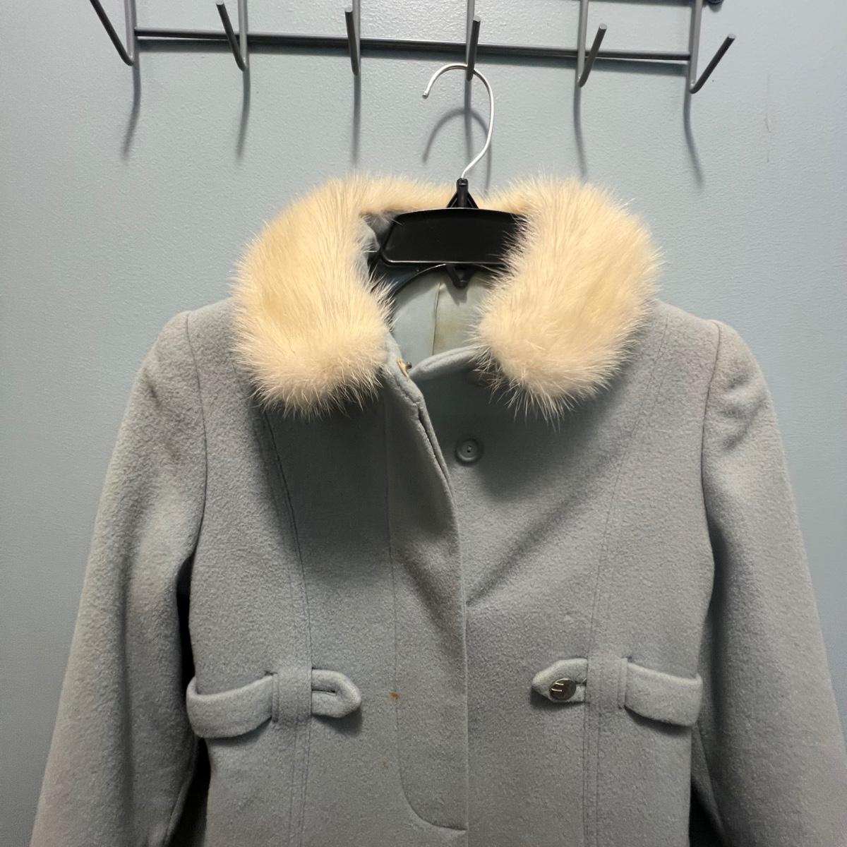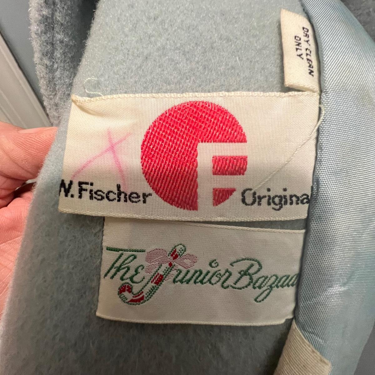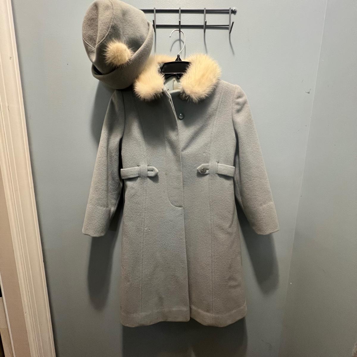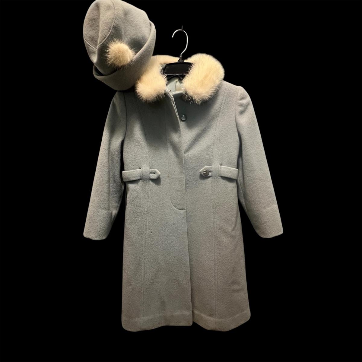 This vintage wool F.W. Fischer coat is a Junior size 10 and a baby blue color with a fur or fur like collar. It comes with a matching hat. Both jacket and hat have a silk lining. A few issues on both such as small holes and a few stains also on the jacket. A new with tags Neiman Marcus cashmere scarf, a faux fur scarf and a corduroy Stetson hat complete this lot.