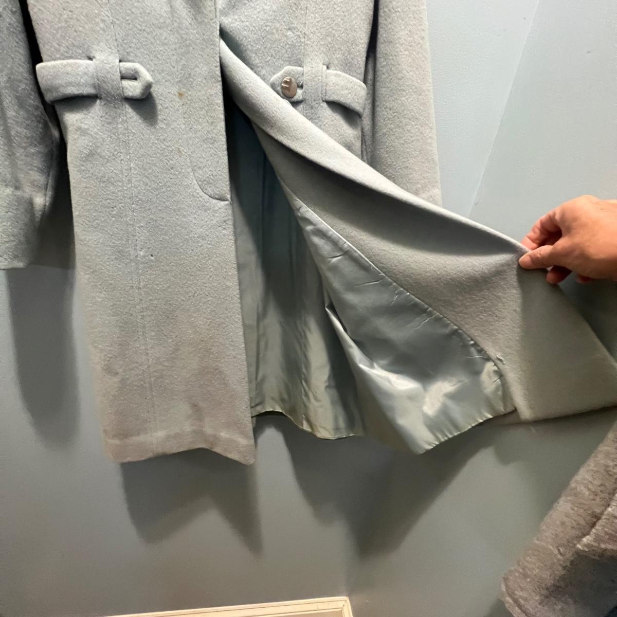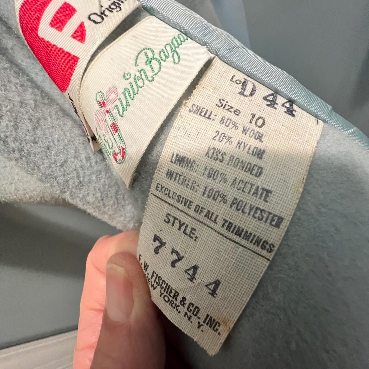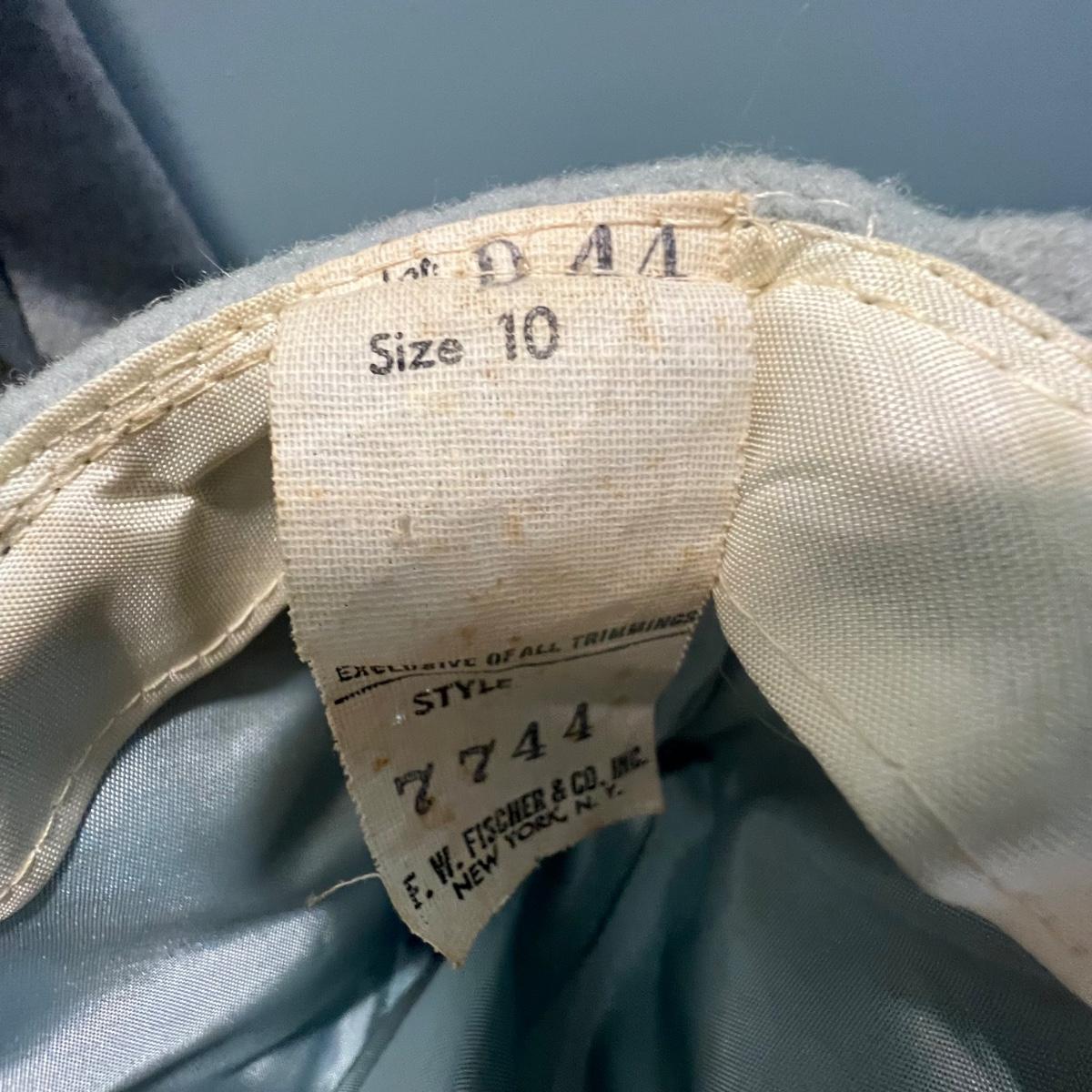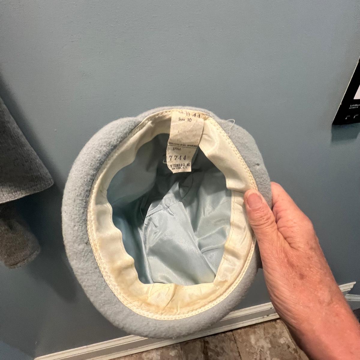 This vintage wool F.W. Fischer coat is a Junior size 10 and a baby blue color with a fur or fur like collar. It comes with a matching hat. Both jacket and hat have a silk lining. A few issues on both such as small holes and a few stains also on the jacket. A new with tags Neiman Marcus cashmere scarf, a faux fur scarf and a corduroy Stetson hat complete this lot.