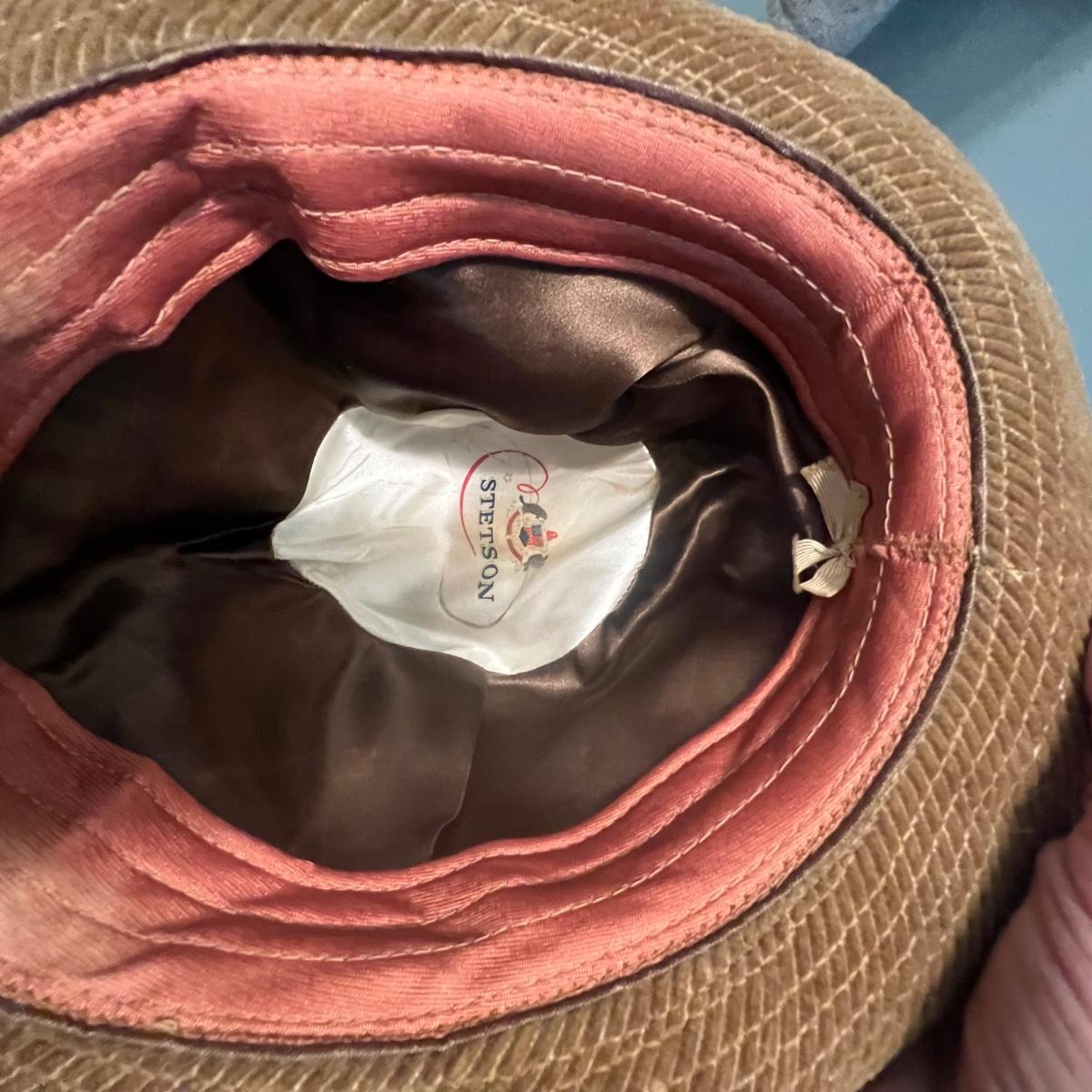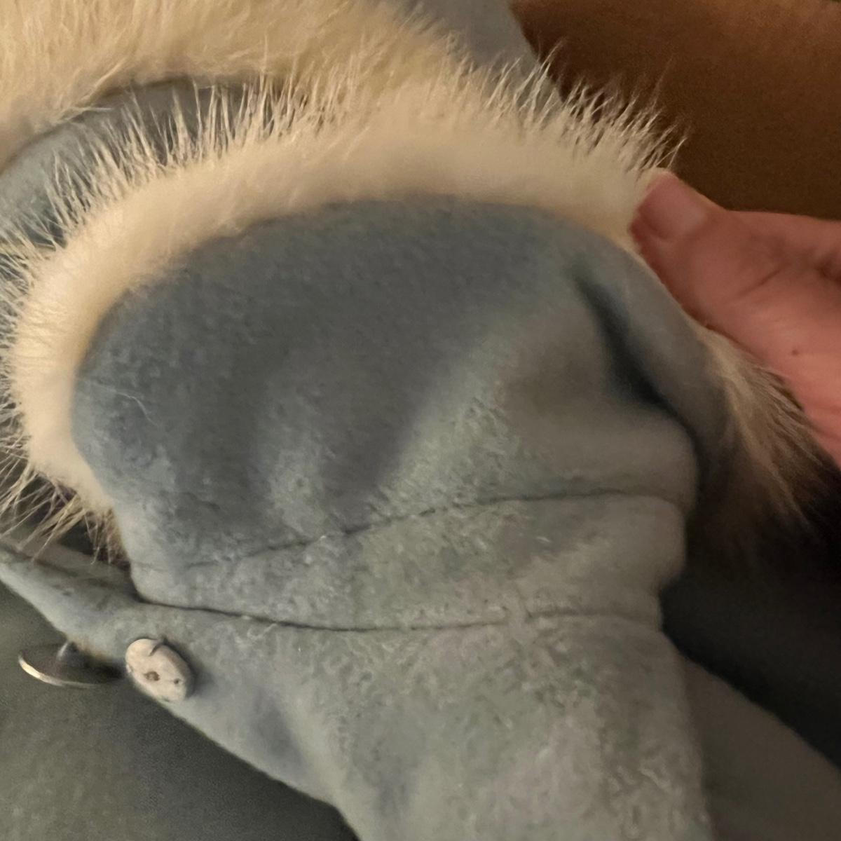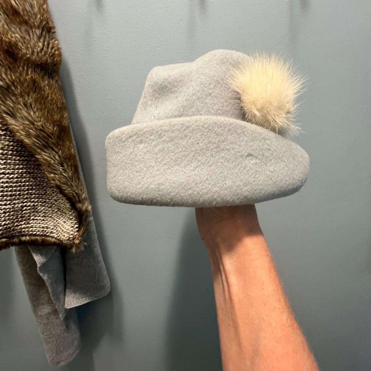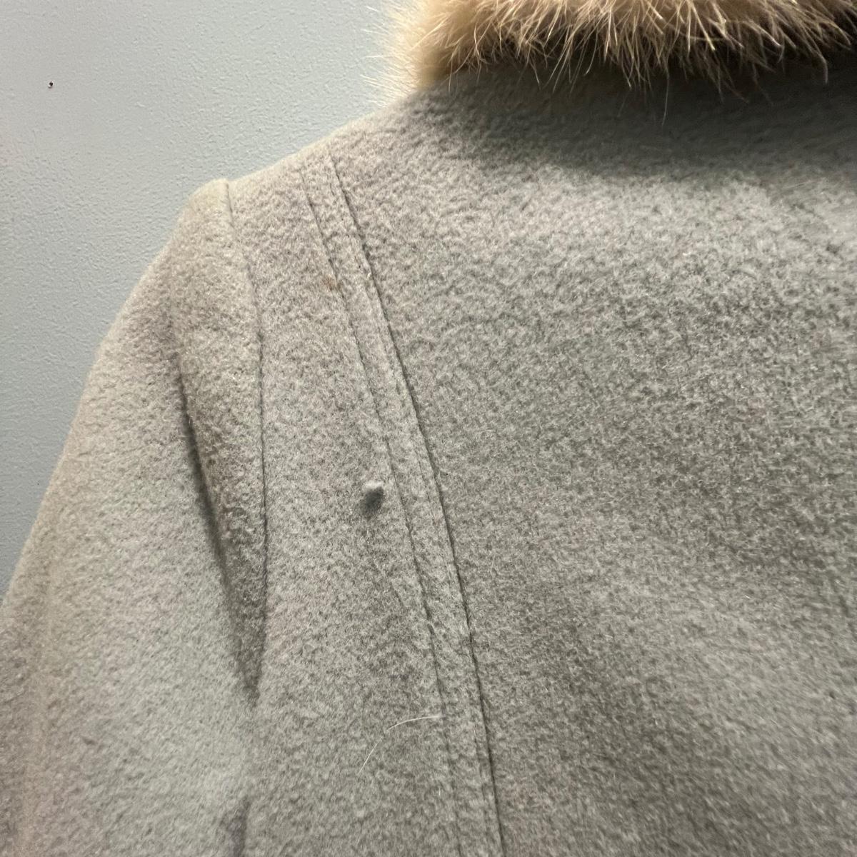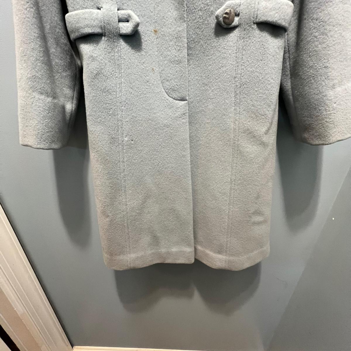 This vintage wool F.W. Fischer coat is a Junior size 10 and a baby blue color with a fur or fur like collar. It comes with a matching hat. Both jacket and hat have a silk lining. A few issues on both such as small holes and a few stains also on the jacket. A new with tags Neiman Marcus cashmere scarf, a faux fur scarf and a corduroy Stetson hat complete this lot.