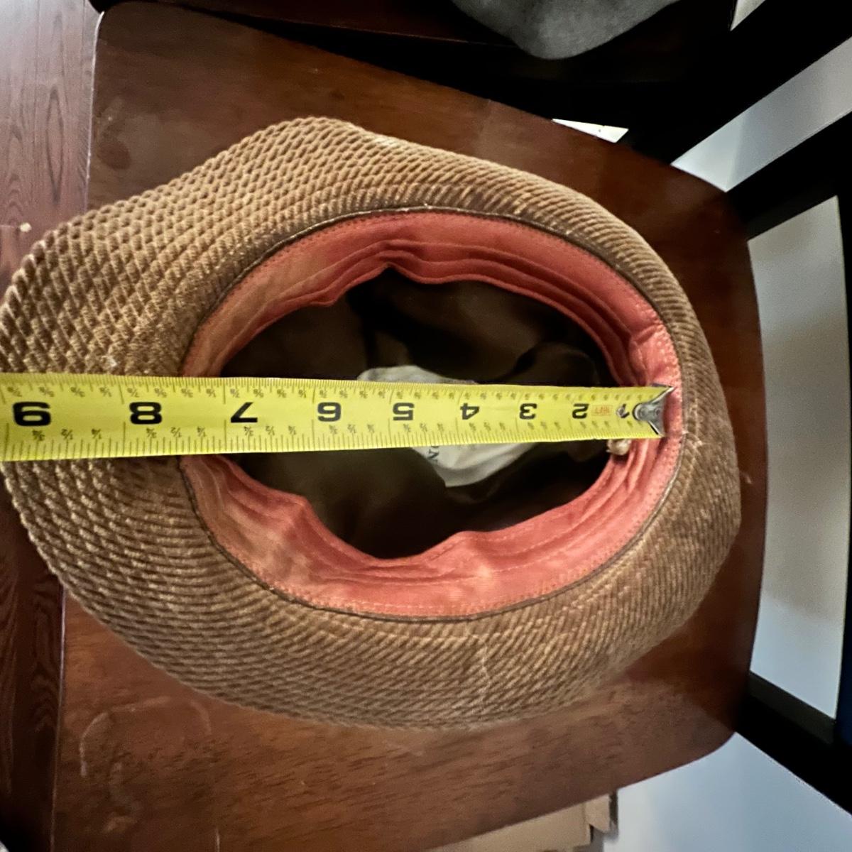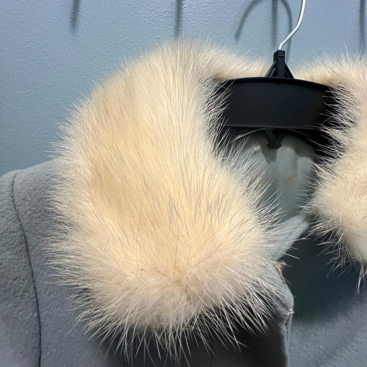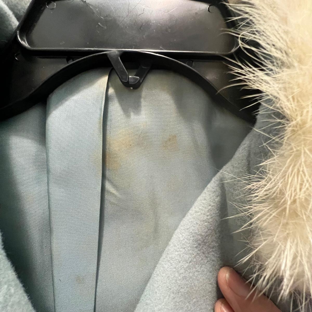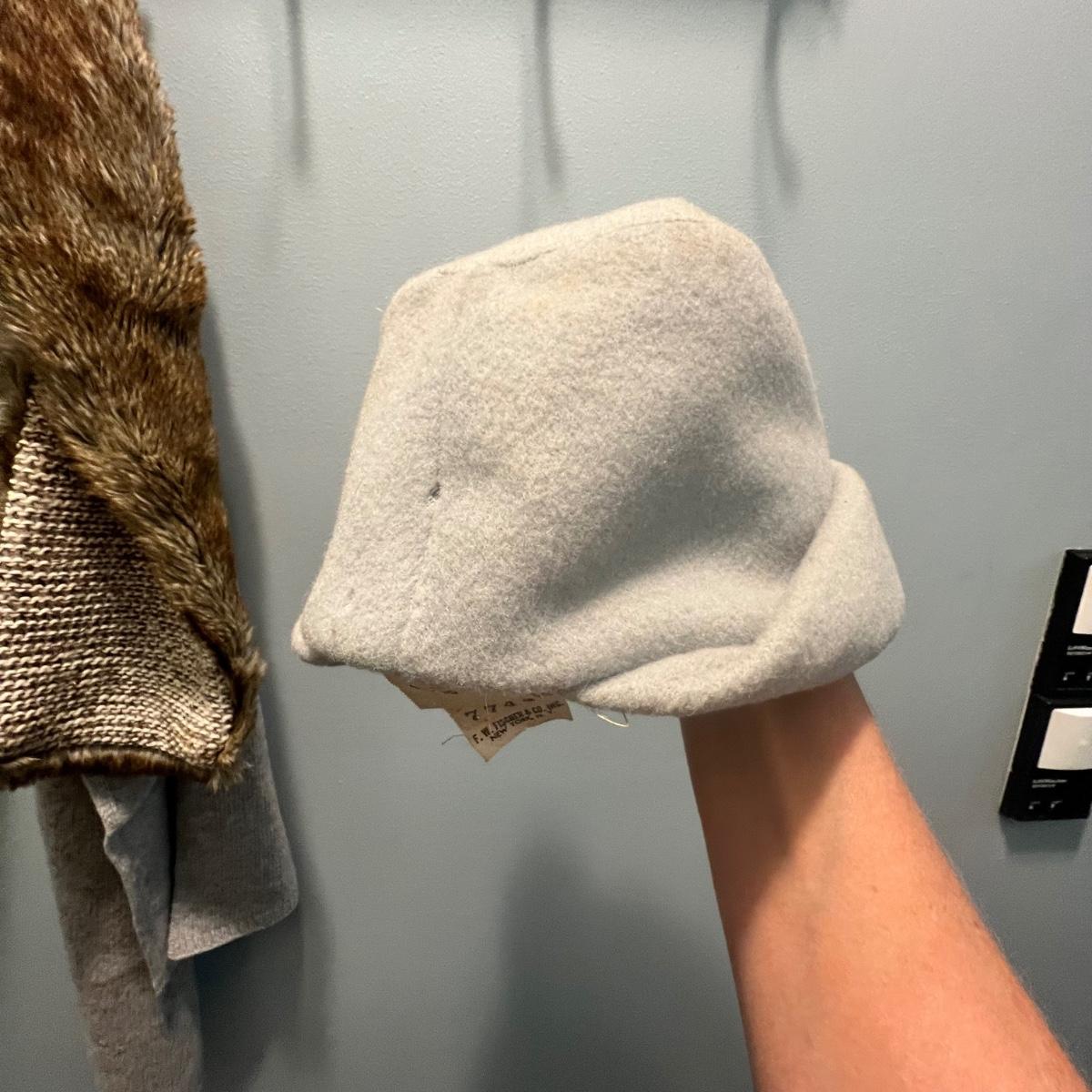 This vintage wool F.W. Fischer coat is a Junior size 10 and a baby blue color with a fur or fur like collar. It comes with a matching hat. Both jacket and hat have a silk lining. A few issues on both such as small holes and a few stains also on the jacket. A new with tags Neiman Marcus cashmere scarf, a faux fur scarf and a corduroy Stetson hat complete this lot.