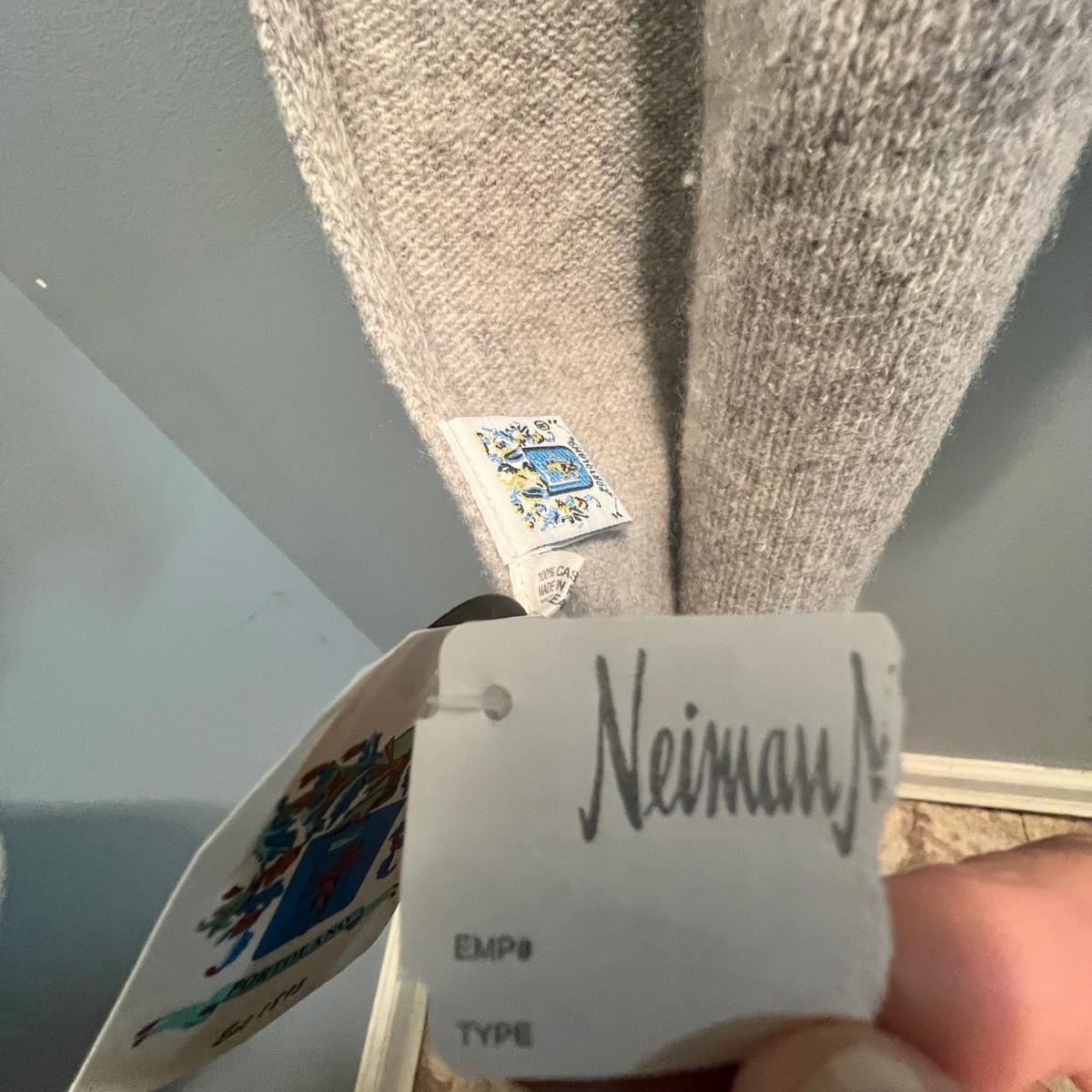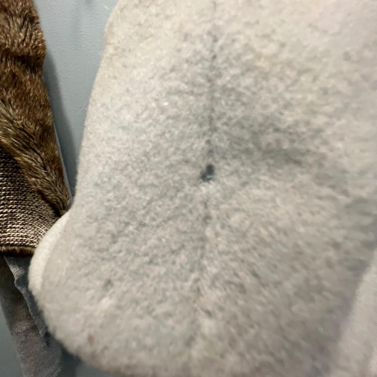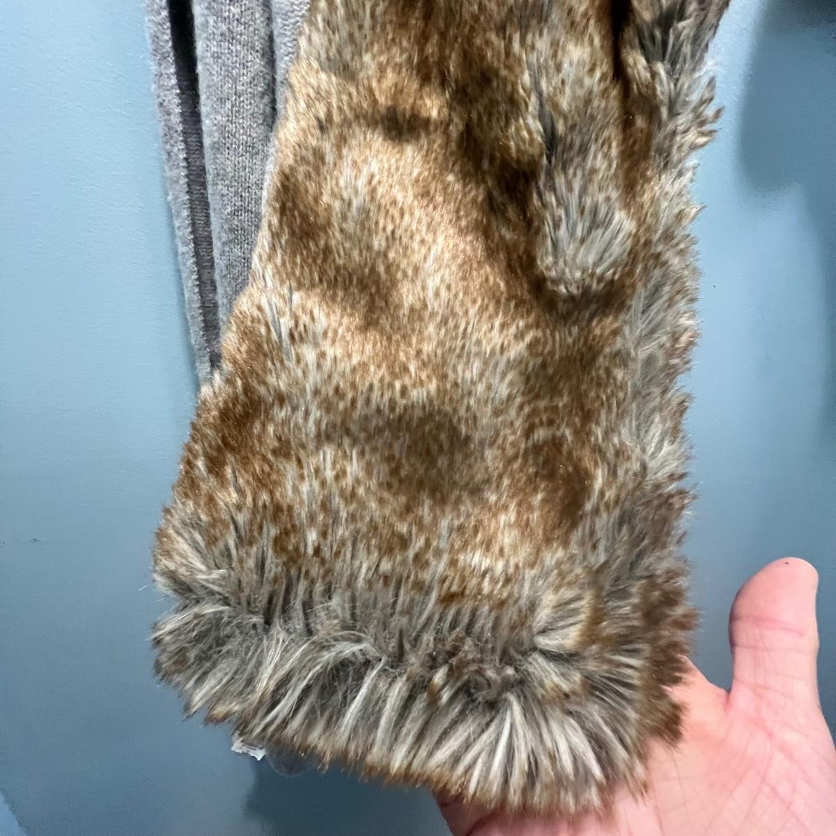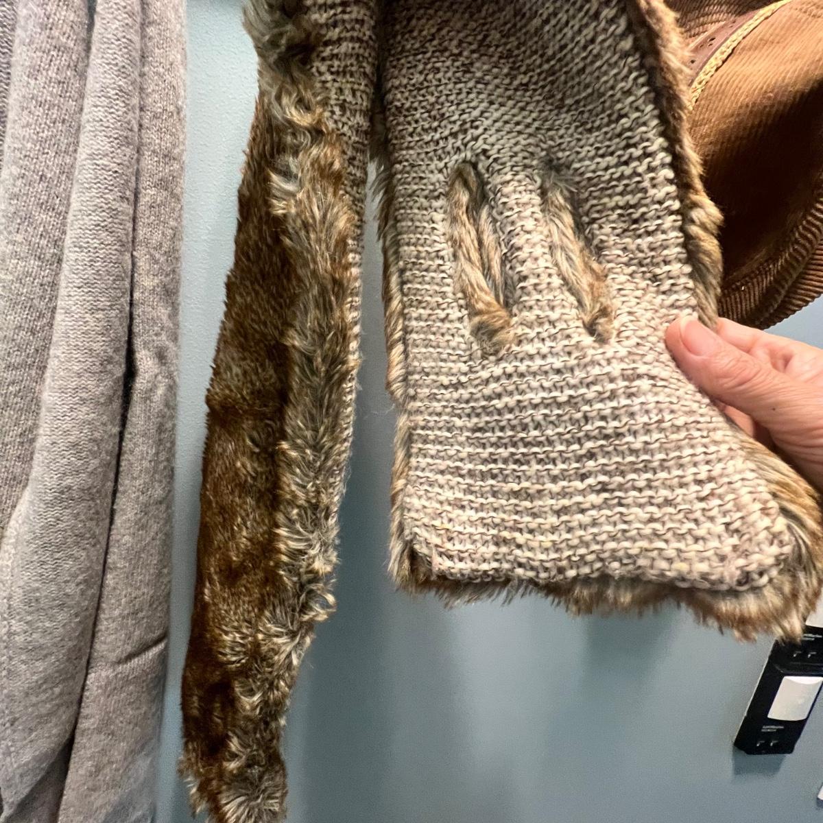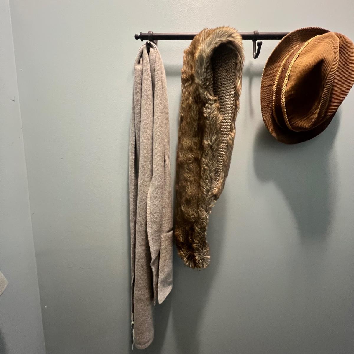This vintage wool F.W. Fischer coat is a Junior size 10 and a baby blue color with a fur or fur like collar. It comes with a matching hat. Both jacket and hat have a silk lining. A few issues on both such as small holes and a few stains also on the jacket. A new with tags Neiman Marcus cashmere scarf, a faux fur scarf and a corduroy Stetson hat complete this lot.