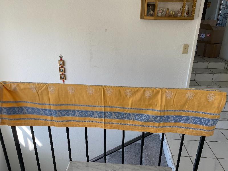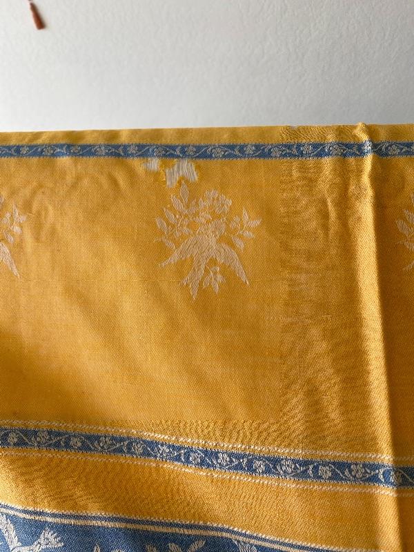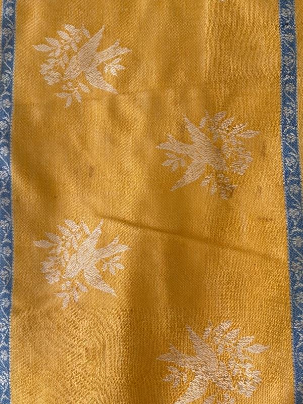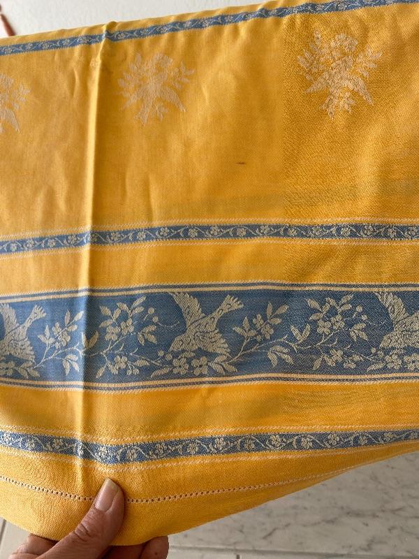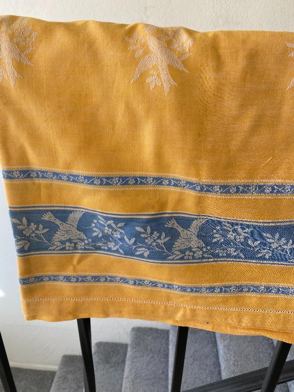 Vintage blue and yellow table cloth. Has a white stitched bird pattern on it. About 5'x4'. It does have some small spots.