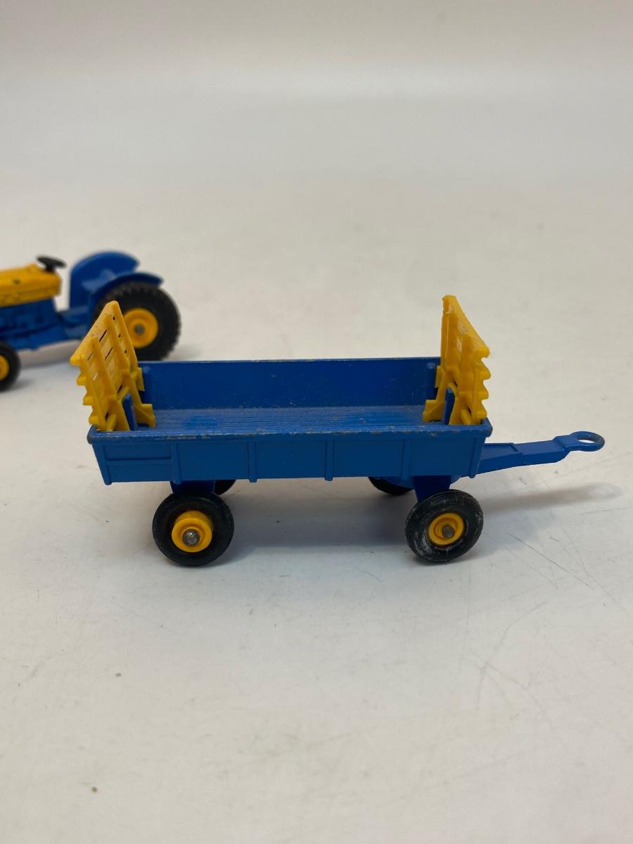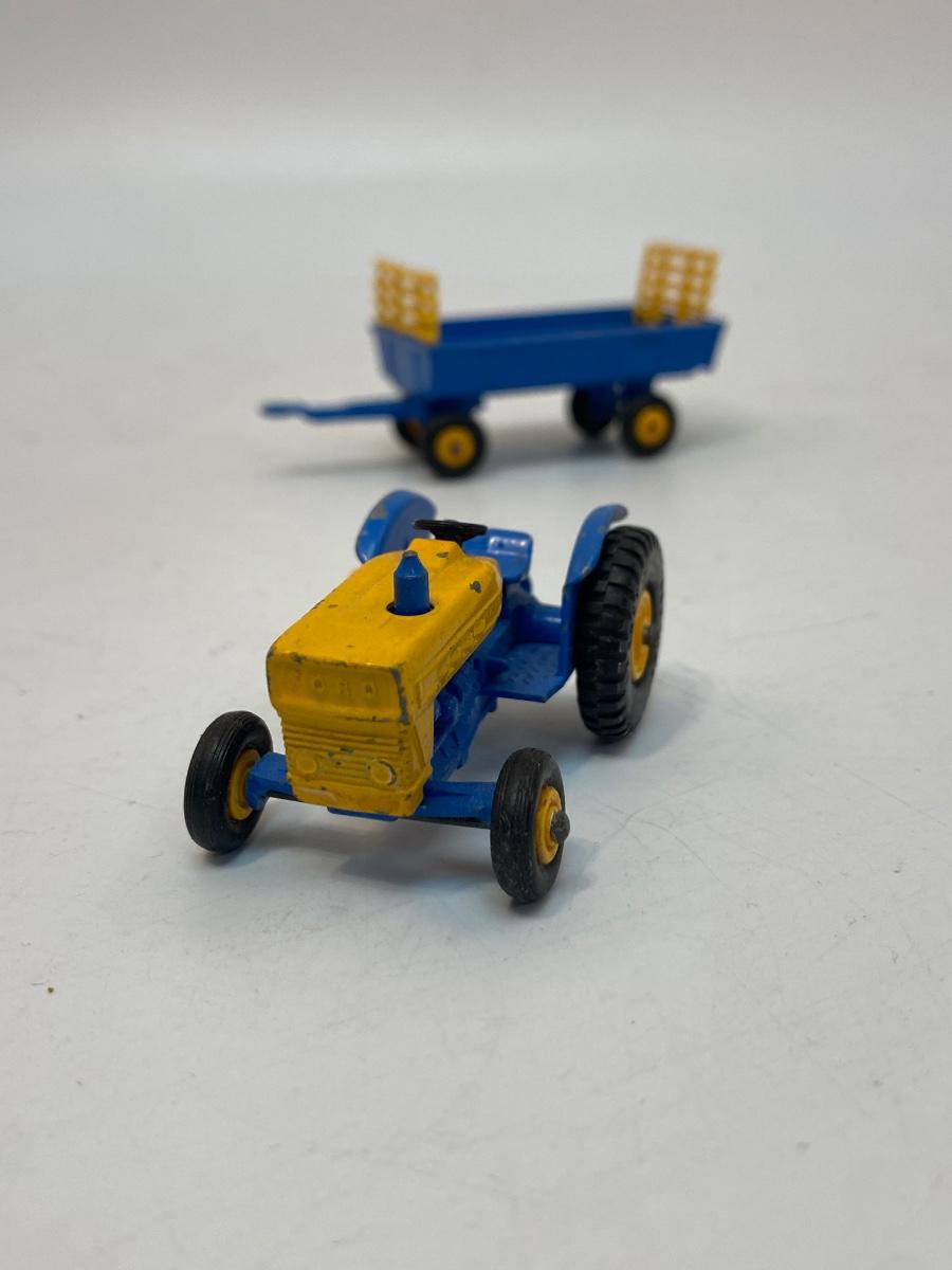 Vintage Blue & Yellow Lesney Matchbox Diecast Ford Tractor #39 w Hay Trailer #40. In good vintage condition except the tractor is missing a rear tire.