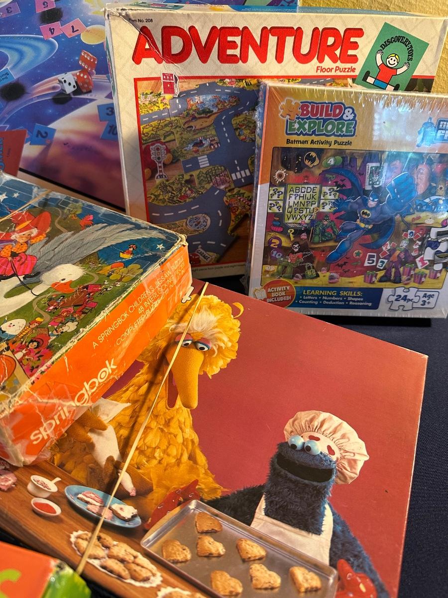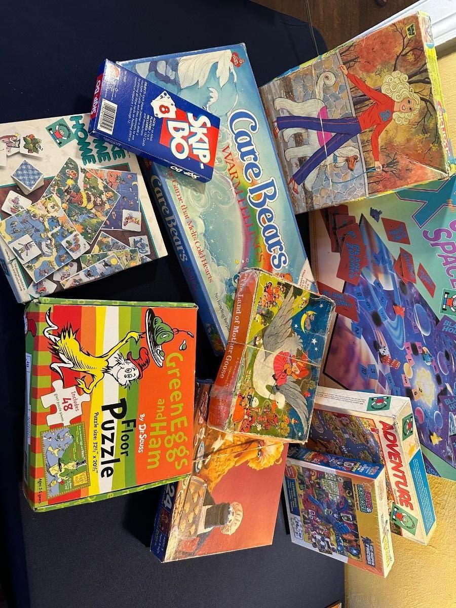 BOARD GAMES ICNLUDING CARE BEARS, DR SEUSS PUZZLE, SKIP BO AND MORE AS PICTURED
