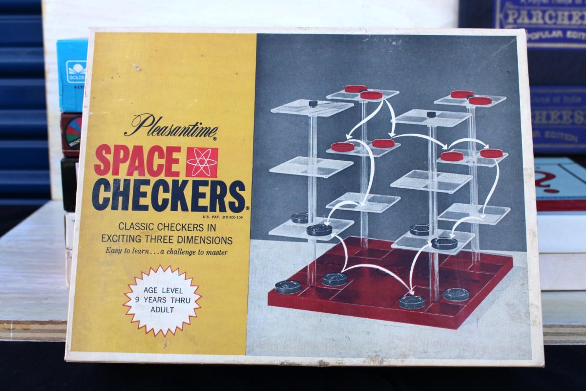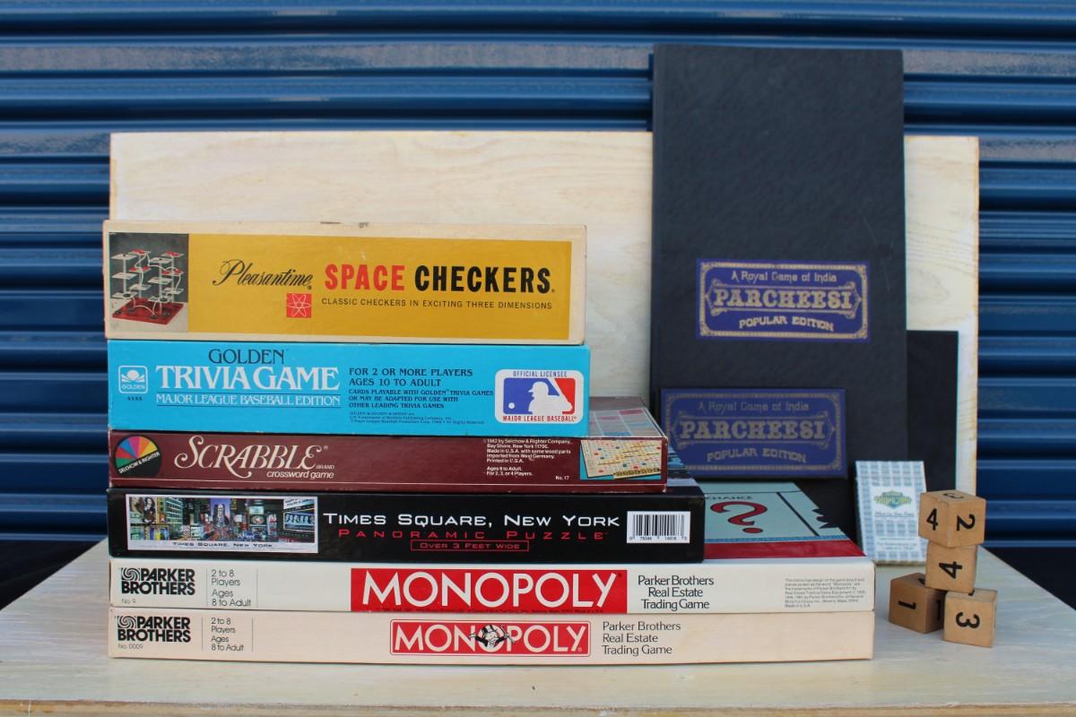 Vintage board games. Good condition.  Space Checkers, Parcheesi, Golden Trivia Game and Times Square, NY Puzzle